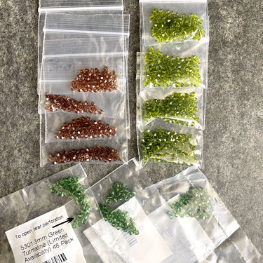 11 bags of 48 or 96/bag of 3mm bicone crystal beads for a total of 720 beads. Colors include: 4 bags/96 beads each olivine (not counted, tested by weight), 4 bags smoky topaz, 3 bags turmaline.