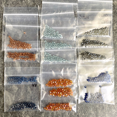 15 bags of 48/bag of 3mm bicone crystal beads for a total of 720 beads. Colors include: 3 bags iridescent copper, 2 bags dark sapphire, 2 bags montanaS, 3 bags smoky gray, 3 bags indian sapphire, 2 bags warm light brown.