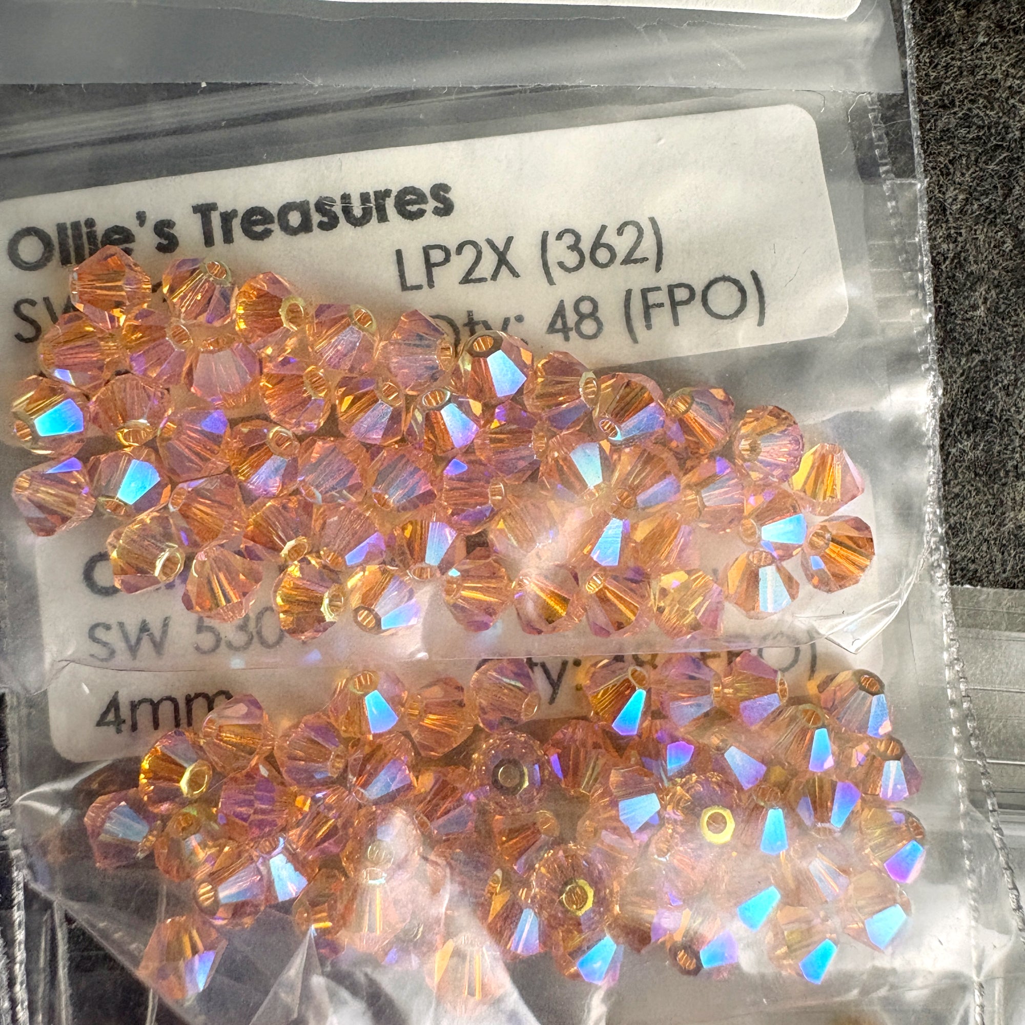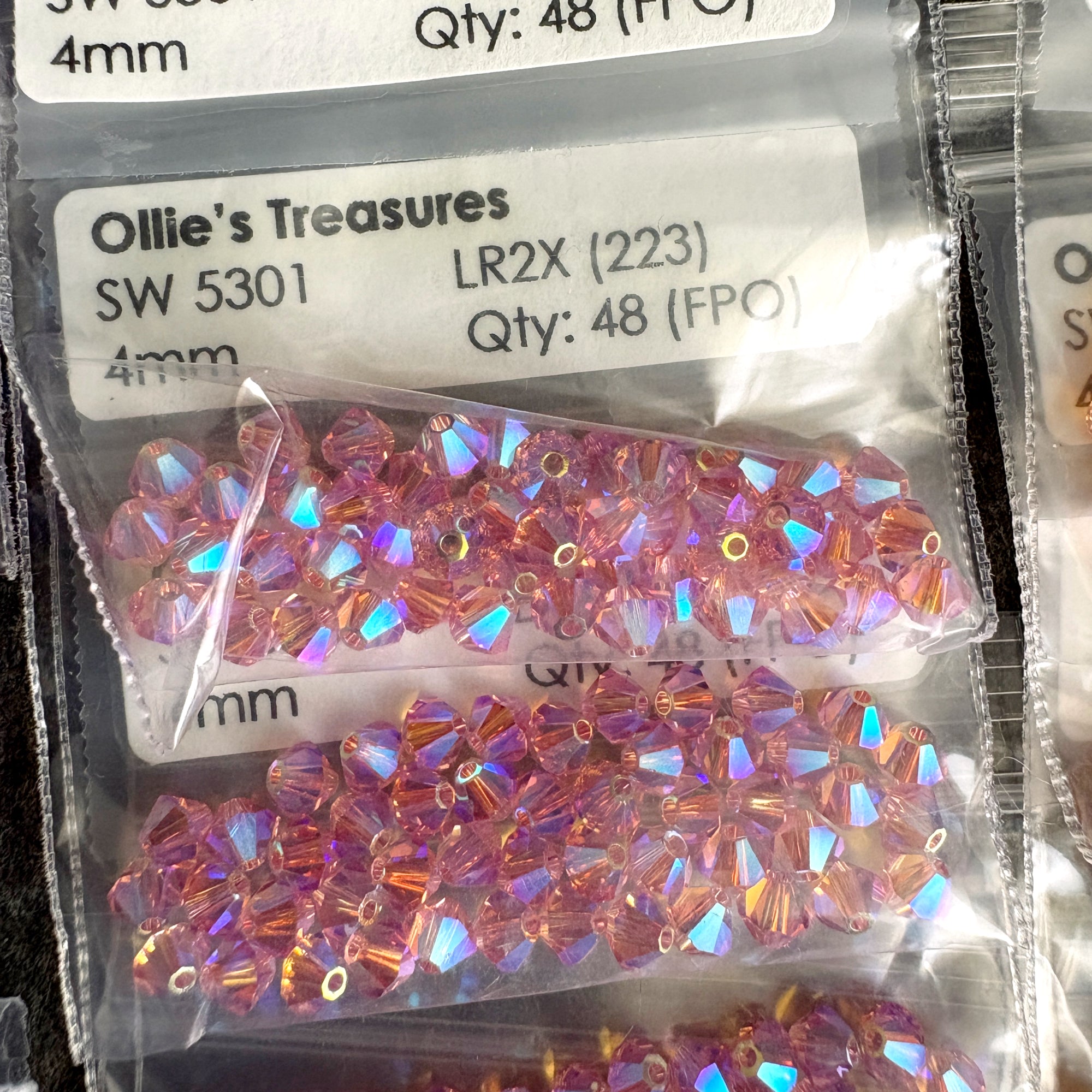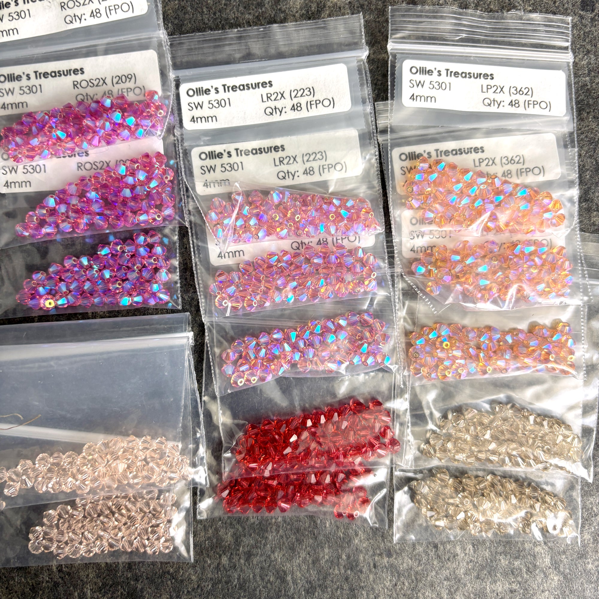 Lot of 15 bags of Swarovski 4mm bicone crystal beads with 48/bag for a total of 720 beads. Colors include: