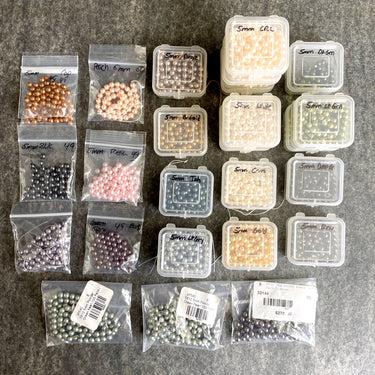 5mm round crystal pearls in 12 colors. Differing amounts of beads in each container, we estimate a full plastic box is between 150-200 beads. Total 16 containers, some full, some partial. Some are strung, some are loose. 11 bags (49-50 beads) additional 5mm round crystal pearls.