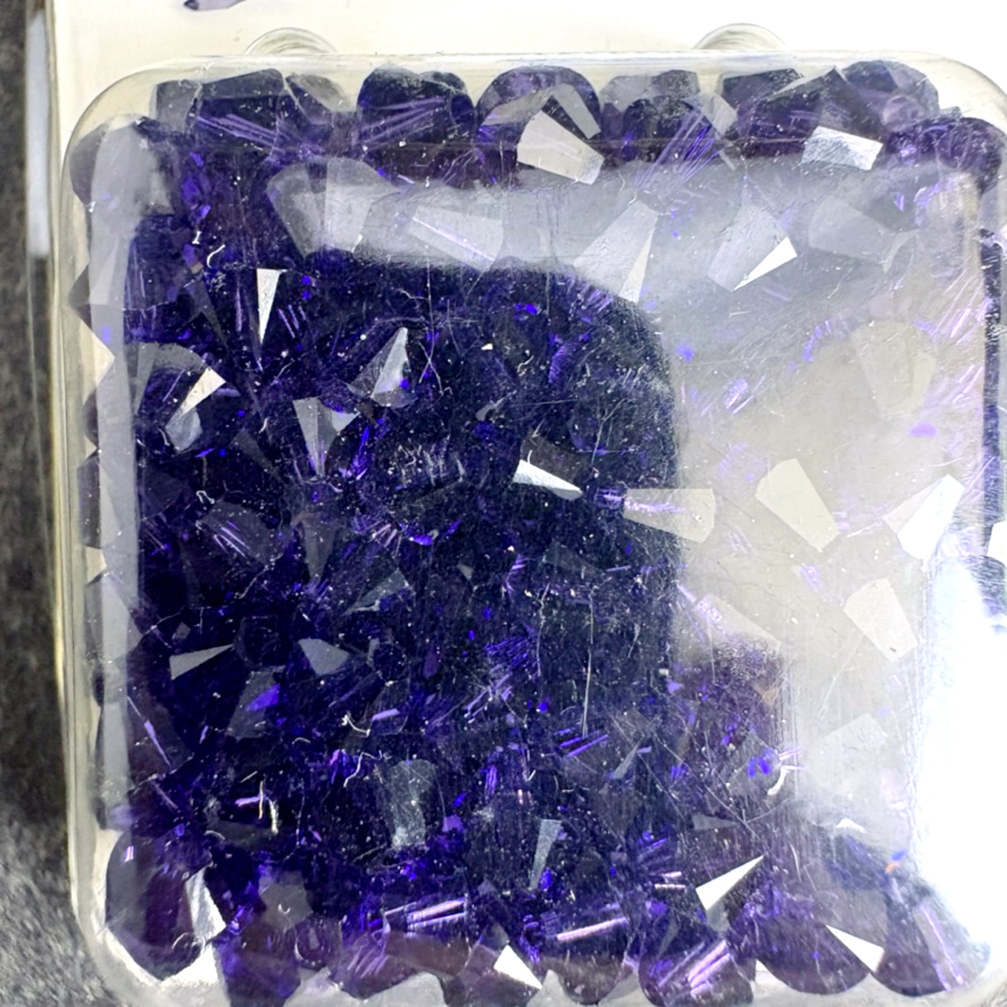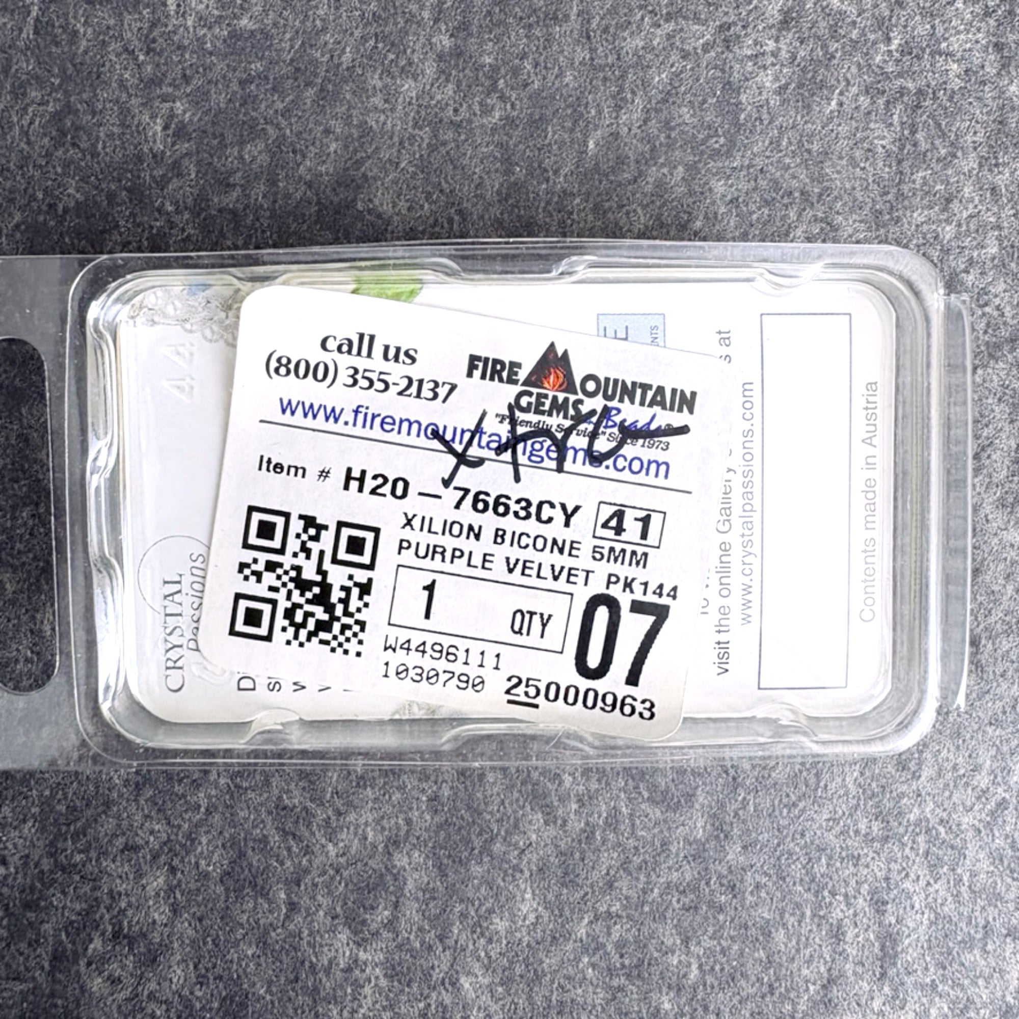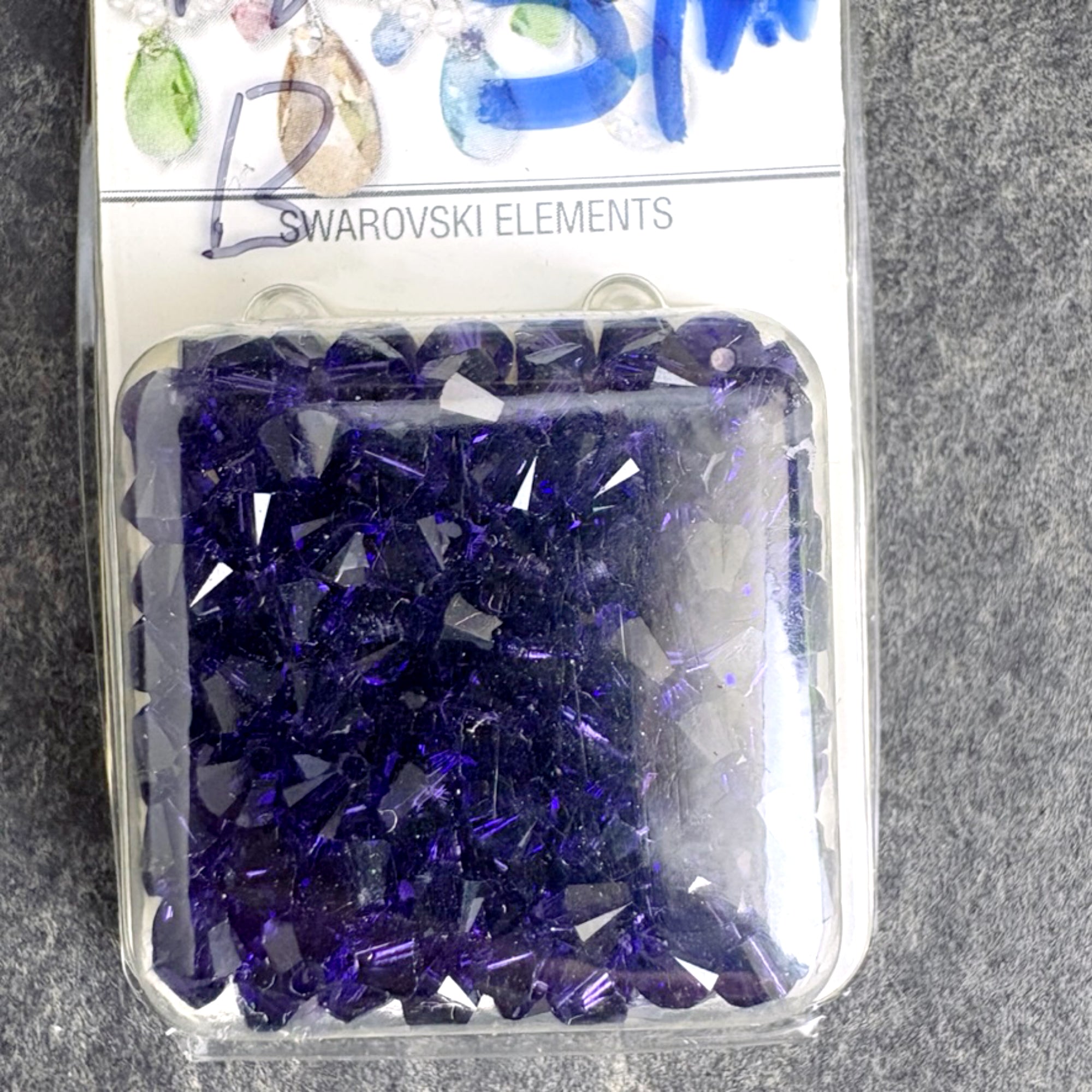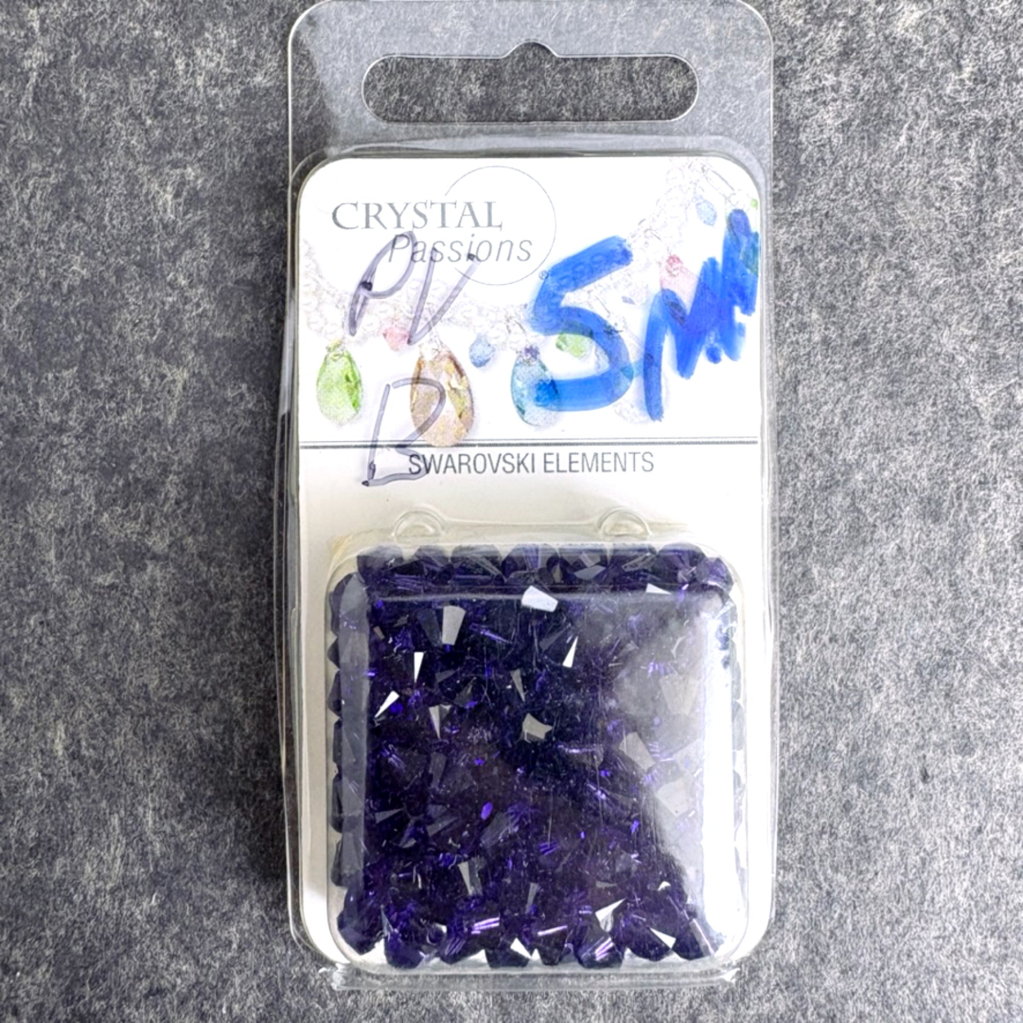 Genuine Swarovski Elements 5mm bicone XILION crystal beads in purple velve, a deep dark purple with blue undertones. Factory package of 144 beads from Fire Mountain Gems.