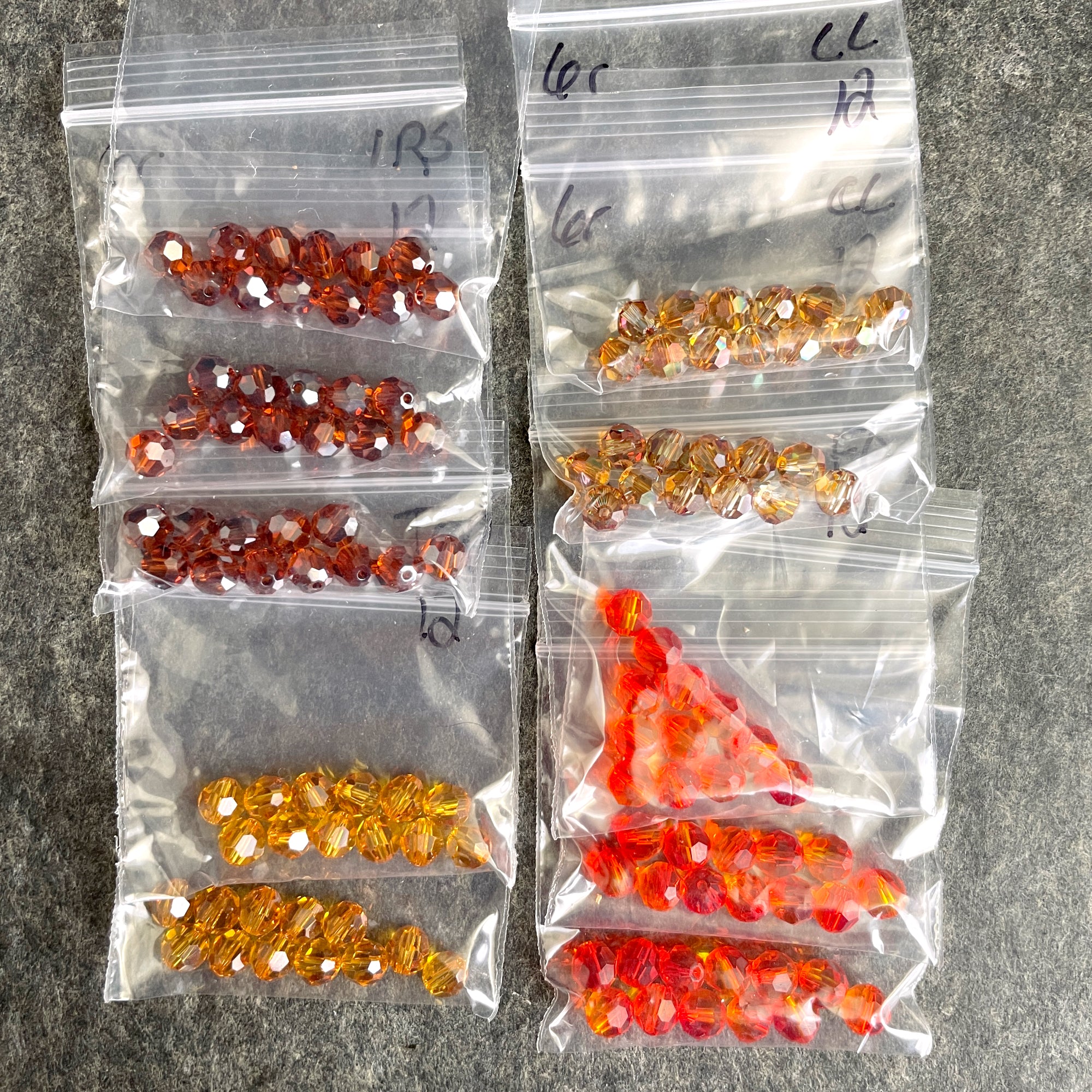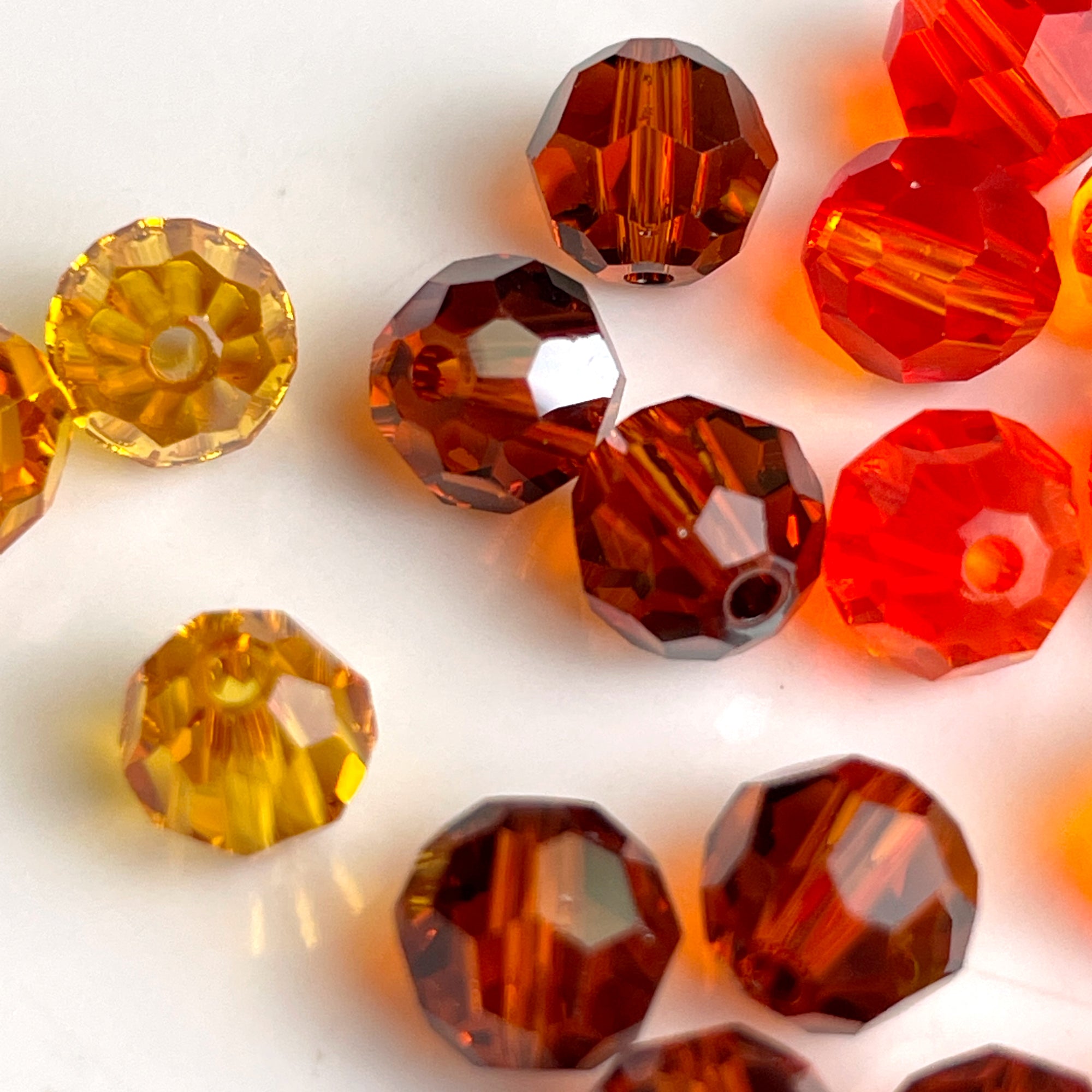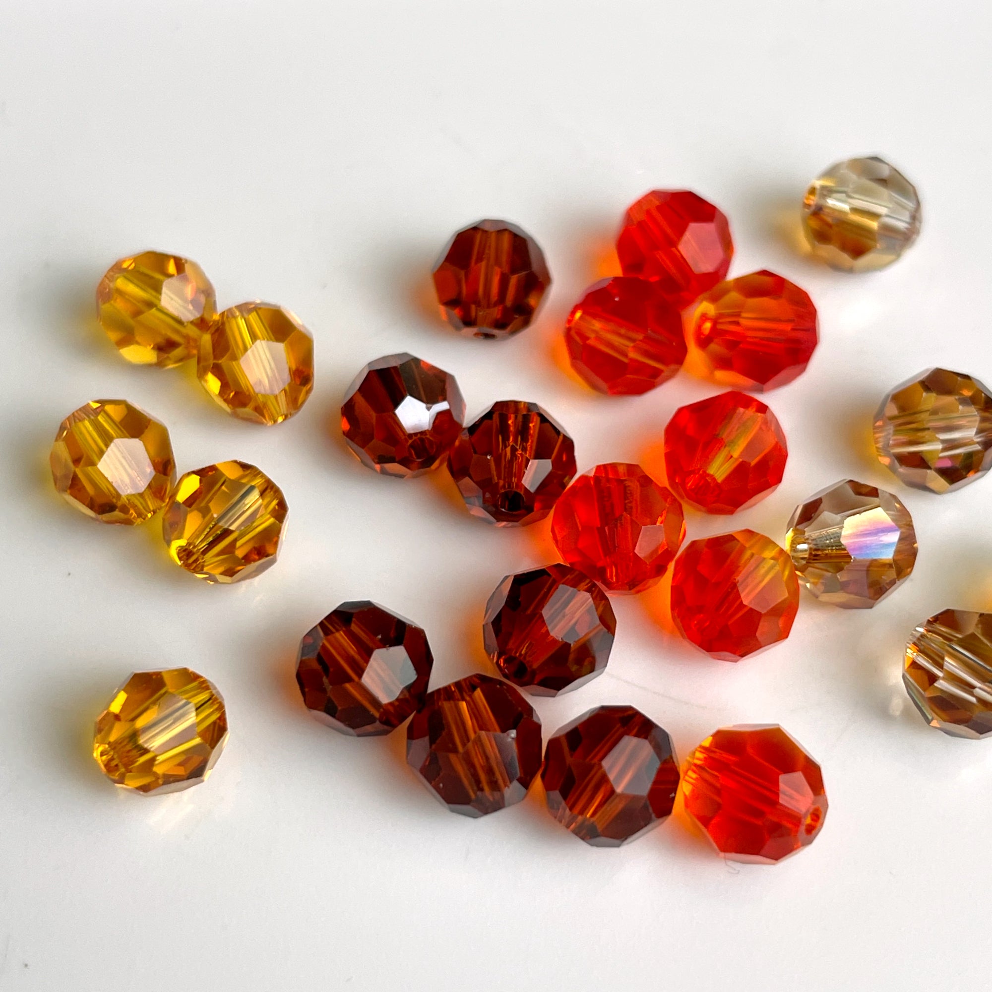 10 bags of 12/bag of 6mm round crystal beads in autumn colors, plus 3 bonus beads, for a total of 123 beads. 2 bags iridescent copper, 3 bags fire opal, 2 bags topaz and 3 bags of a warm brown.
