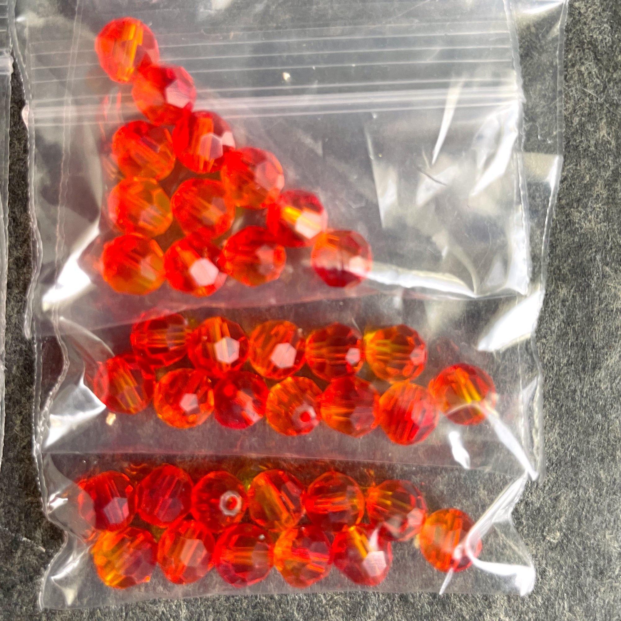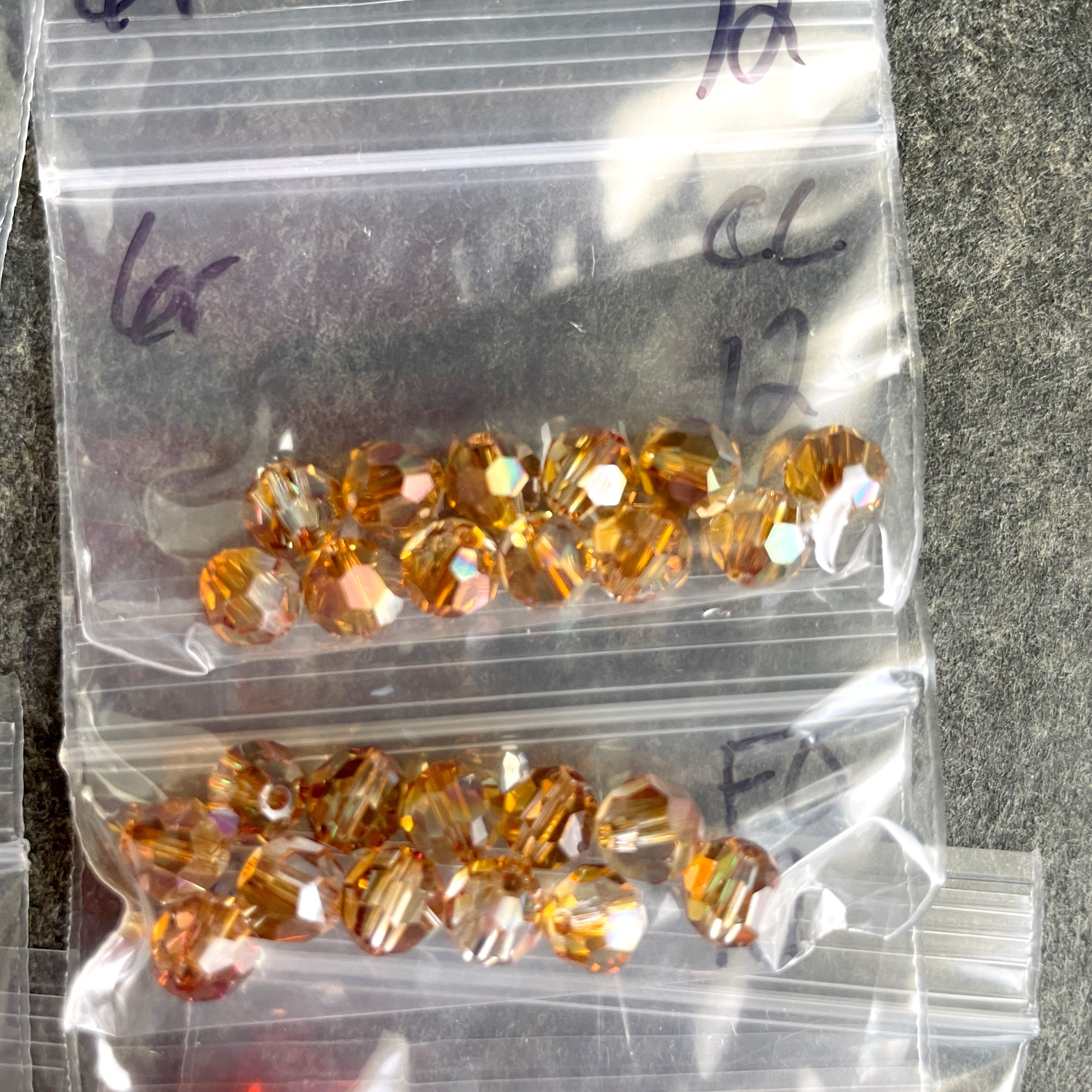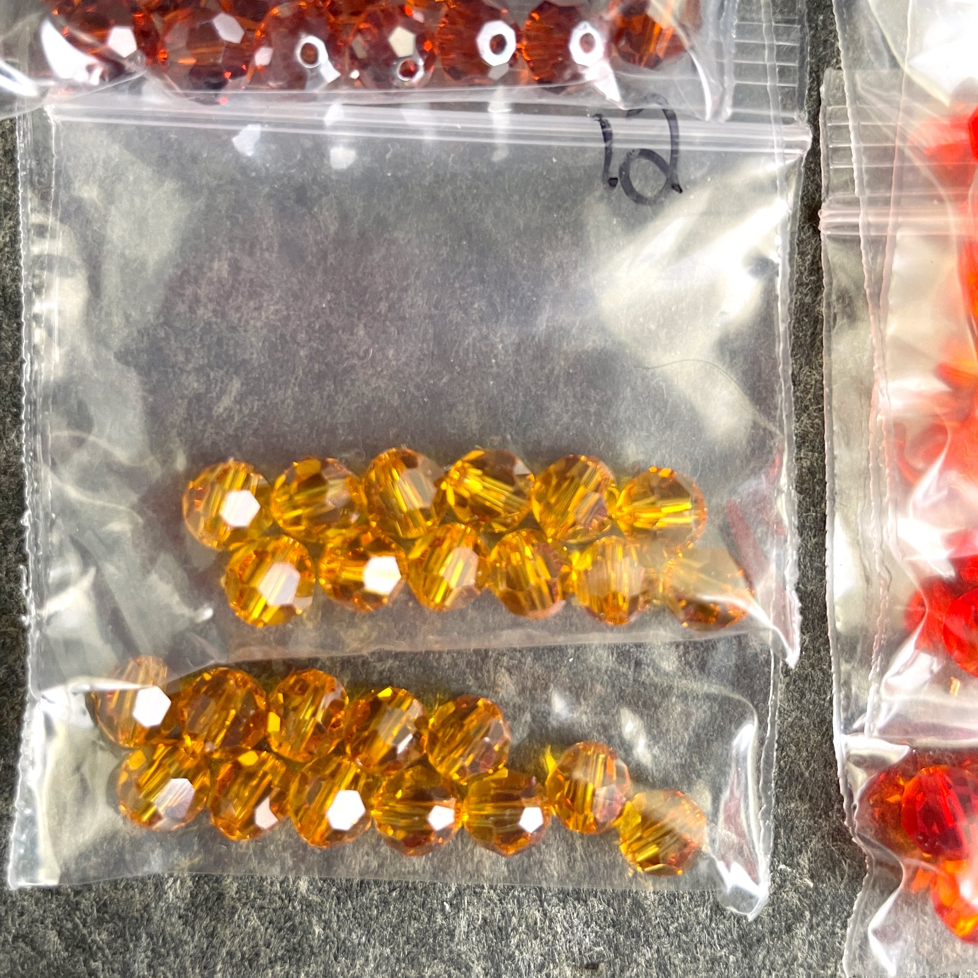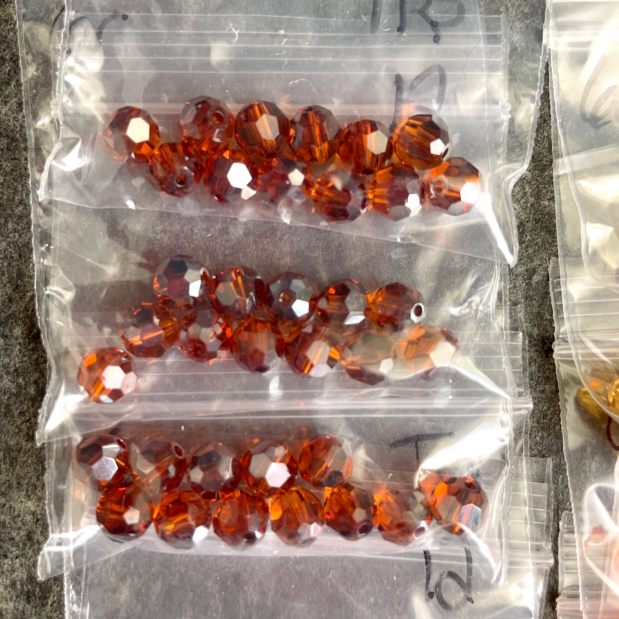 10 bags of 12/bag of 6mm round crystal beads in autumn colors, plus 3 bonus beads, for a total of 123 beads. 2 bags iridescent copper, 3 bags fire opal, 2 bags topaz and 3 bags of a warm brown.