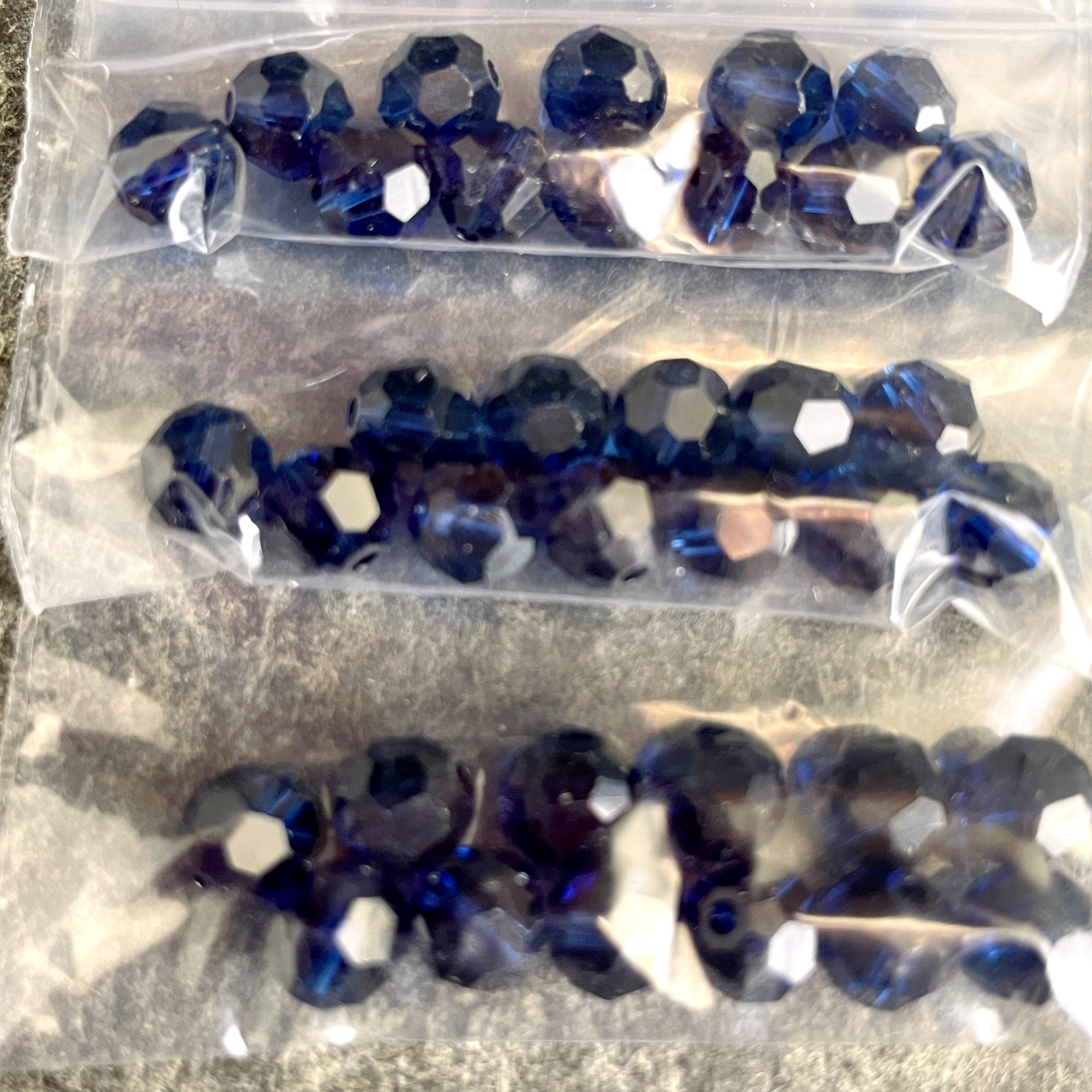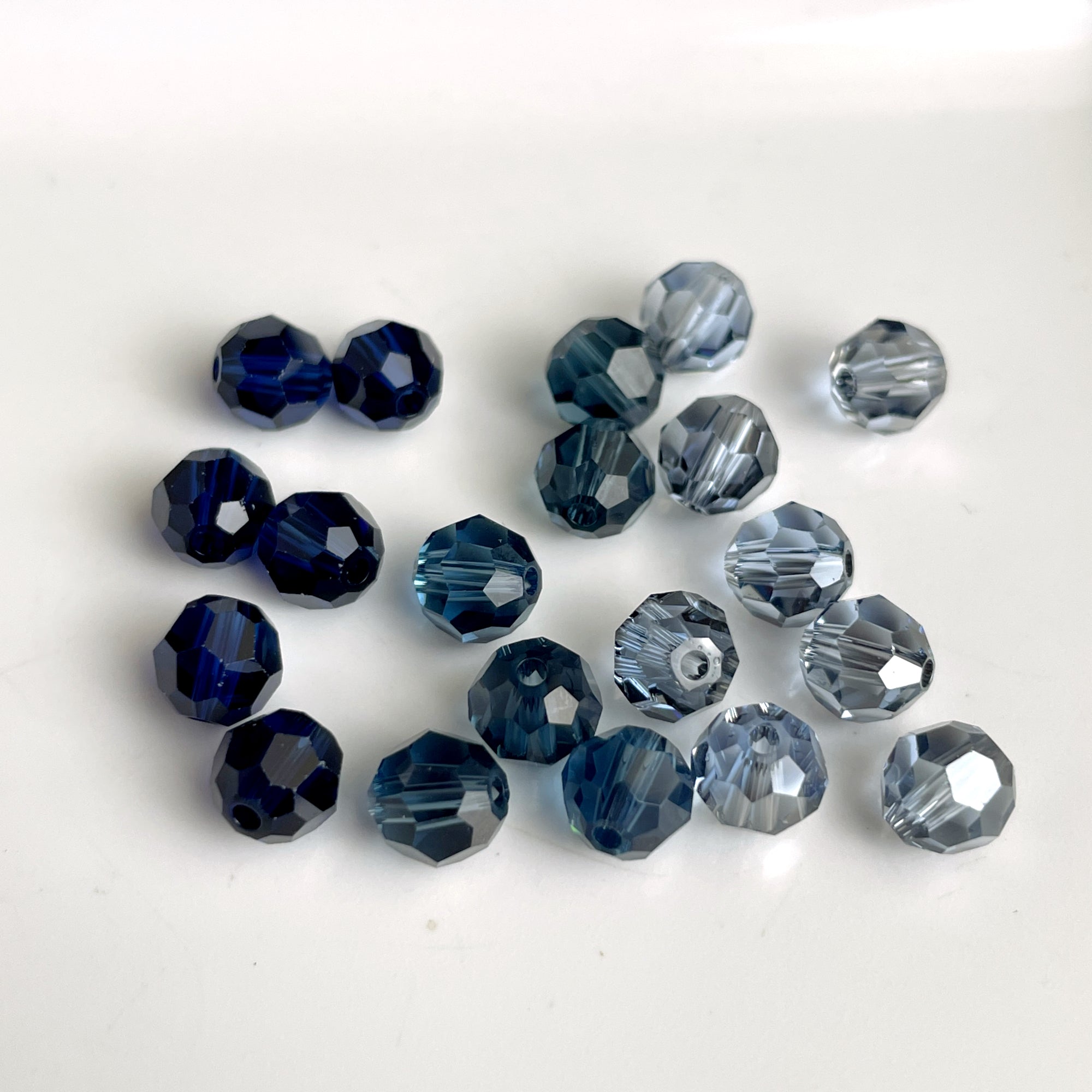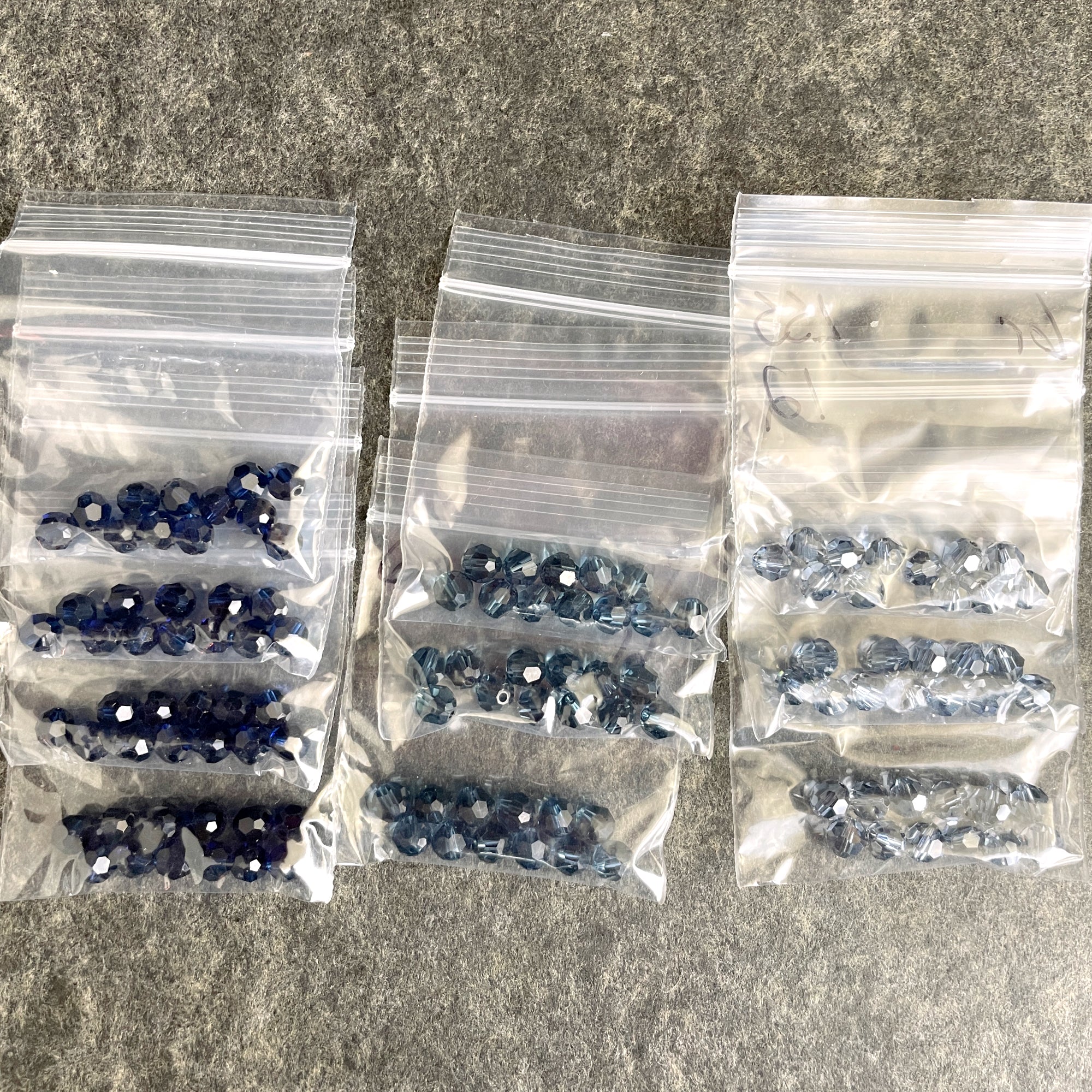 10 bags of 12/bag of 6mm round crystal beads in deeper blues for a total of 120 beads. 3 bags of montana, 4 bags dark blue, 3 light gray blue.