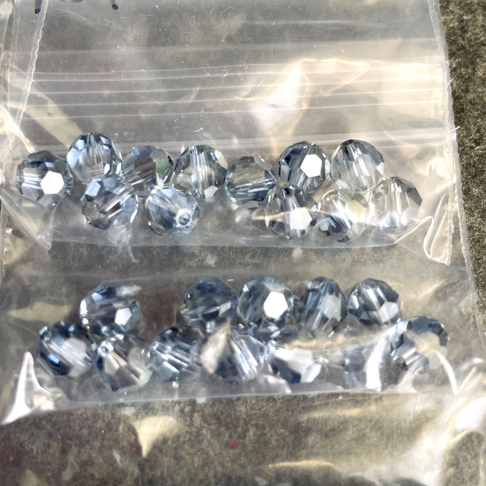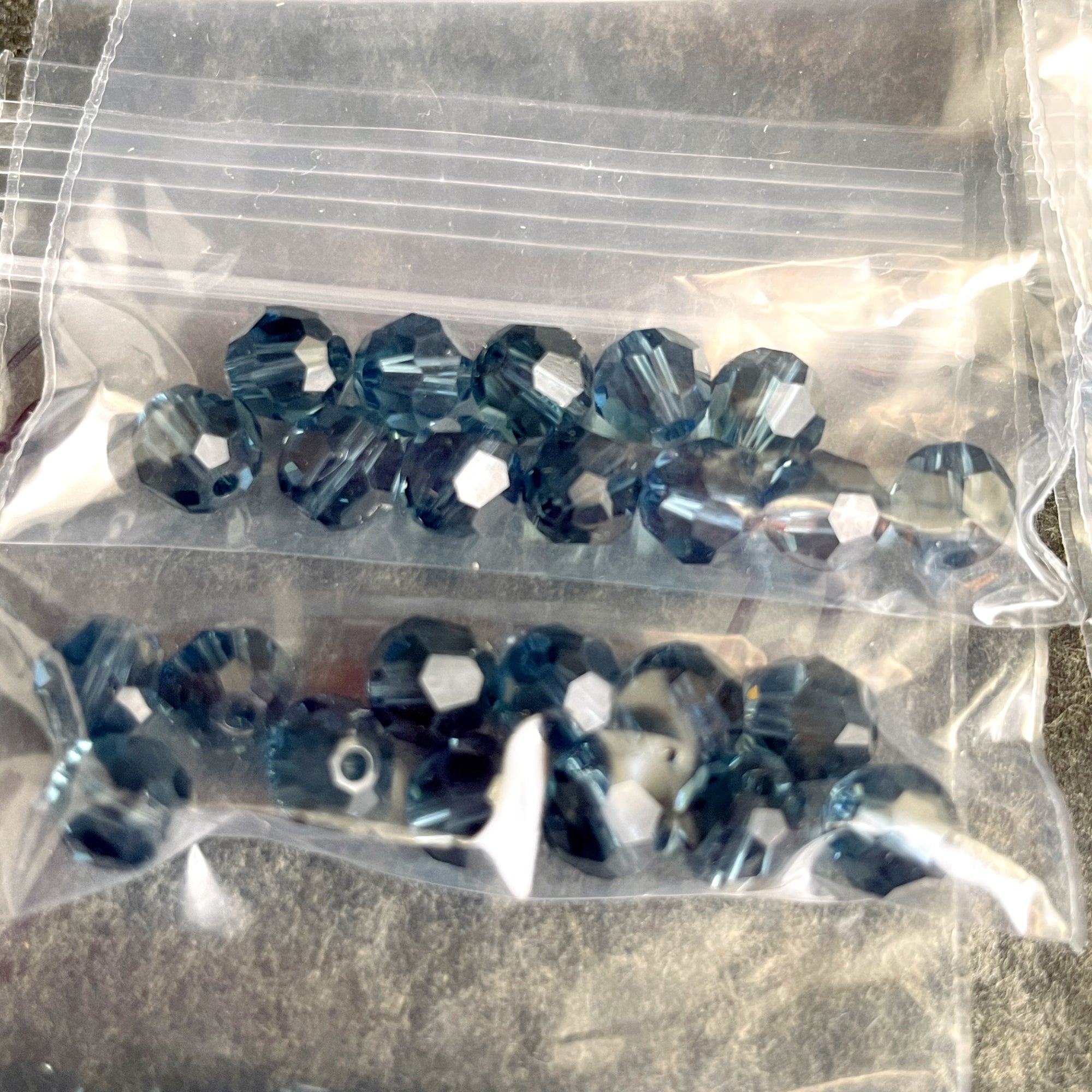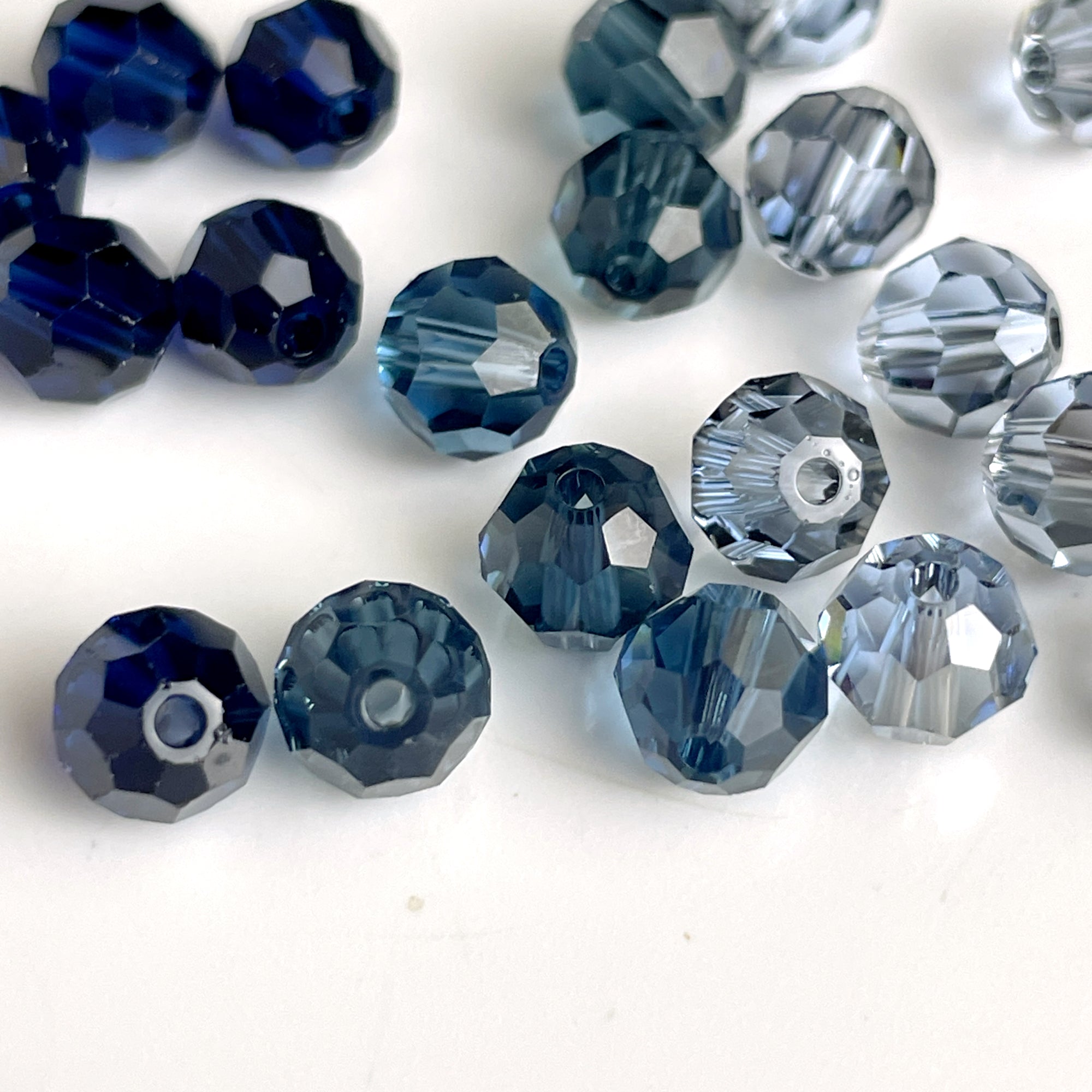 10 bags of 12/bag of 6mm round crystal beads in deeper blues for a total of 120 beads. 3 bags of montana, 4 bags dark blue, 3 light gray blue.