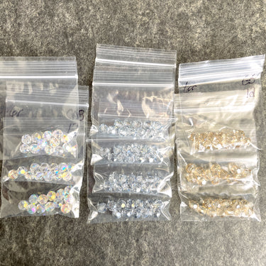 10 bags of 12/bag of 6mm round crystal beads in mixed lights for a total of 120 beads. 3 bags of golden shadow, 4 bags of clear bluish crystal and 3 bags of crystal aurora borealis.