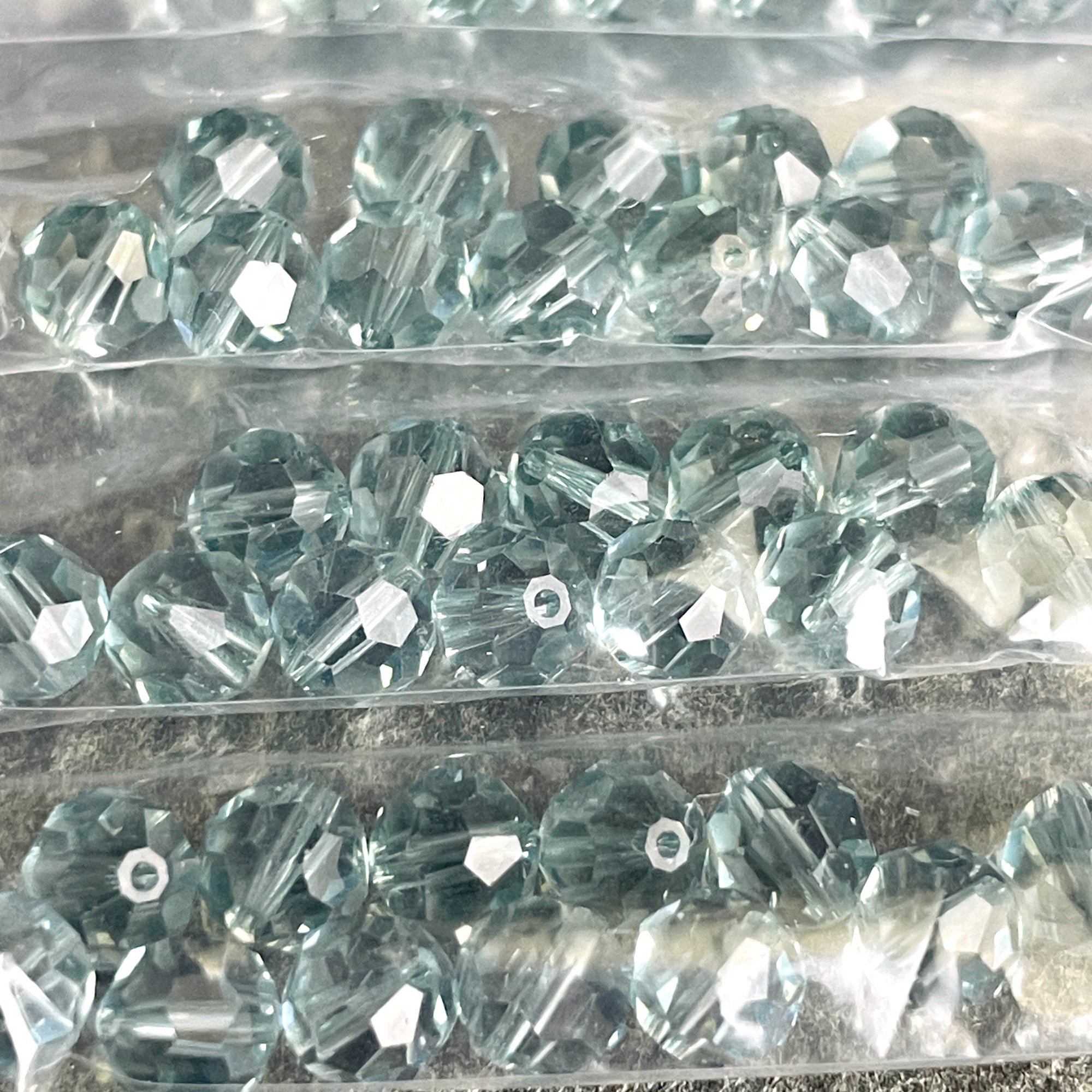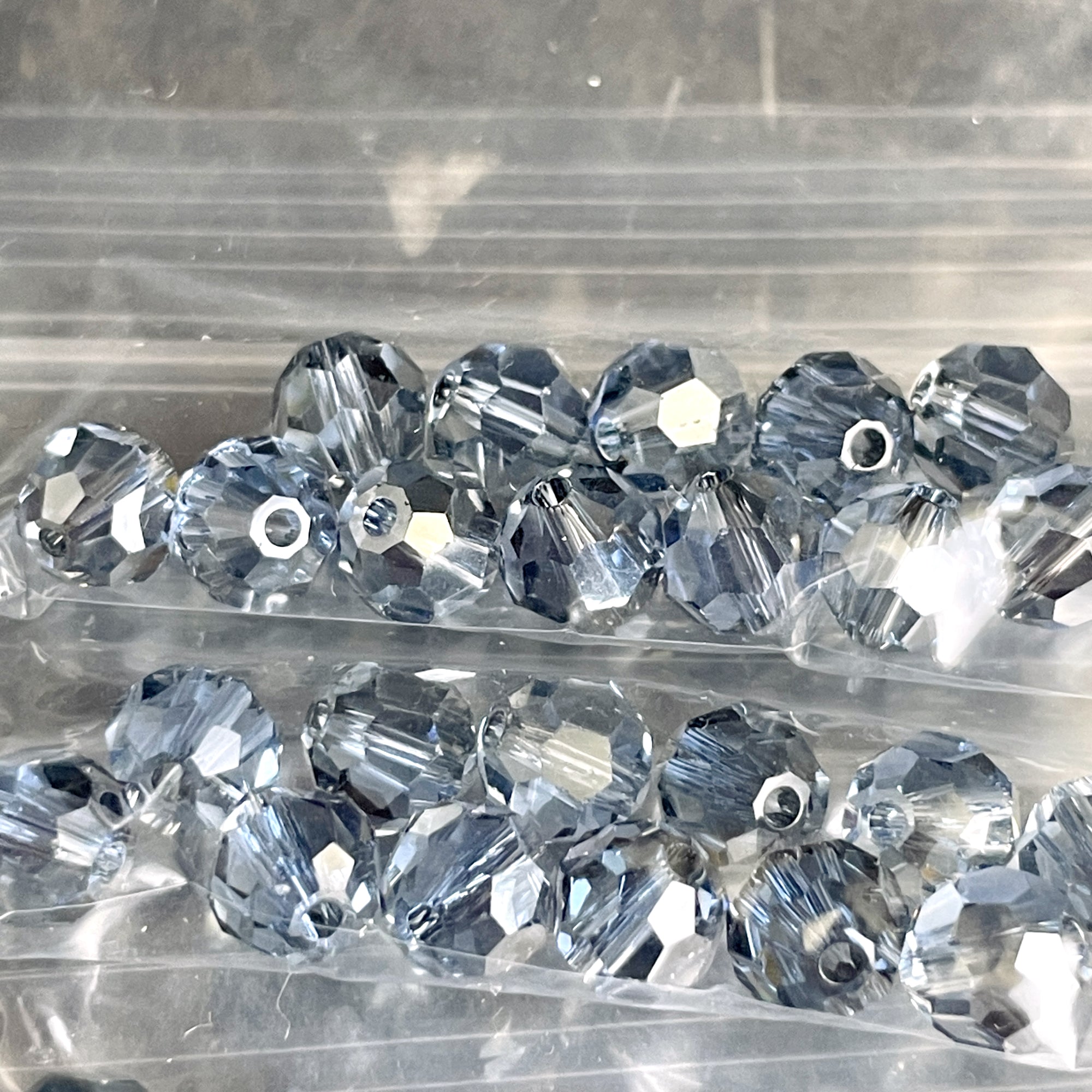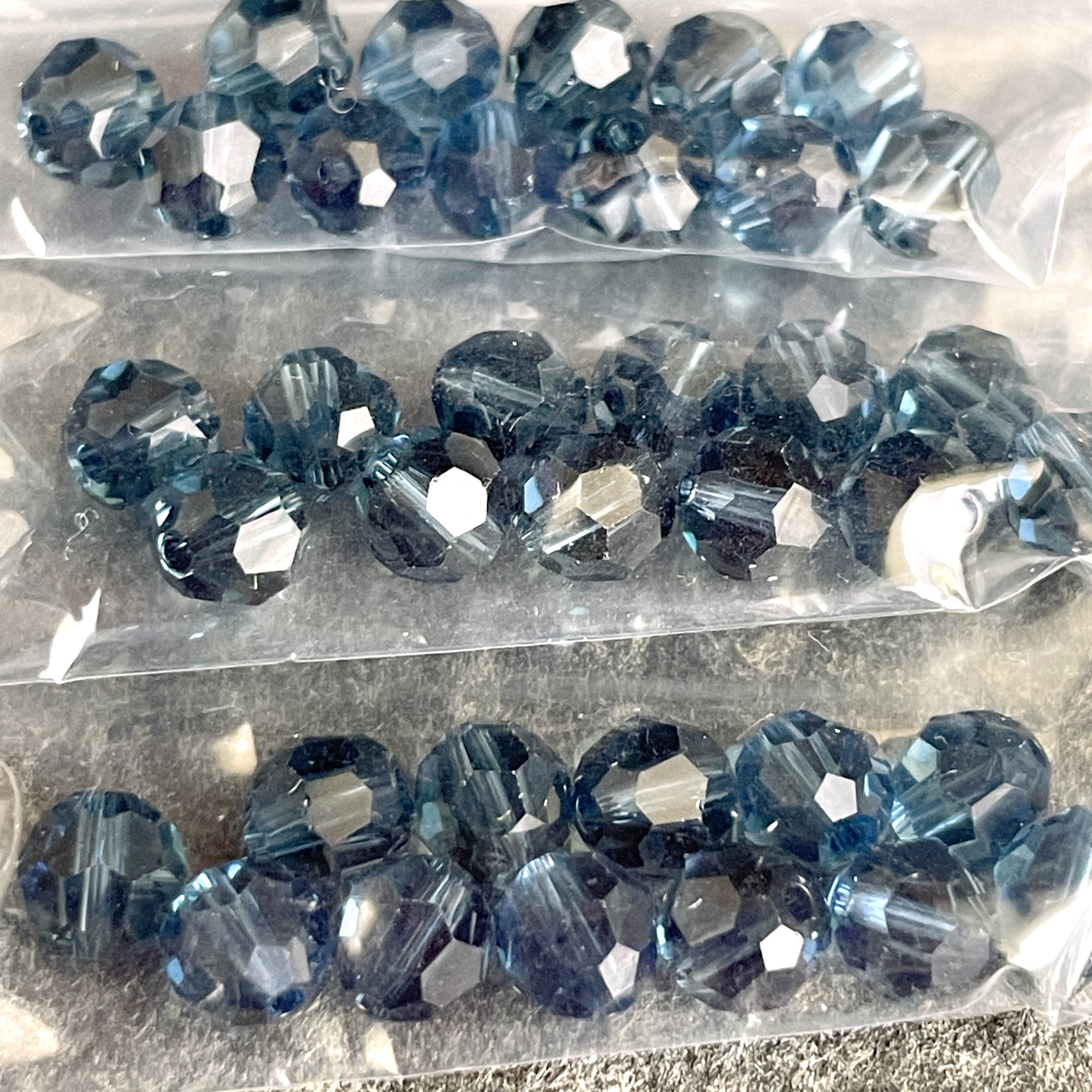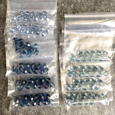 10 bags of 12/bag of 6mm round crystal beads in smoky blues plus a bonus of 8 beads, for a total of 128 beads.