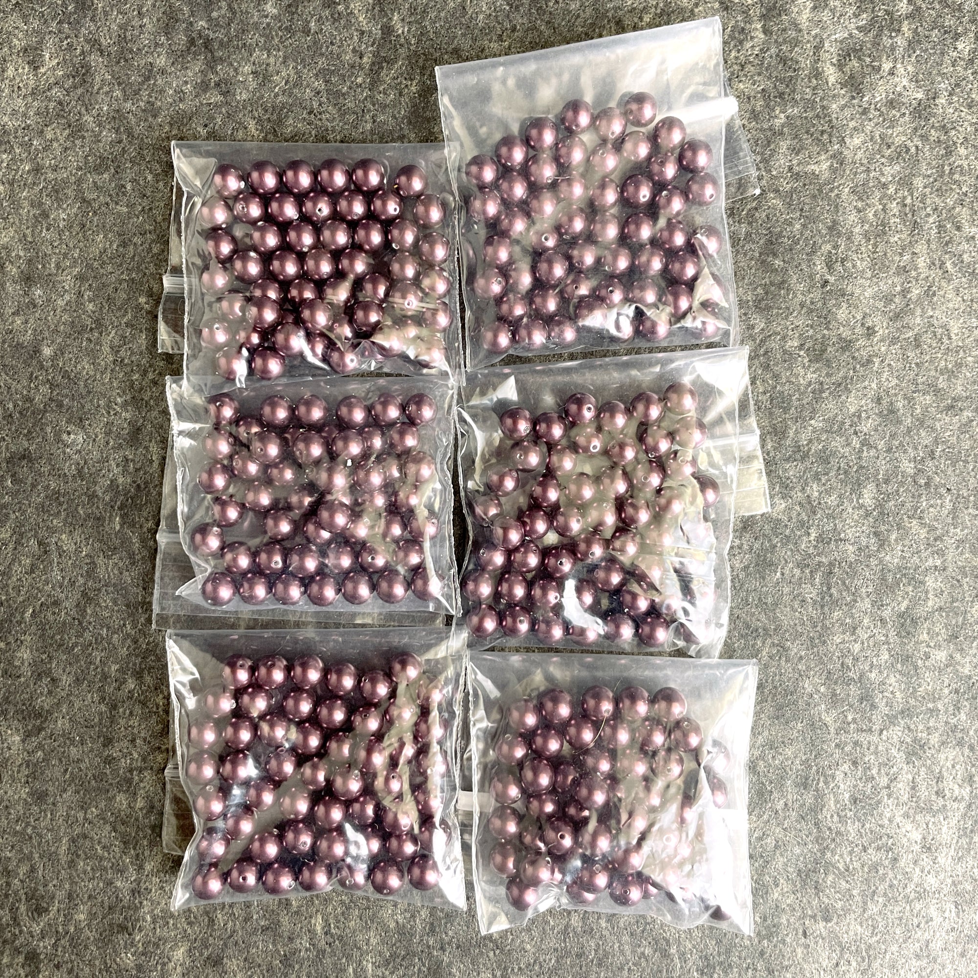 6 bags of 50/bag of 6mm round crystal pearls in burgundy for a total of 300 pearl beads.