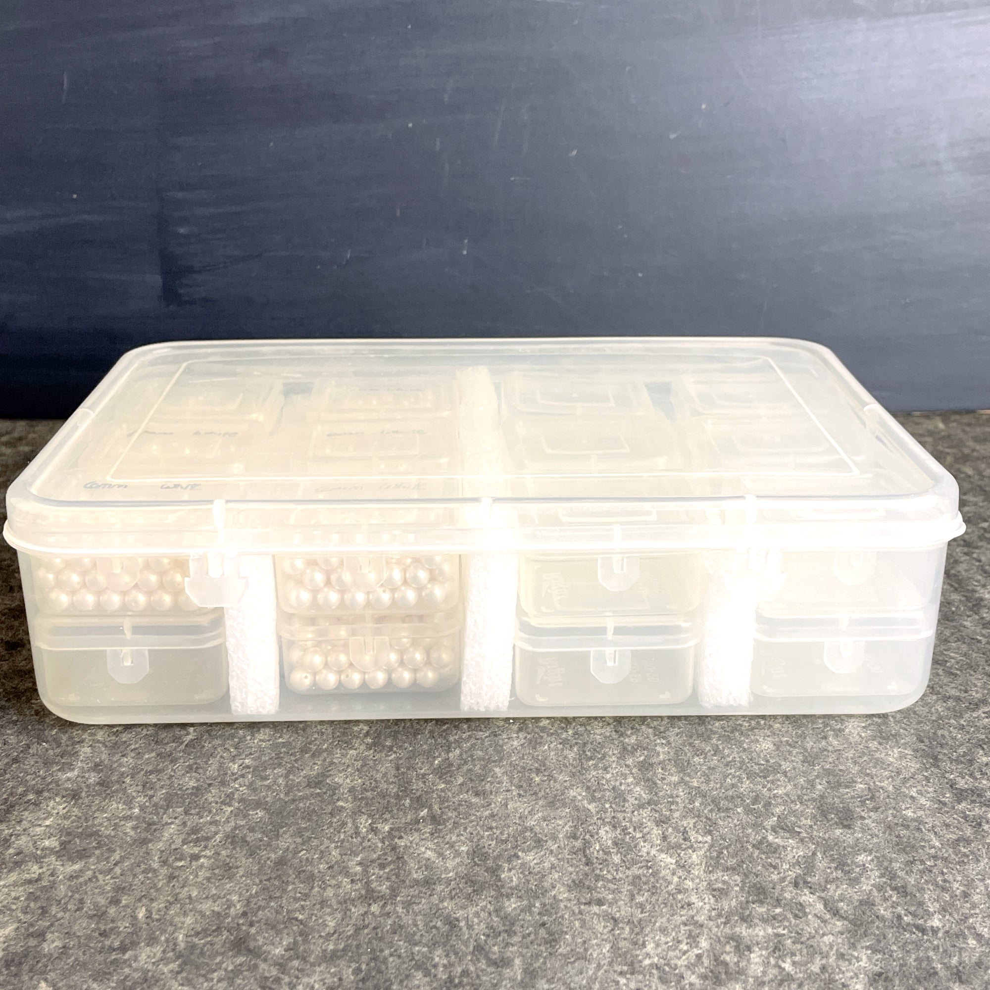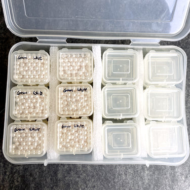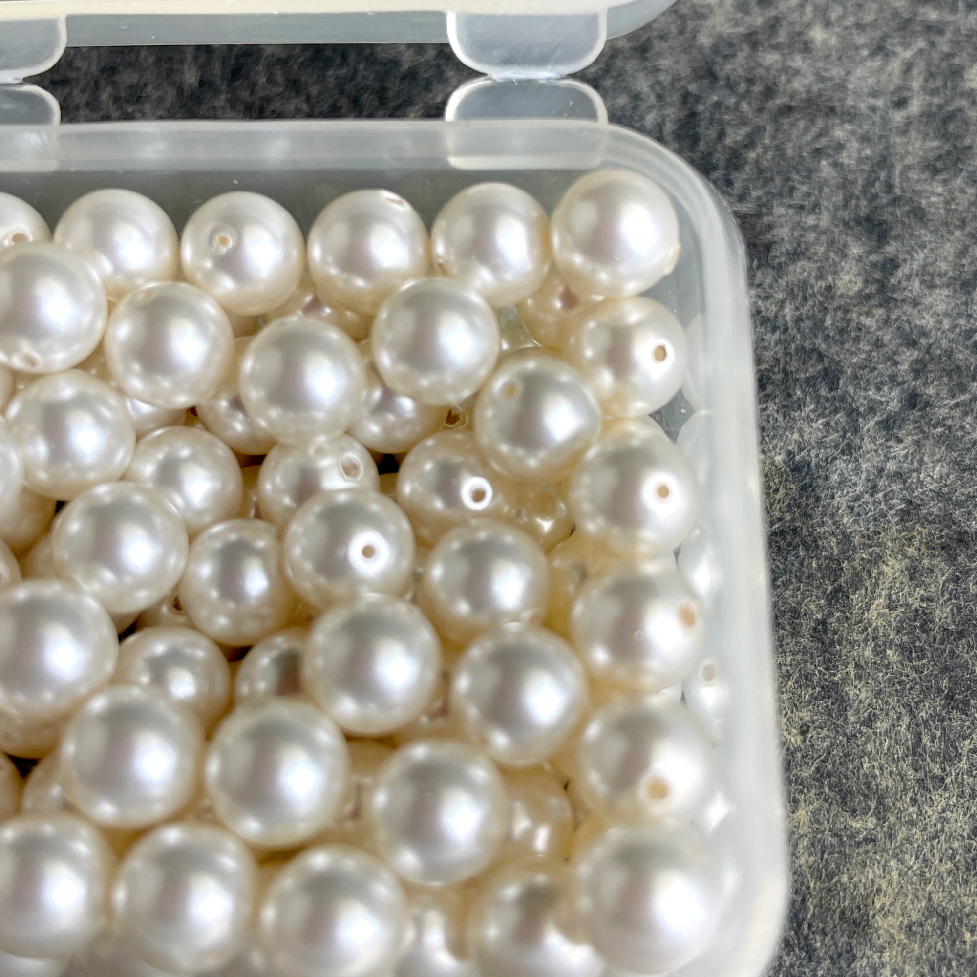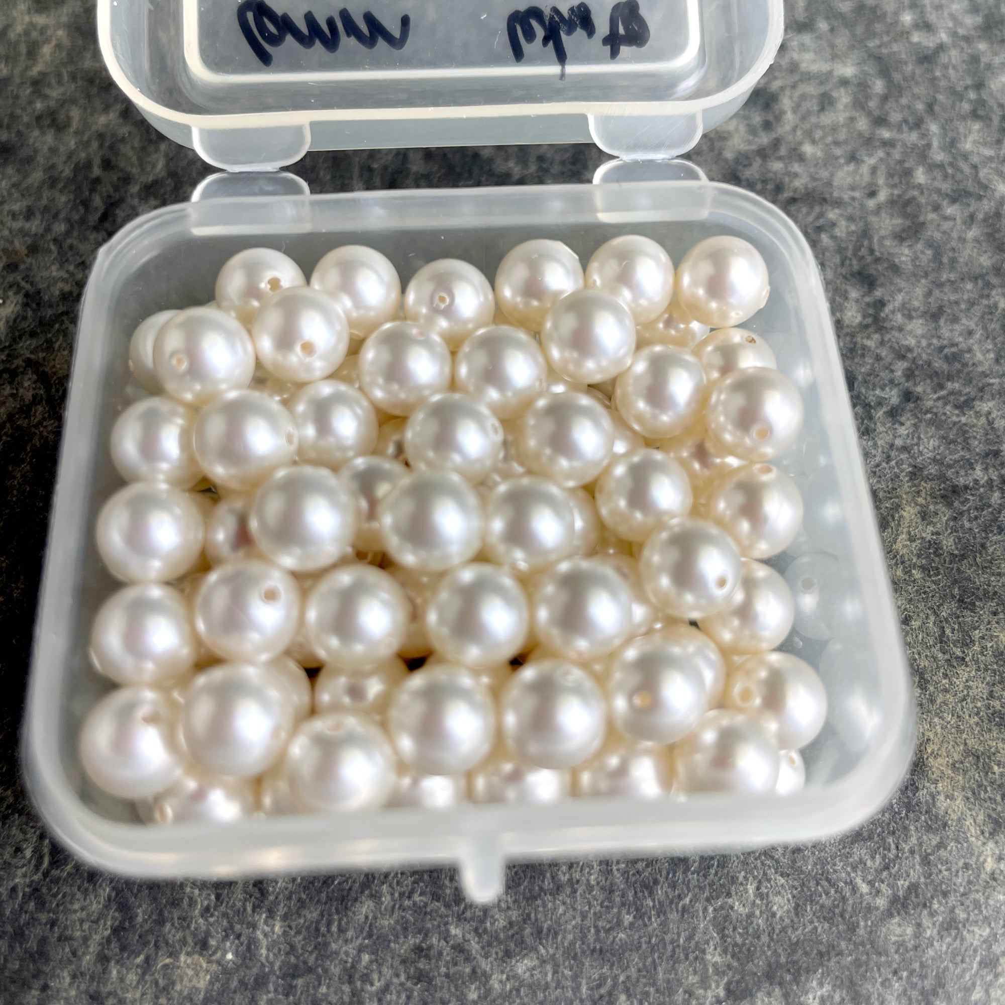 6mm round white crystal pearls. Differing amounts of beads in each container, we estimate a full plastic box is between 100-110 beads. Total 6 containers, one is only partially full.