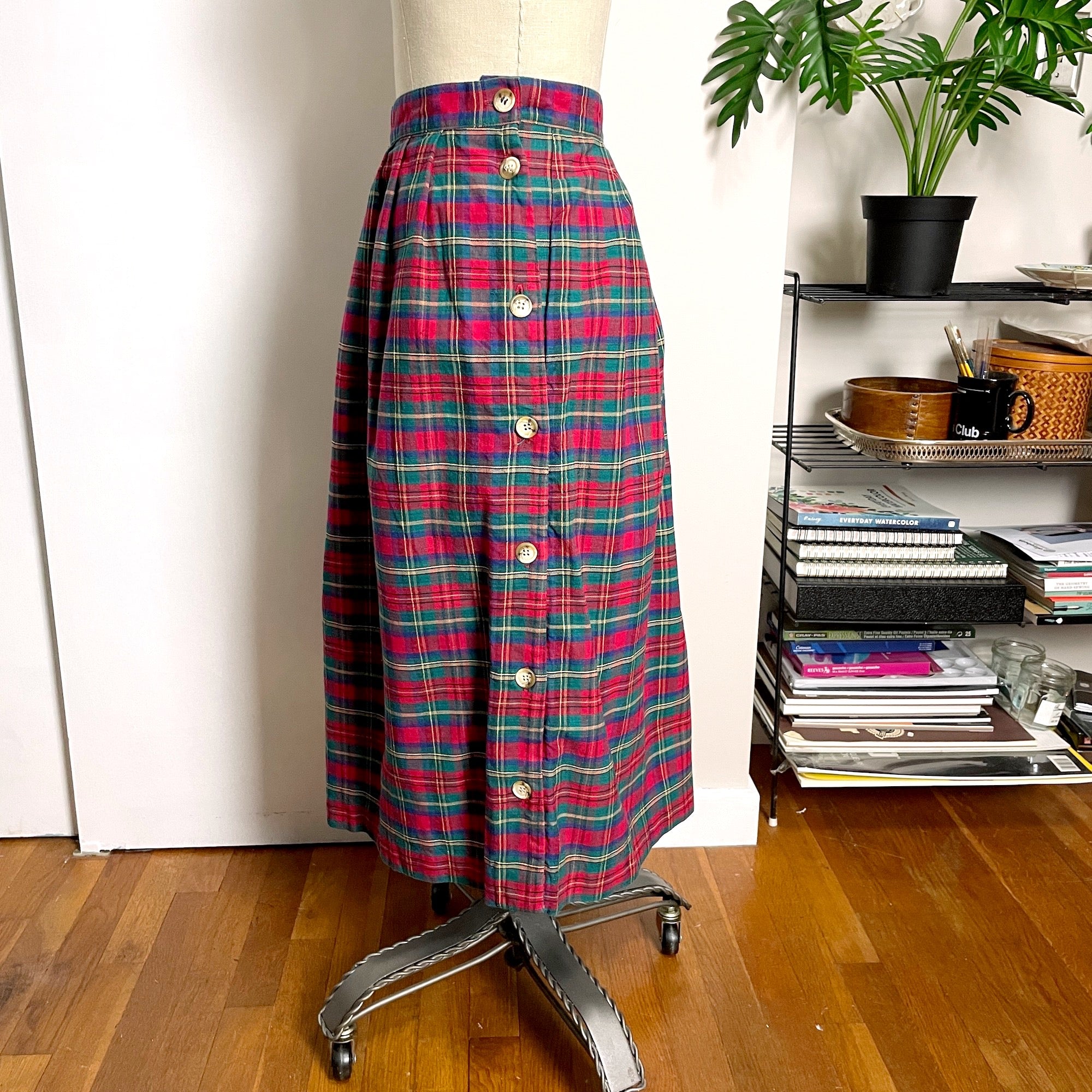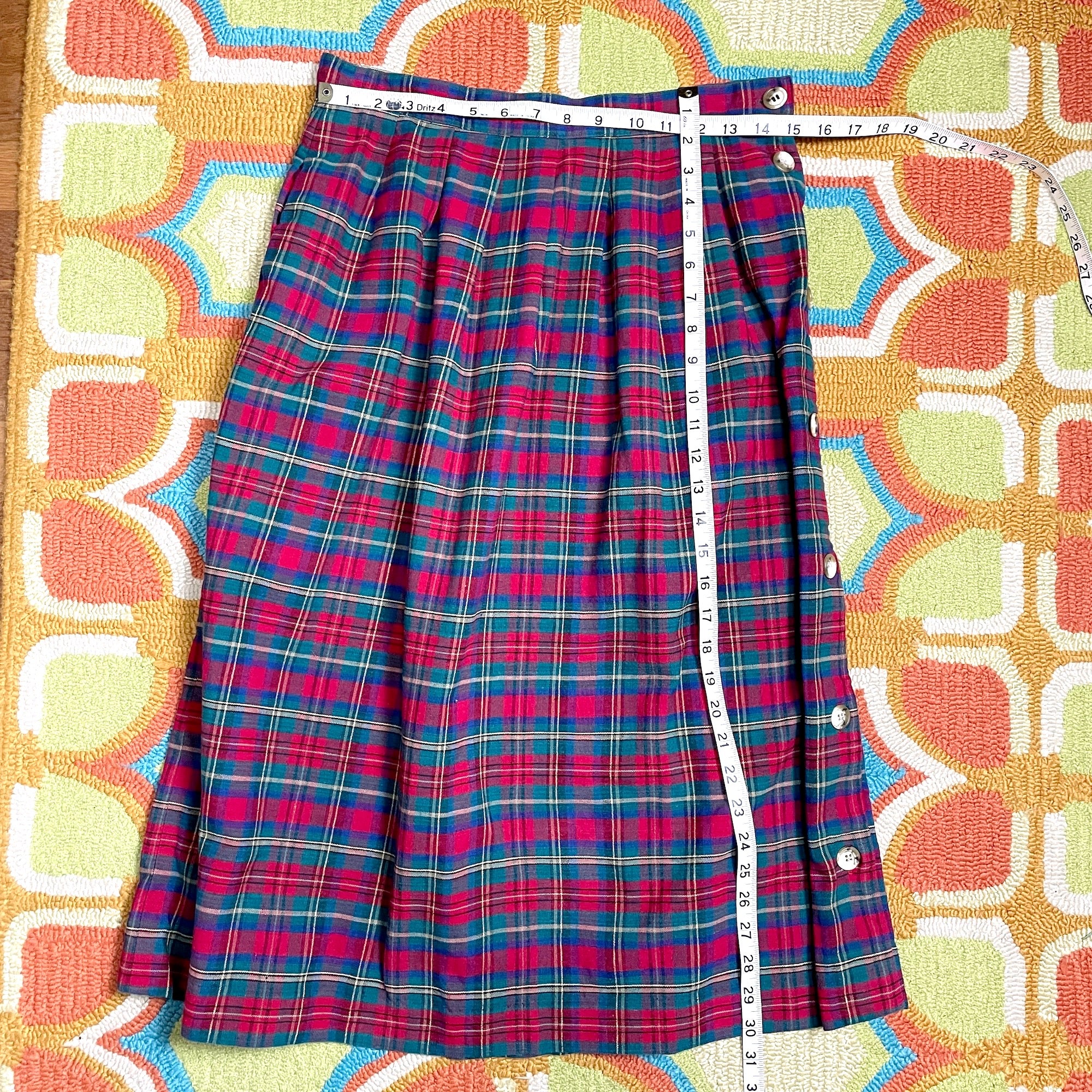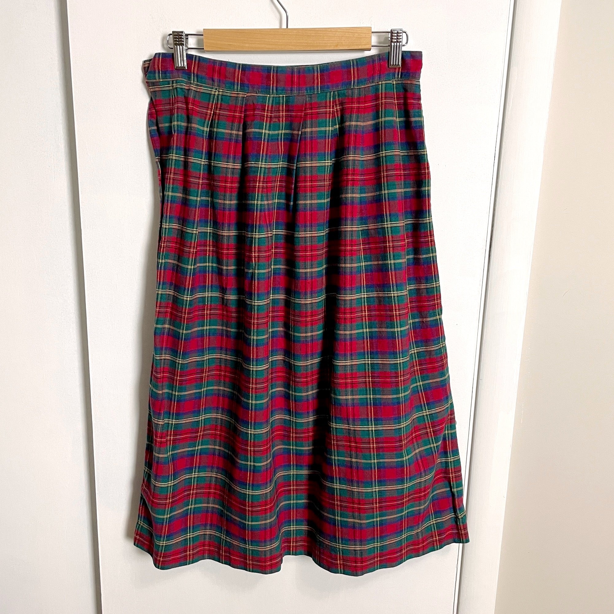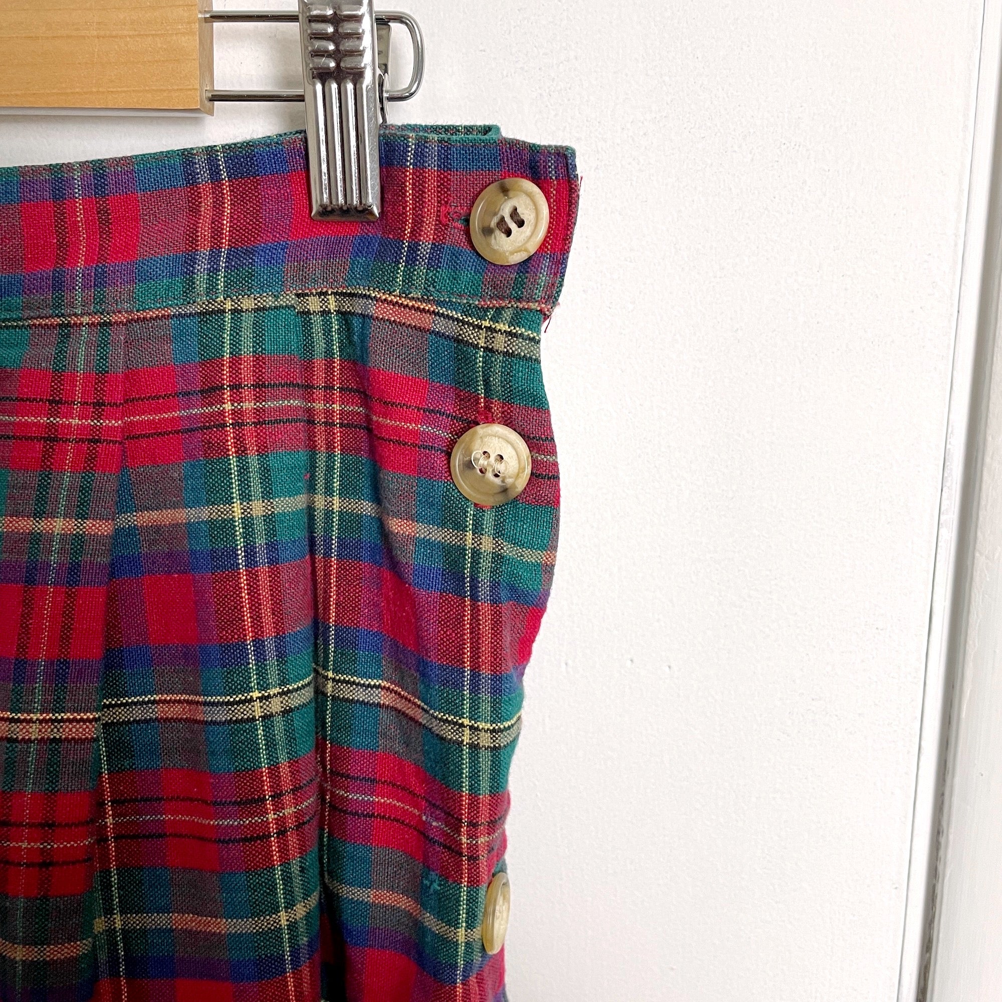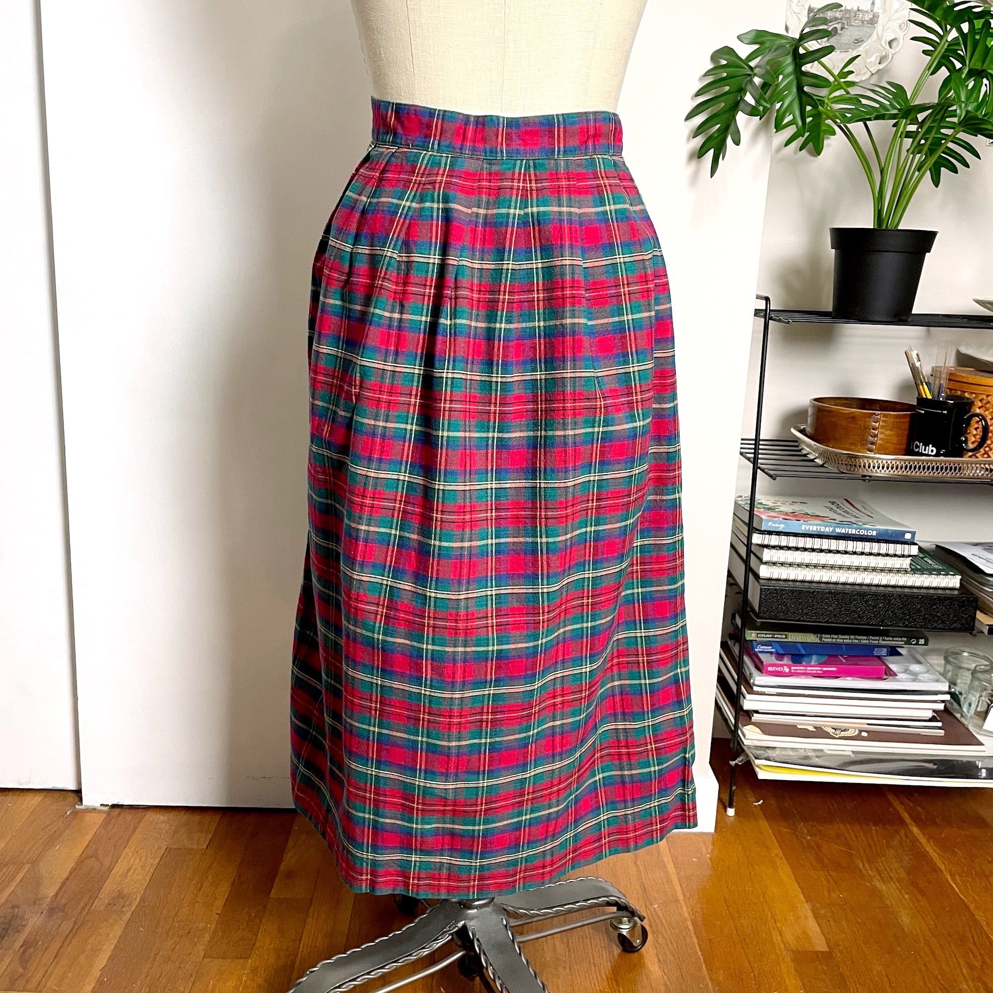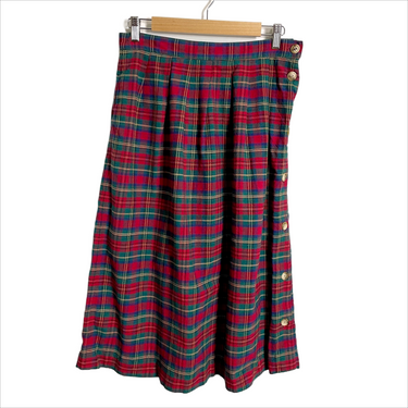 Vintage 1980s cotton plaid skirt by David Brooks. Red, green, yellow, blue and black plaid heavy weight cotton, pleated with a full button side. One on seam pocket. Made in USA.