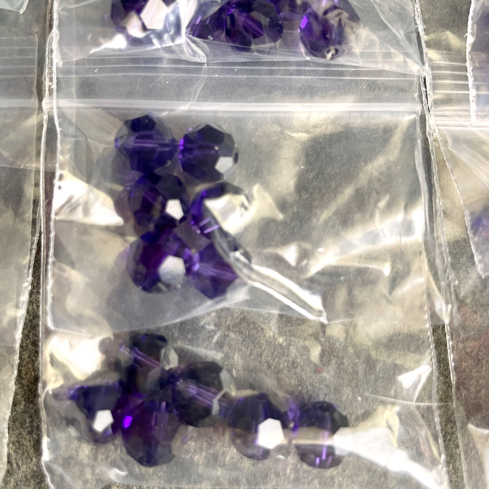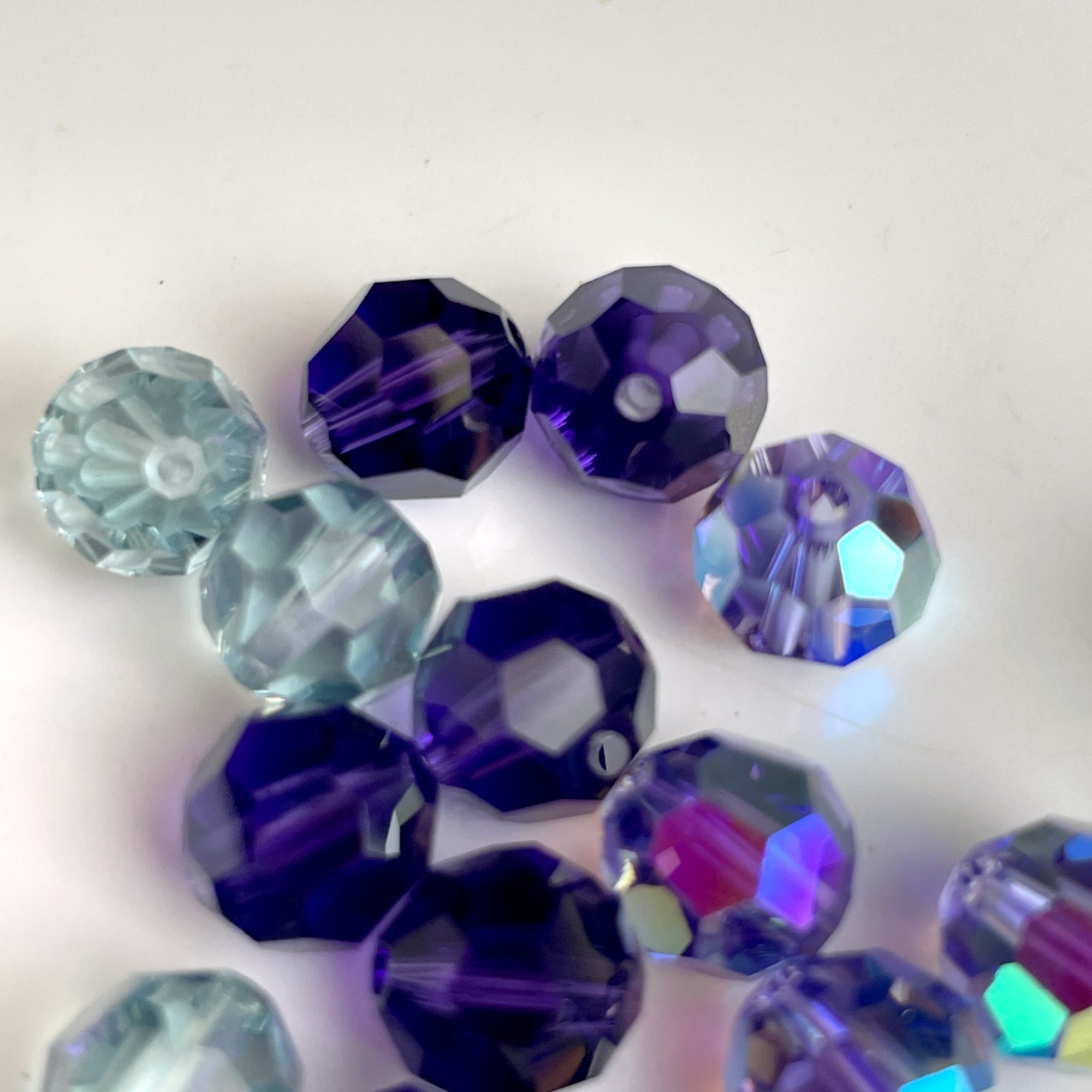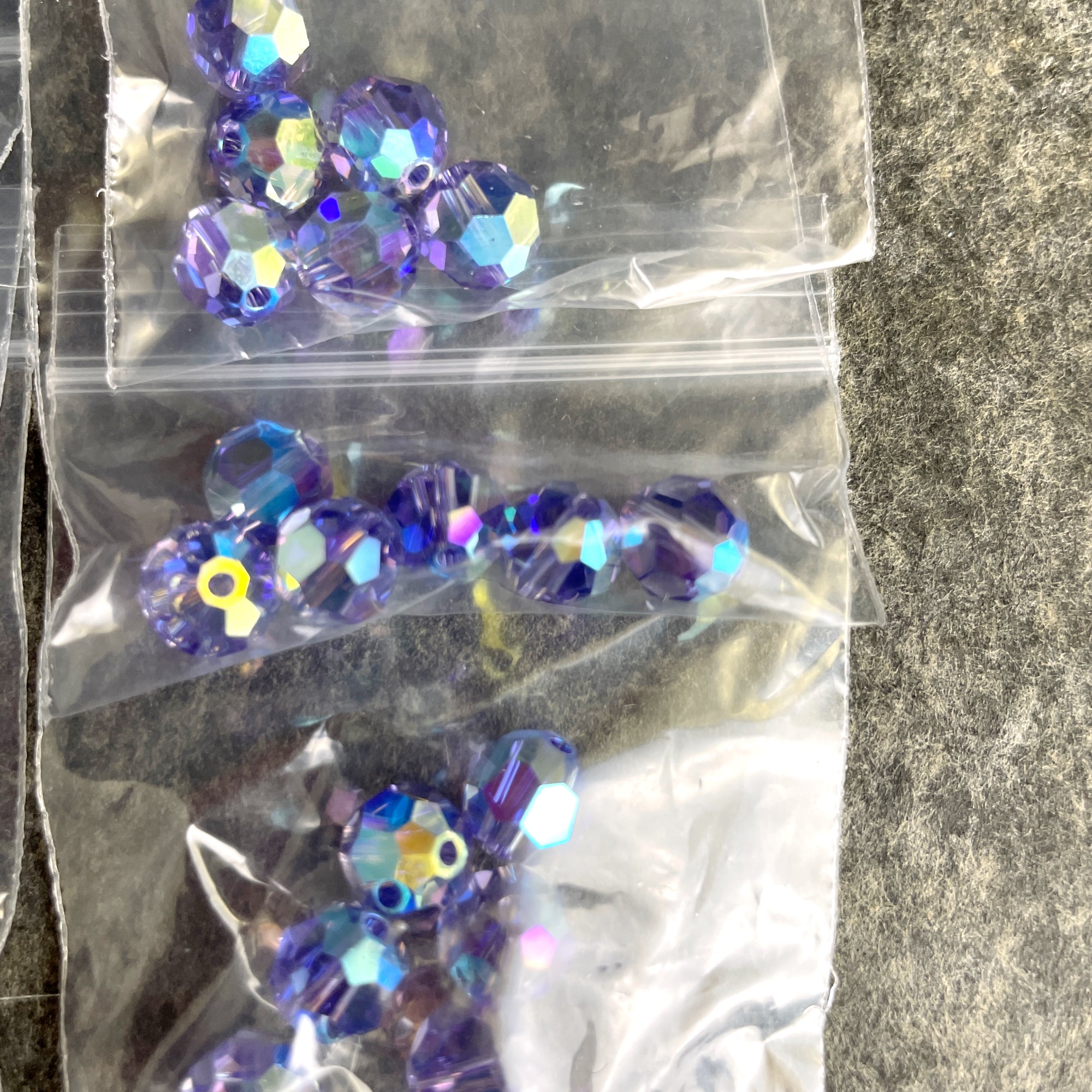 96 bead assortment of 8mm round crystal beads. 16 packages, 6 beads per package. Color assortment includes shades of smoky blue (10 bags), dark purple (3 bags), AB purple (3 bags).