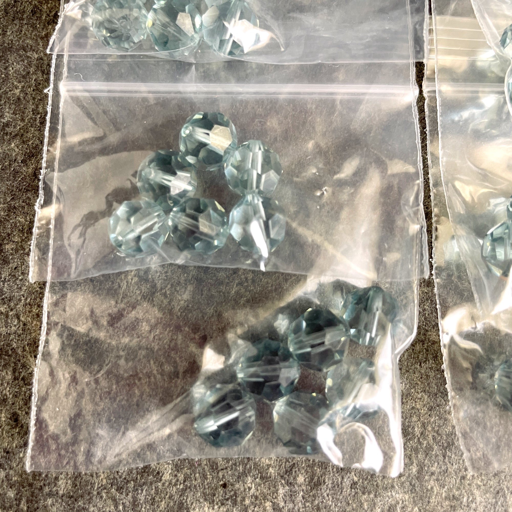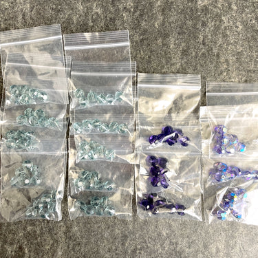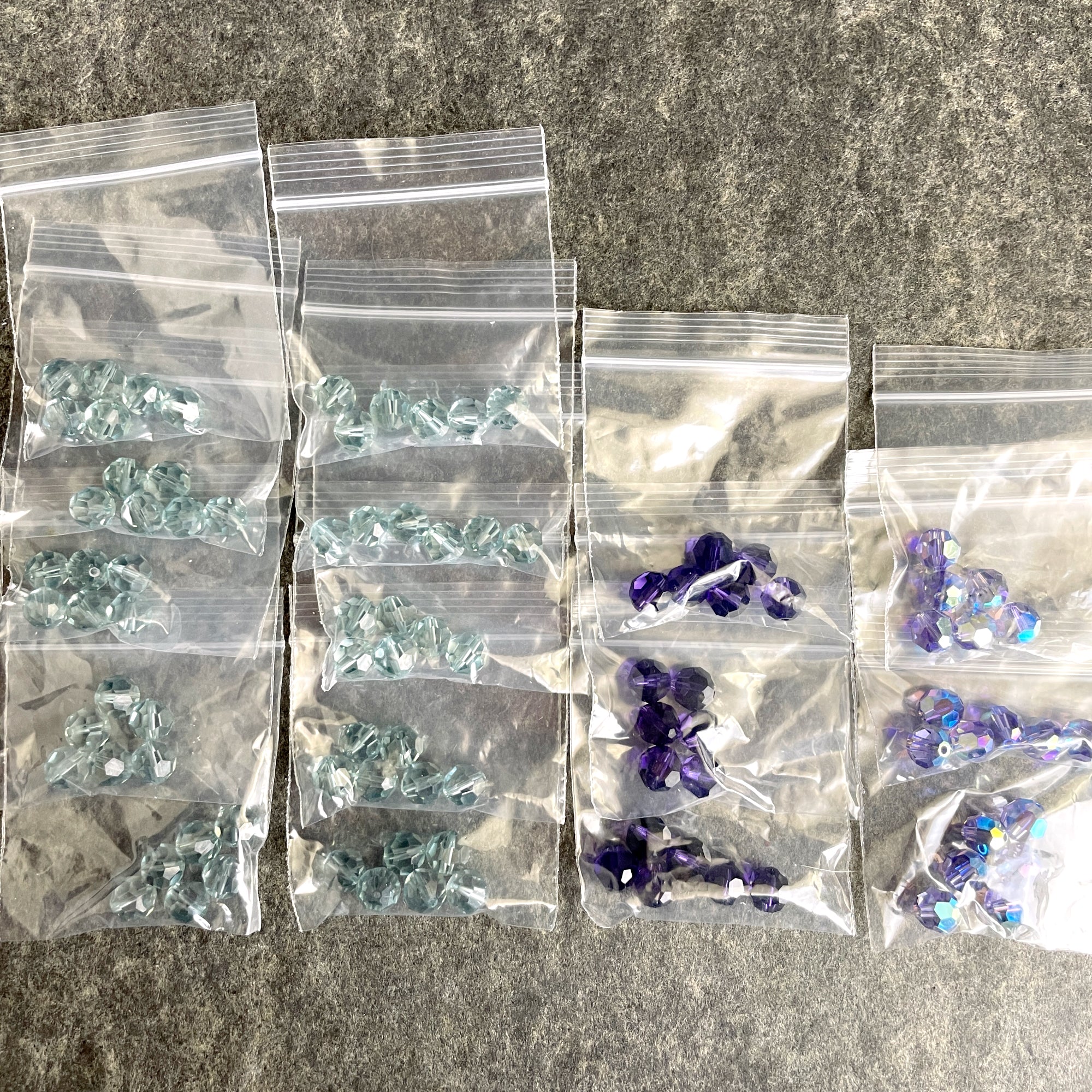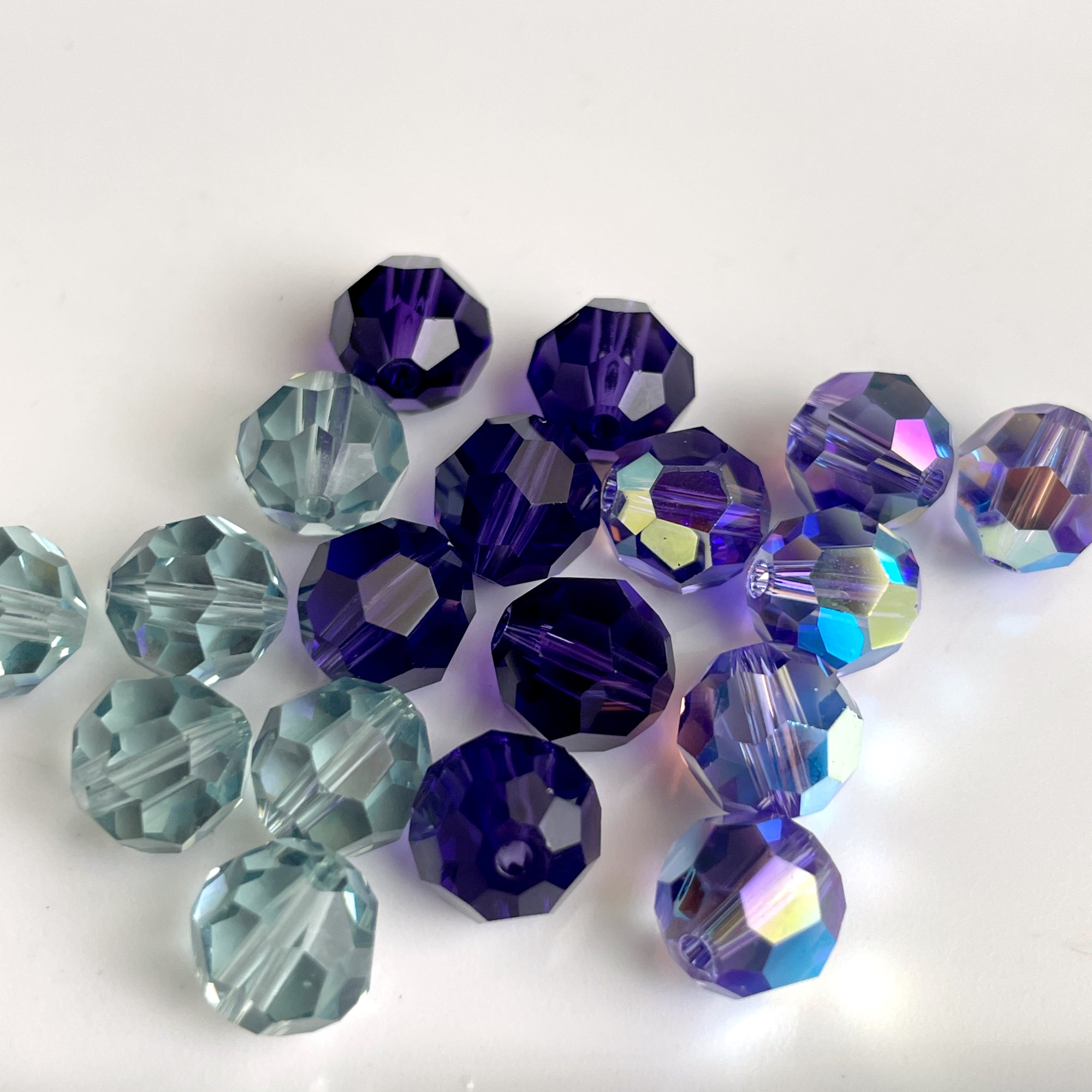 96 bead assortment of 8mm round crystal beads. 16 packages, 6 beads per package. Color assortment includes shades of smoky blue (10 bags), dark purple (3 bags), AB purple (3 bags).