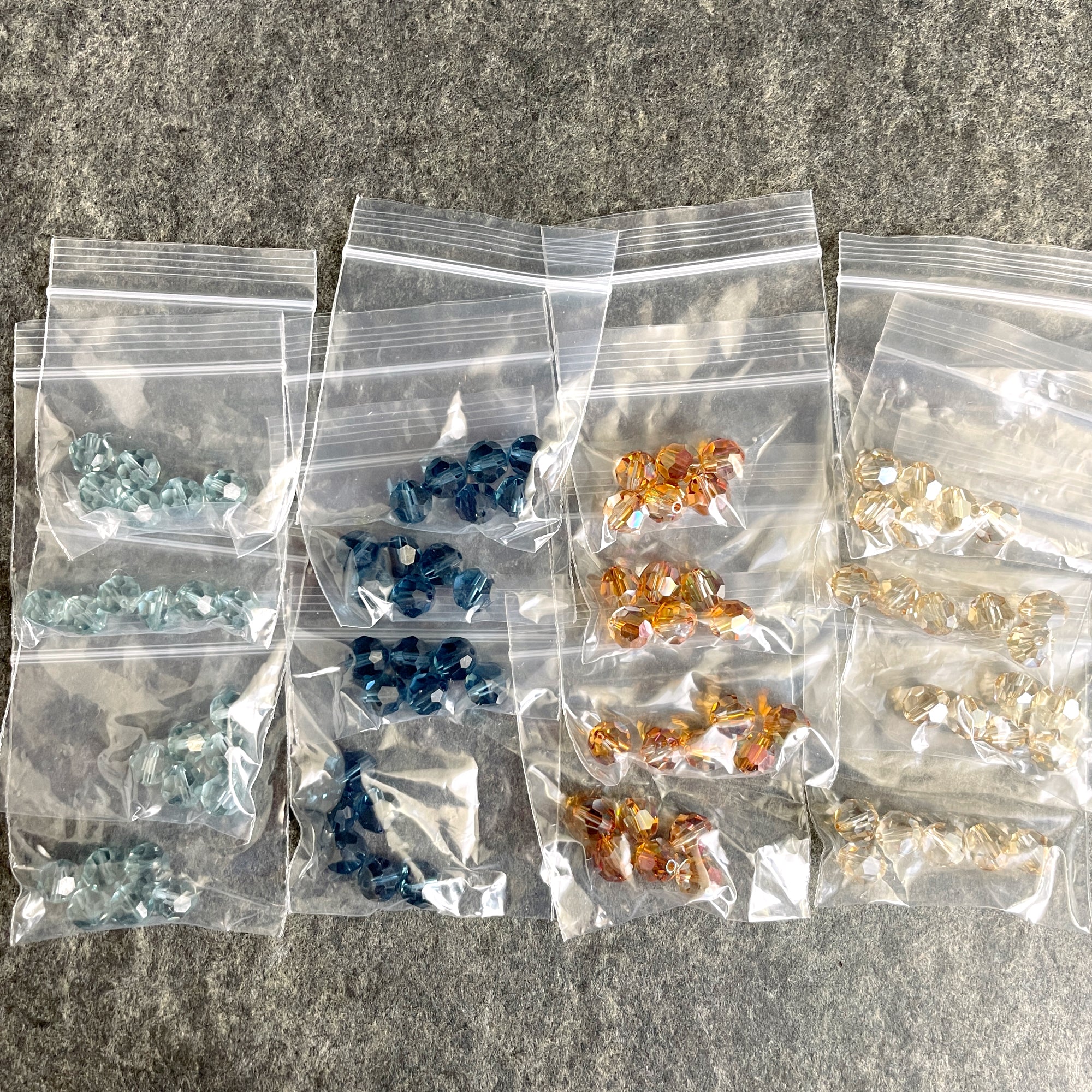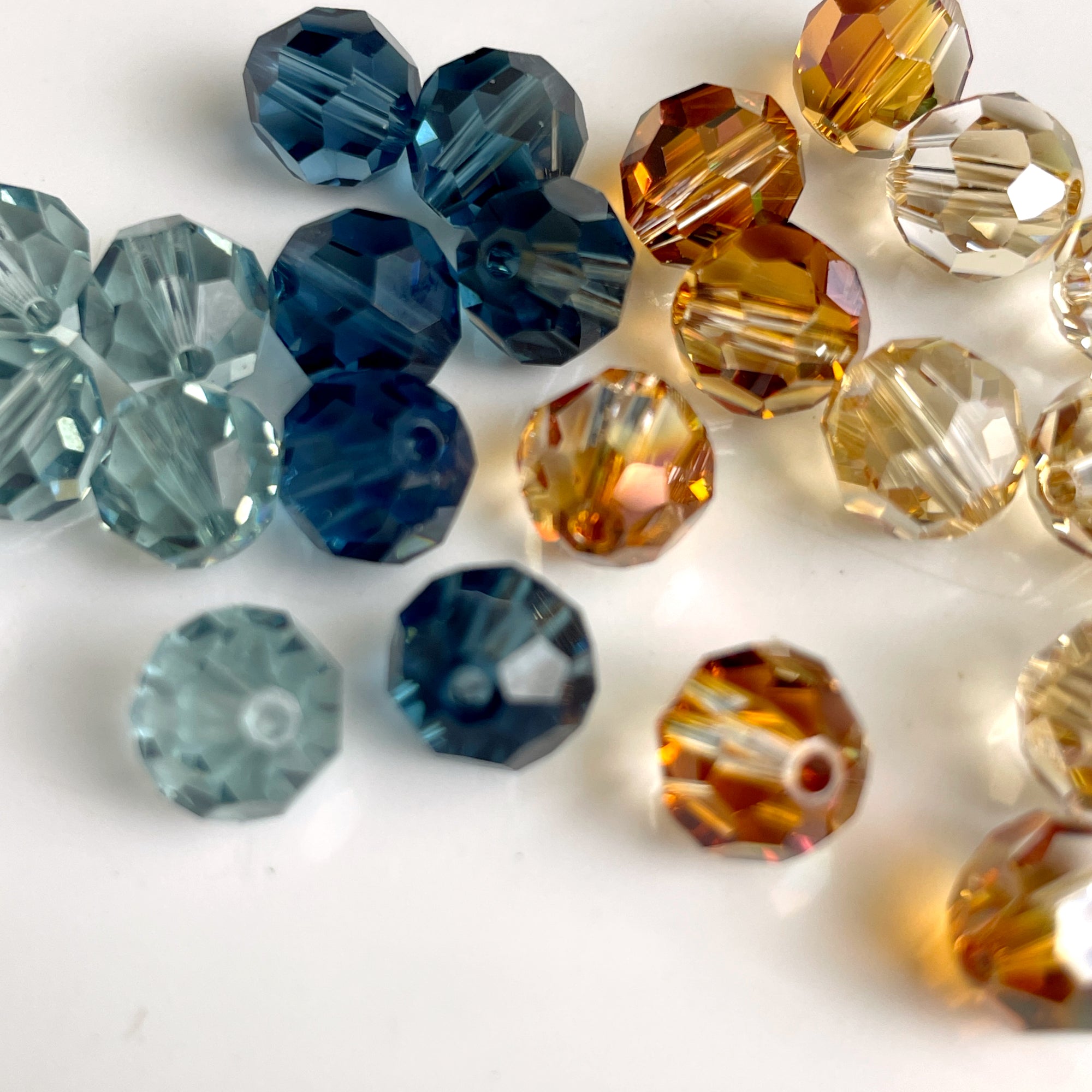 96 bead assortment of 8mm round crystal beads. 16 packages, 6 beads per package. Color assortment includes shades of smoky blue and topaz. 4 bags each of 4 colors.