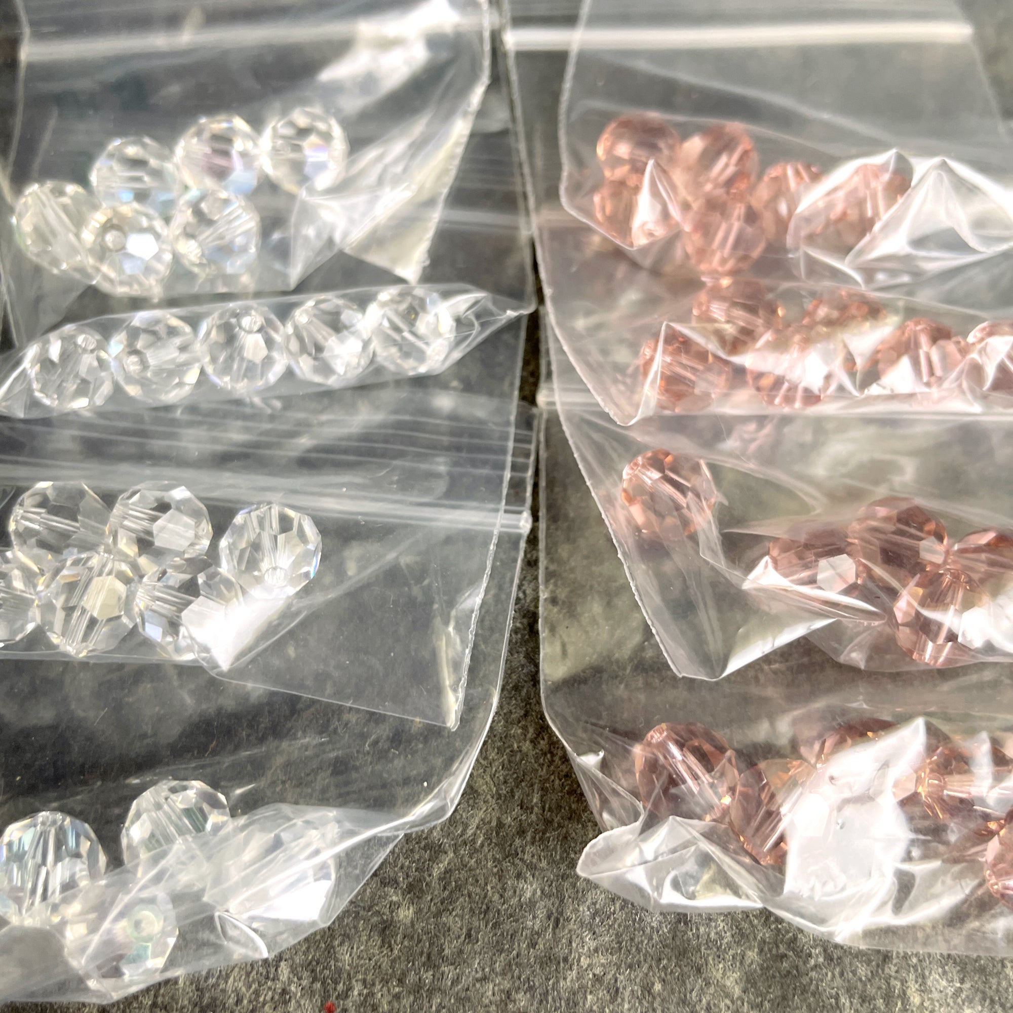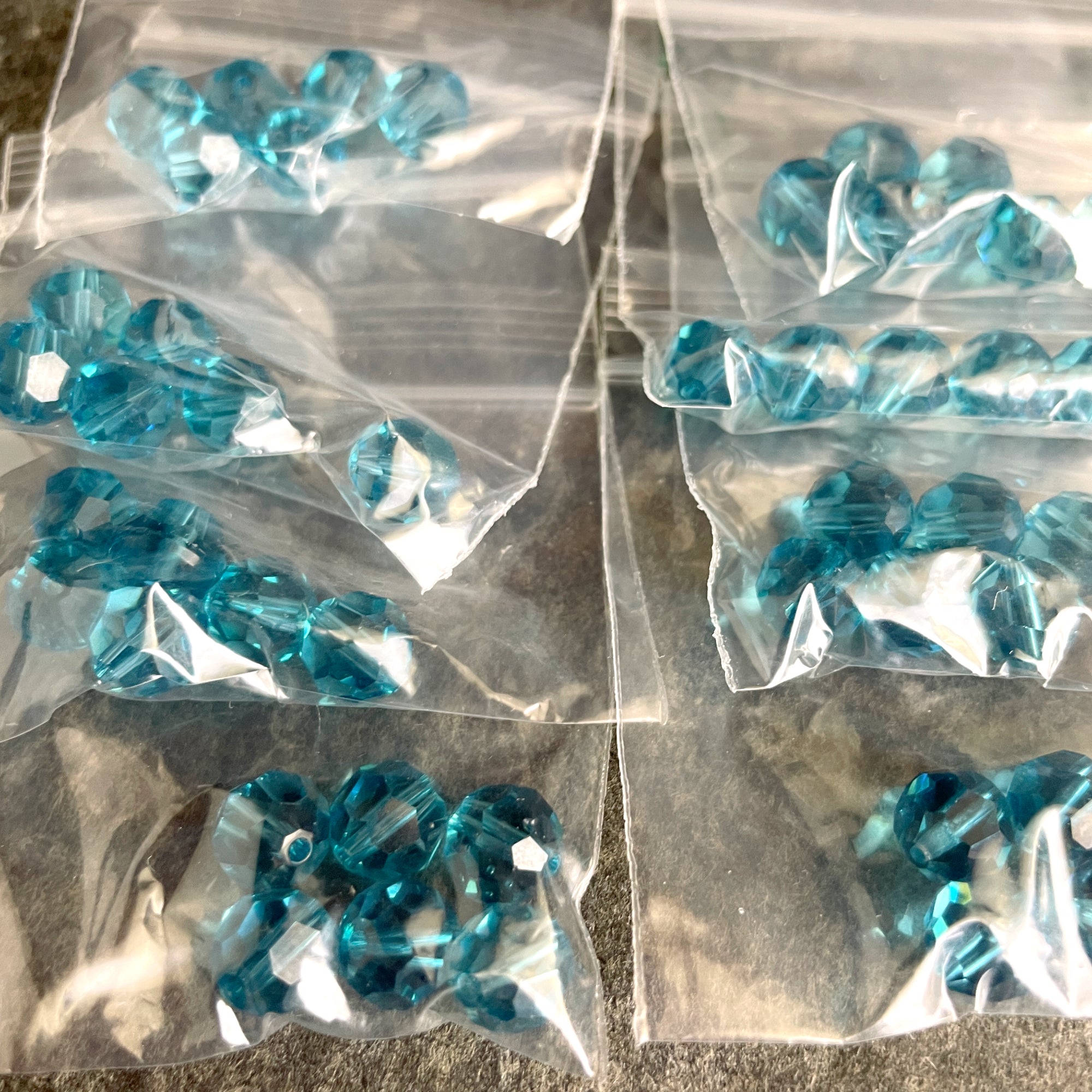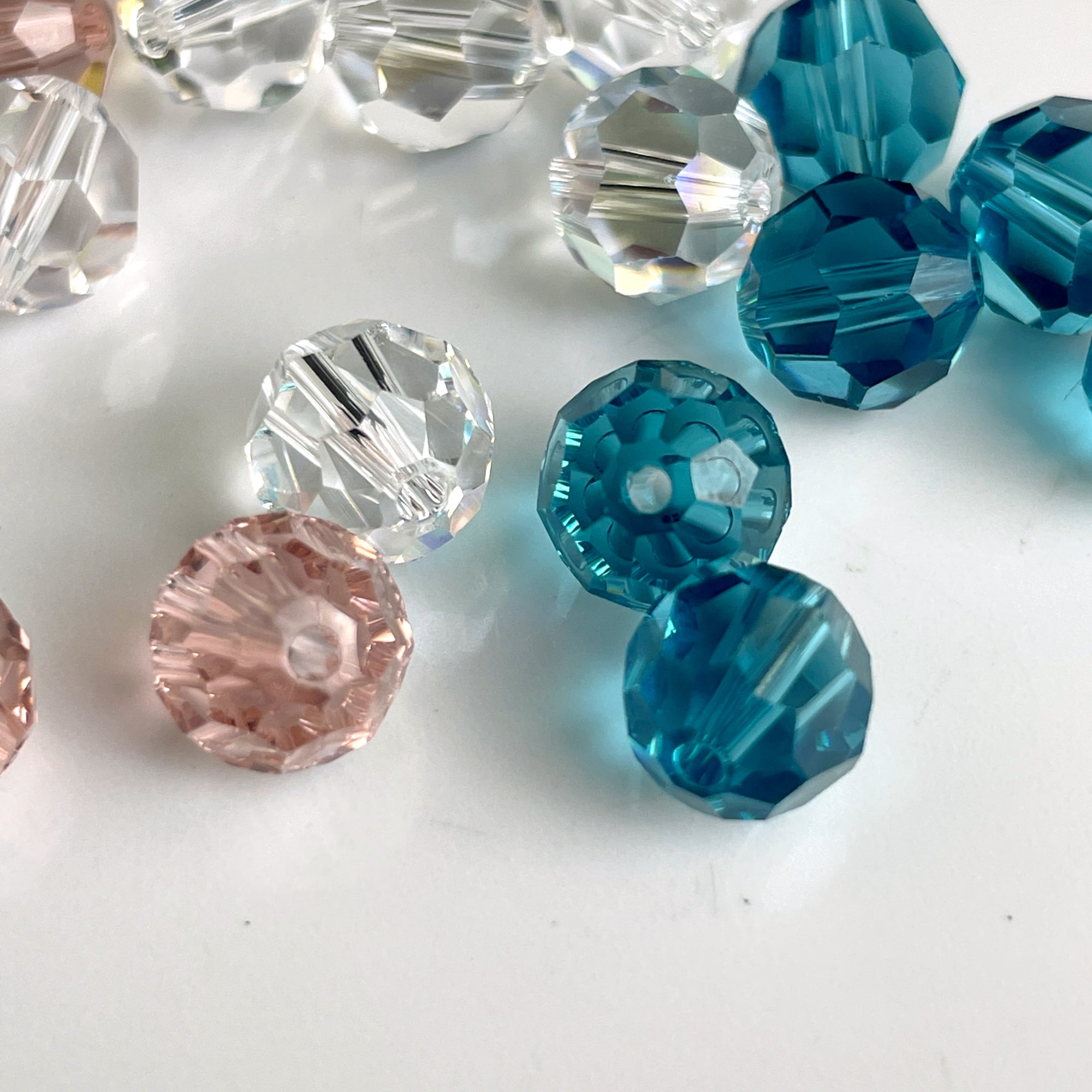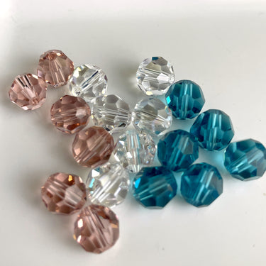 96 bead assortment of 8mm round crystal beads. 16 packages, 6 beads per package. Color assortment includes 4 bags rosy pink, 8 bags turquoise blue and 4 bags clear.