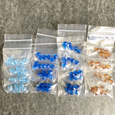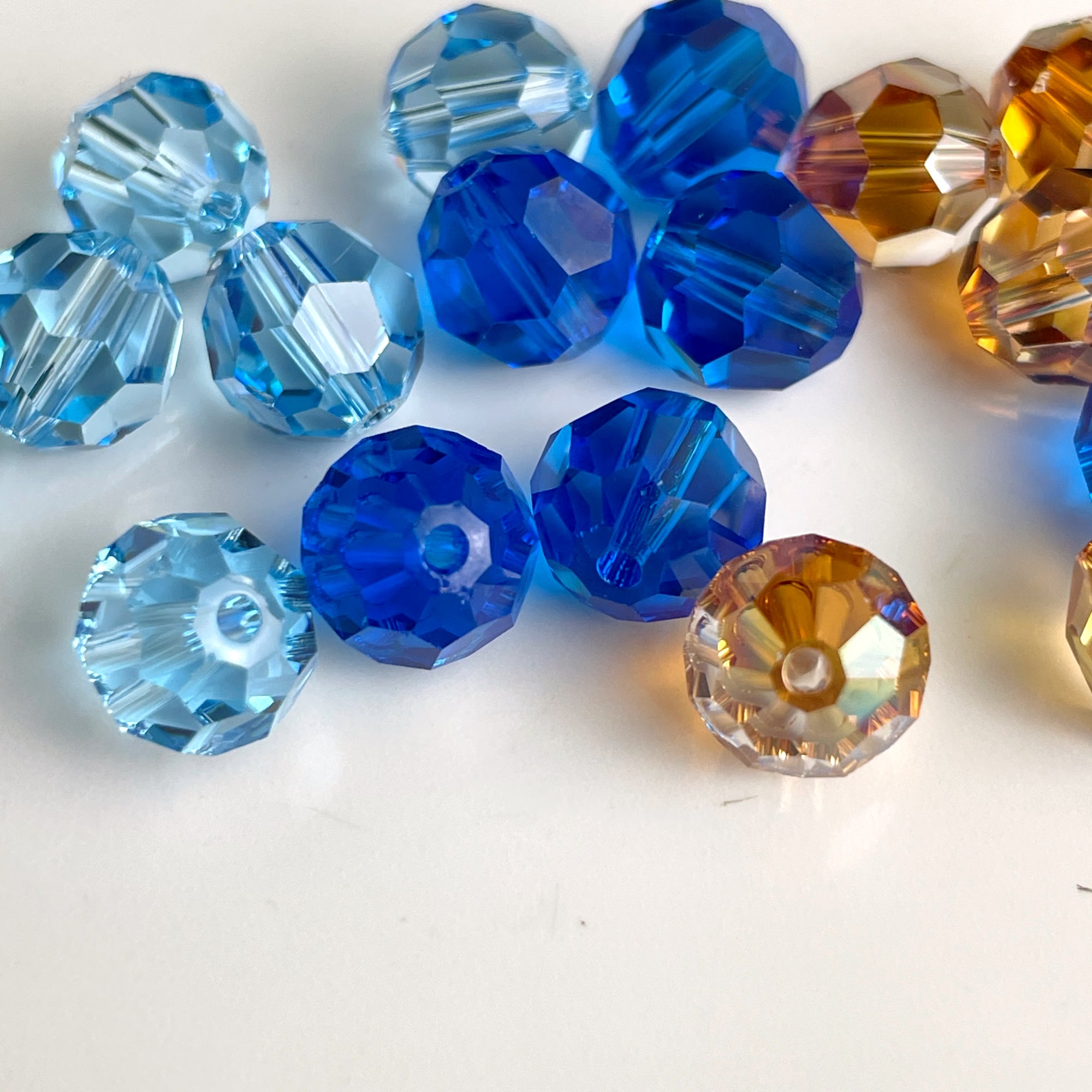 96 bead assortment of 8mm round crystal beads. 16 packages, 6 beads per package. Color assortment includes shades of: 4 bags of light blue, 8 bags of cerulean blue, 4 bags of topaz.