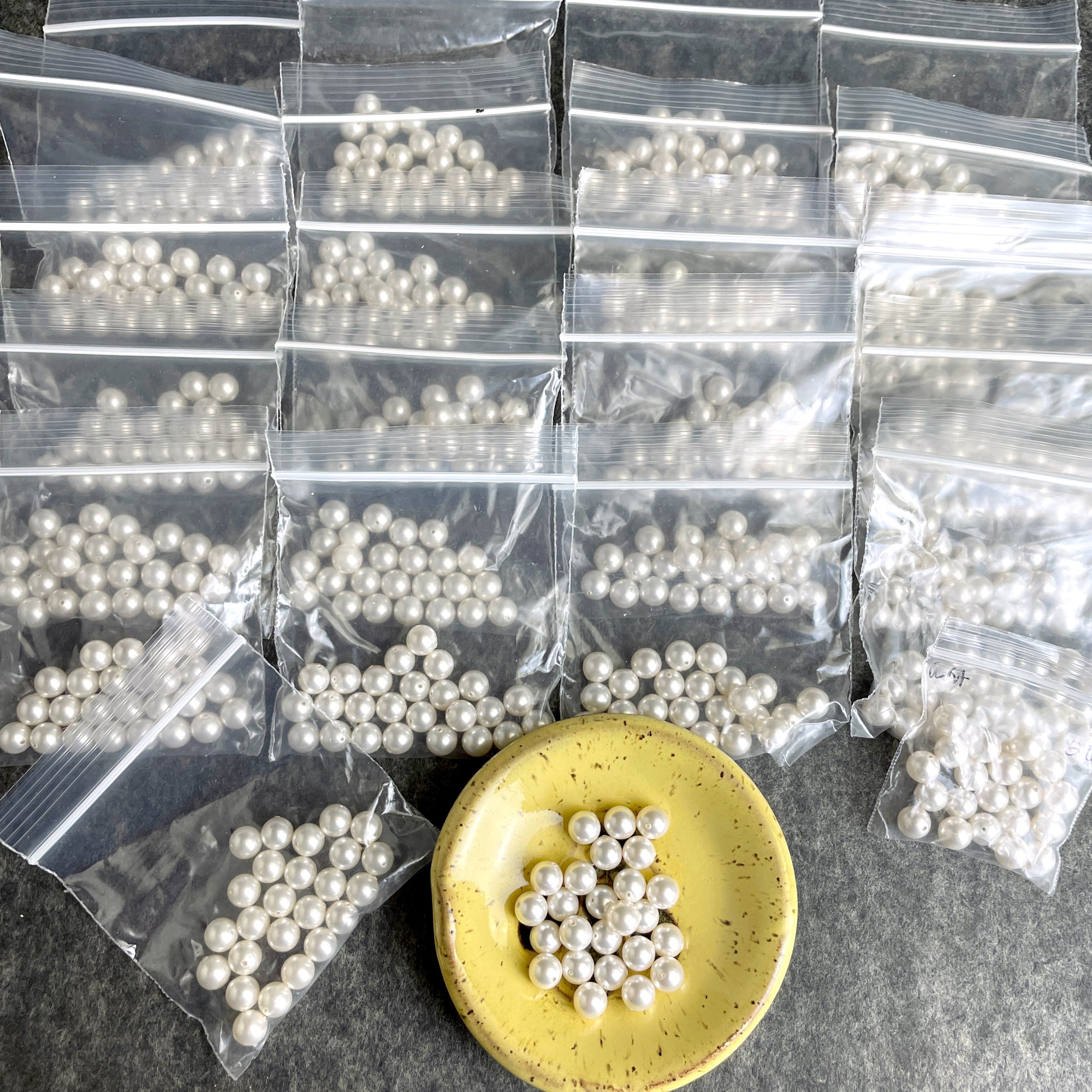 22 bags of 25/bag 8mm round crystal pearls in white. There is also an additional bag of 20, for a total of 570.