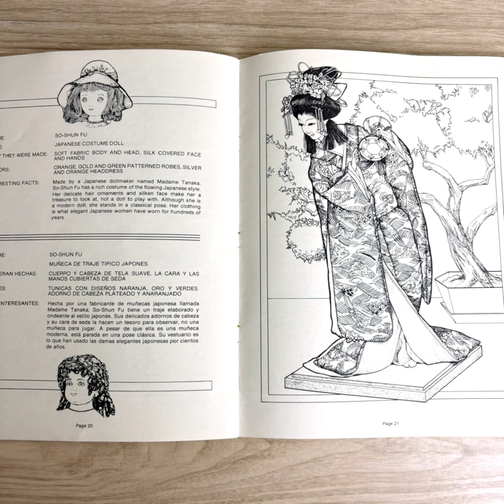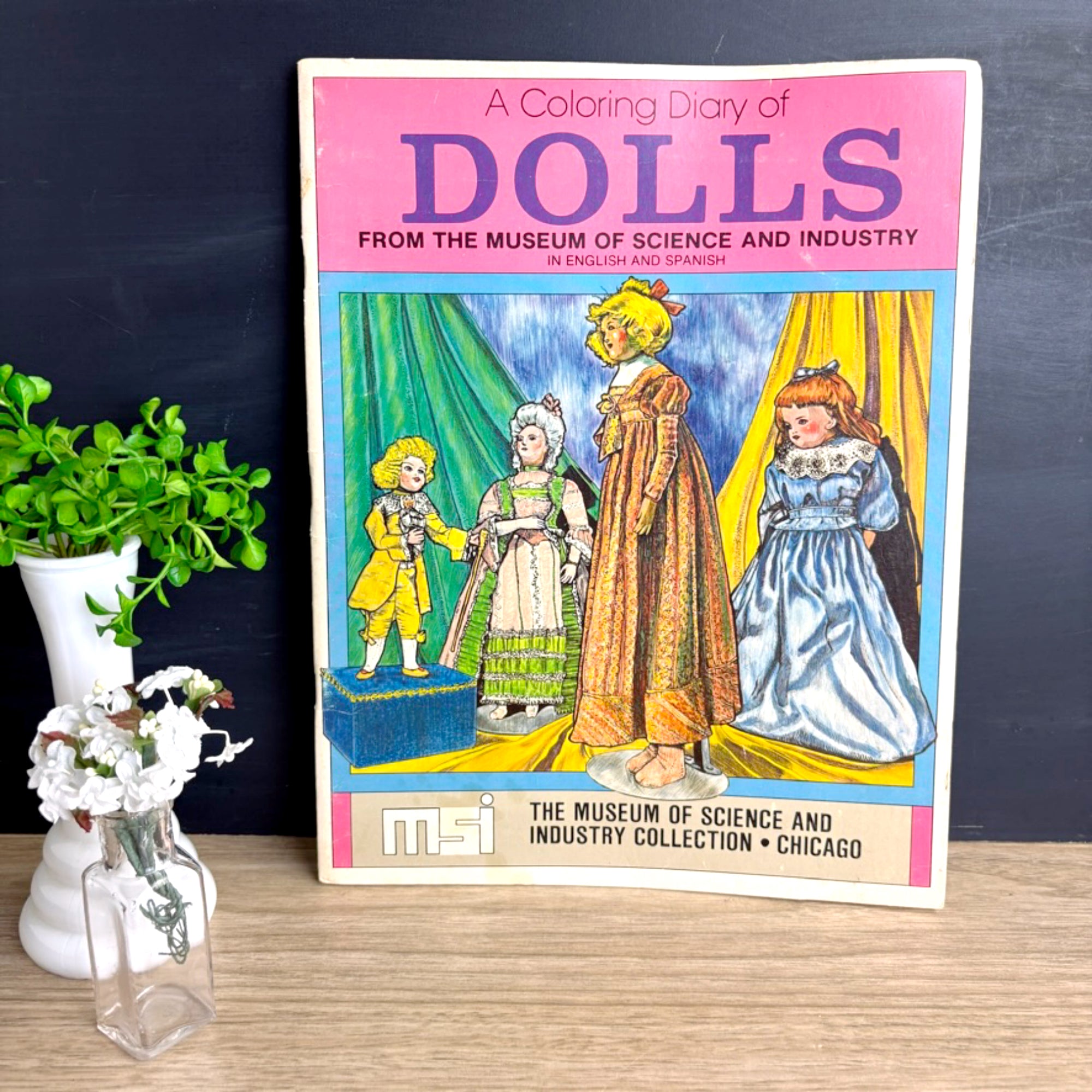 "A Coloring Diary of Dolls: From the Museum of Science and Industry." In English and Spanish. 1979 from Spizzirri Publishing. Softcover book. The Museum of Science and Industry Collection - Chicago. Has the name for the doll style, type of doll, how they were made, colors they came in and interesting facts on one page, and on the opposite page, a drawing of that doll for you to color. 15 different types of dolls are described.