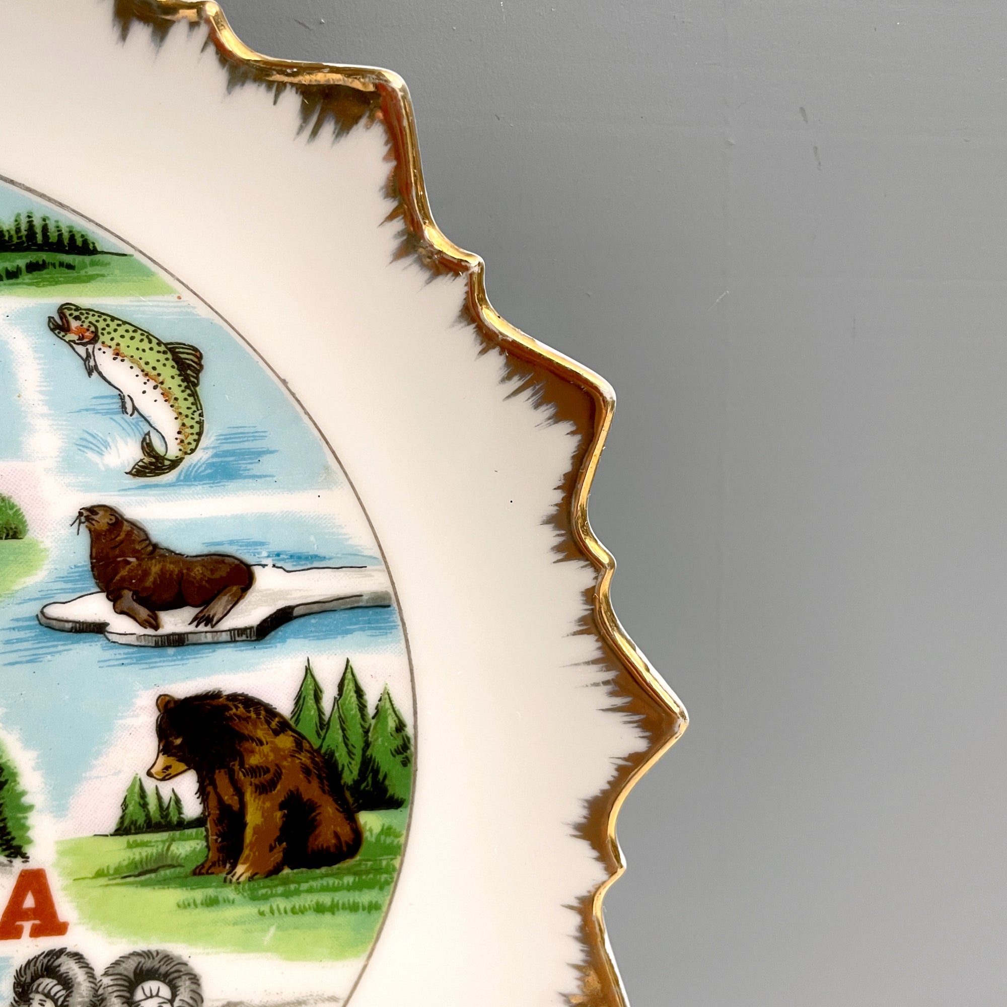 Vintage 1960s Alaska souvenir state plate. Center decal image with iconic Alaskan scenes and wildlife. Scalloped edge white plate brushed with gold at the edges. Holes in the back rim for adding a string to hang your plate. Made in Japan.