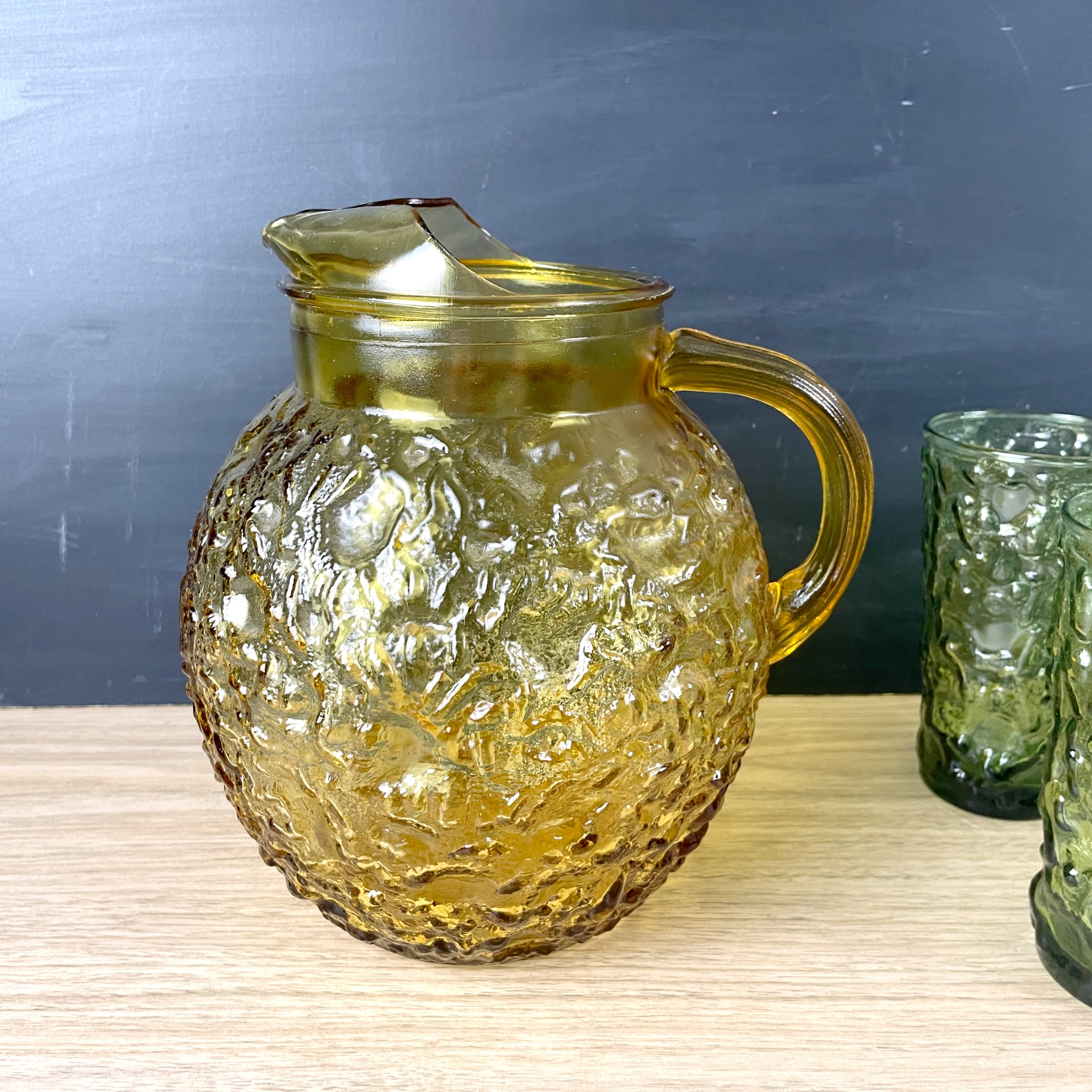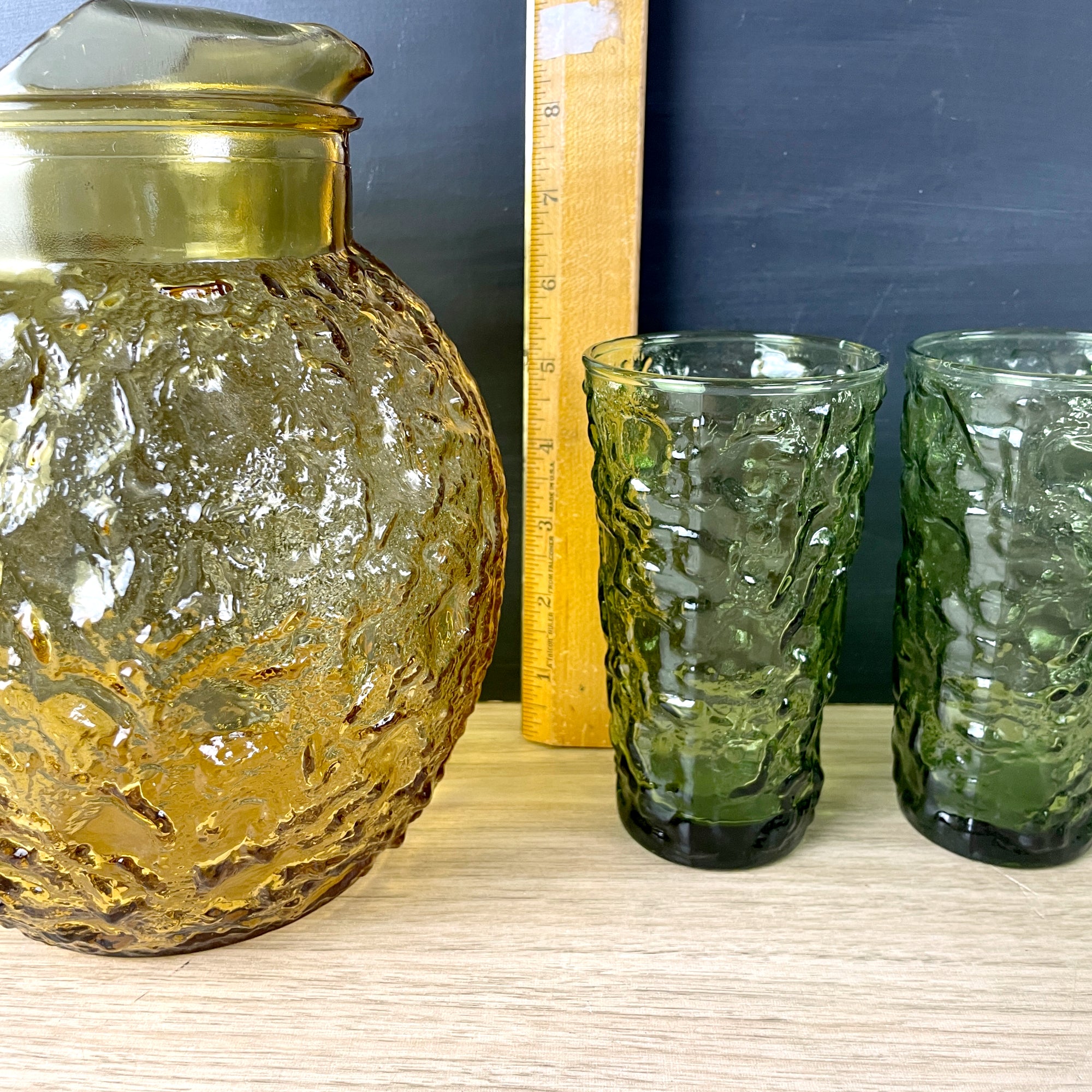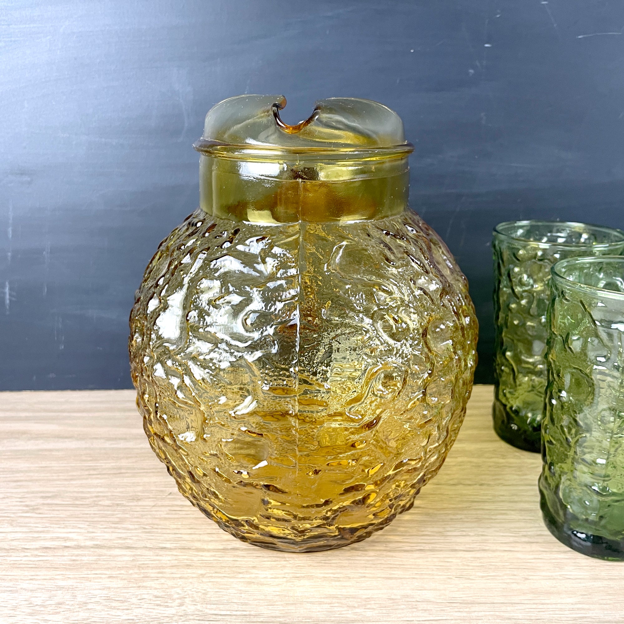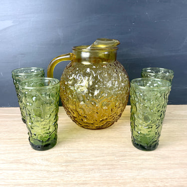 Vintage 1960s Anchor Hocking Lido or Milano pitcher in honey gold and 4 tumblers in green. Distinctive bumpy texture inside and out. Pitcher has an ice lip and ribbed handle. We aren't 100% sure, but we think these pieces were given out with fill ups at Phillips 66 gas stations.