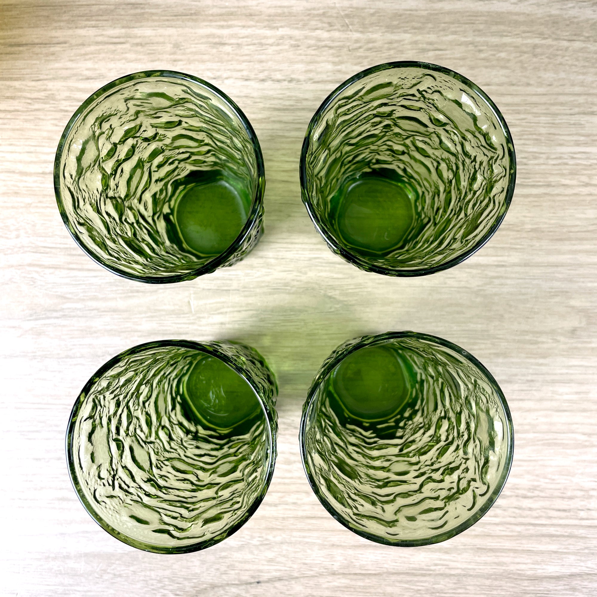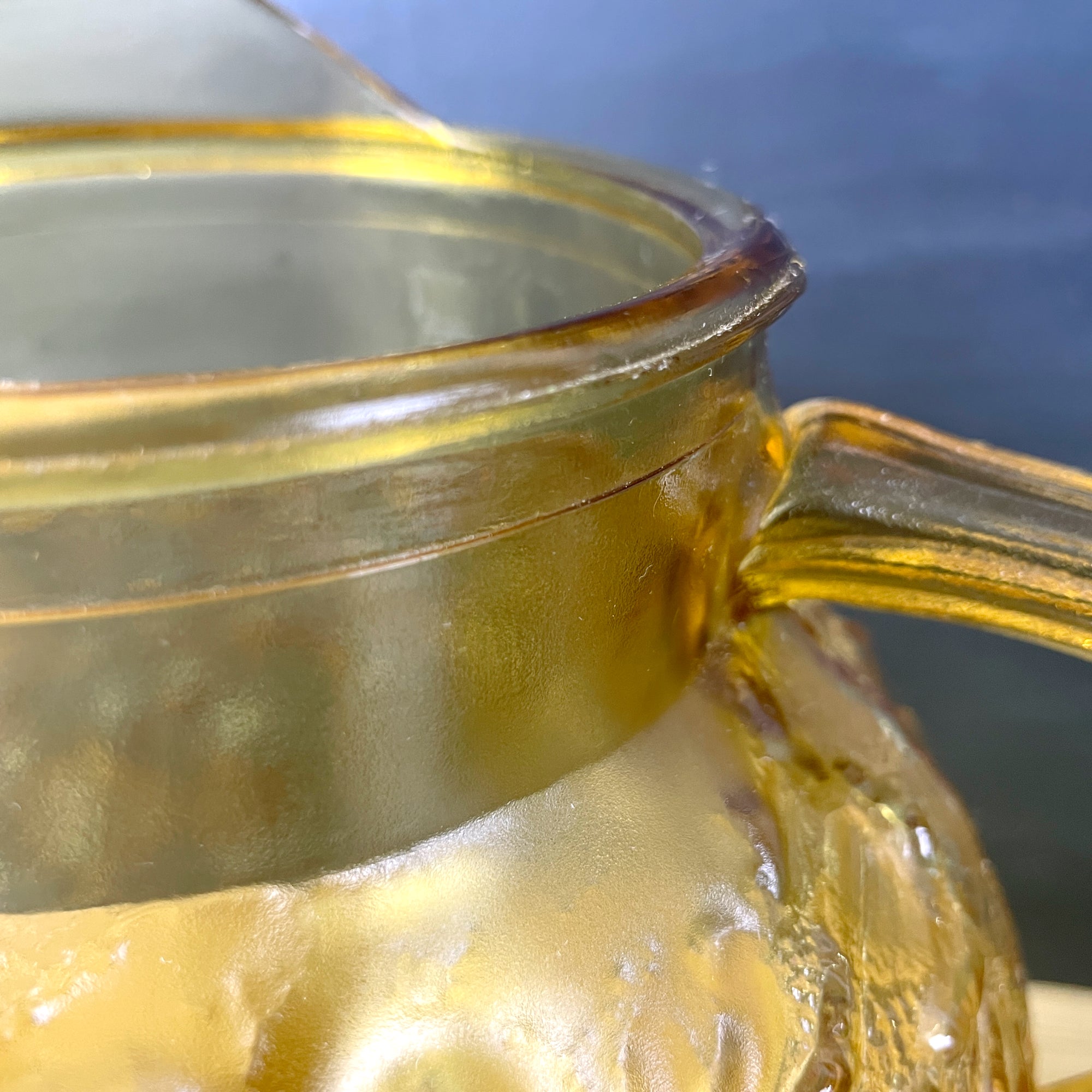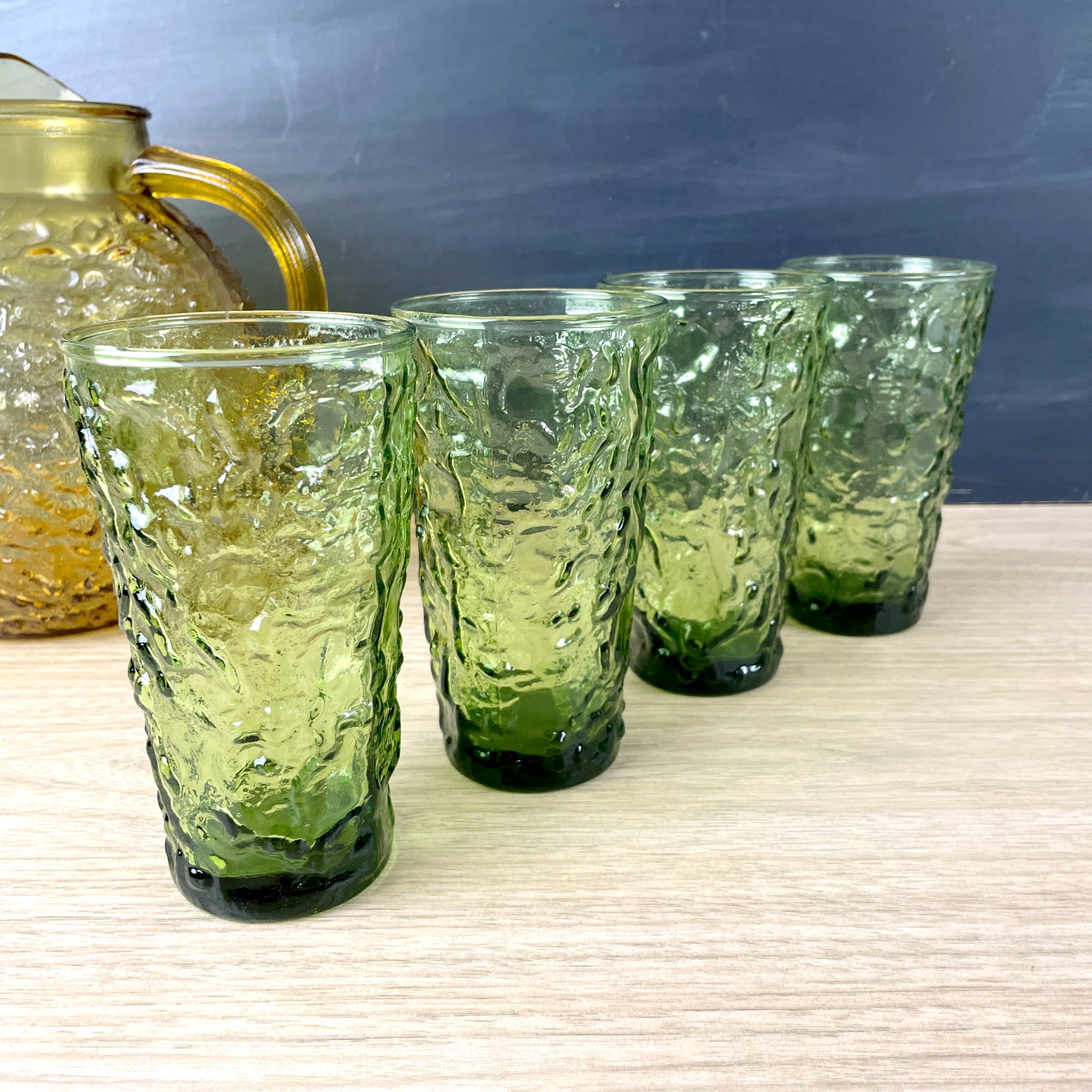 Vintage 1960s Anchor Hocking Lido or Milano pitcher in honey gold and 4 tumblers in green. Distinctive bumpy texture inside and out. Pitcher has an ice lip and ribbed handle. We aren't 100% sure, but we think these pieces were given out with fill ups at Phillips 66 gas stations.