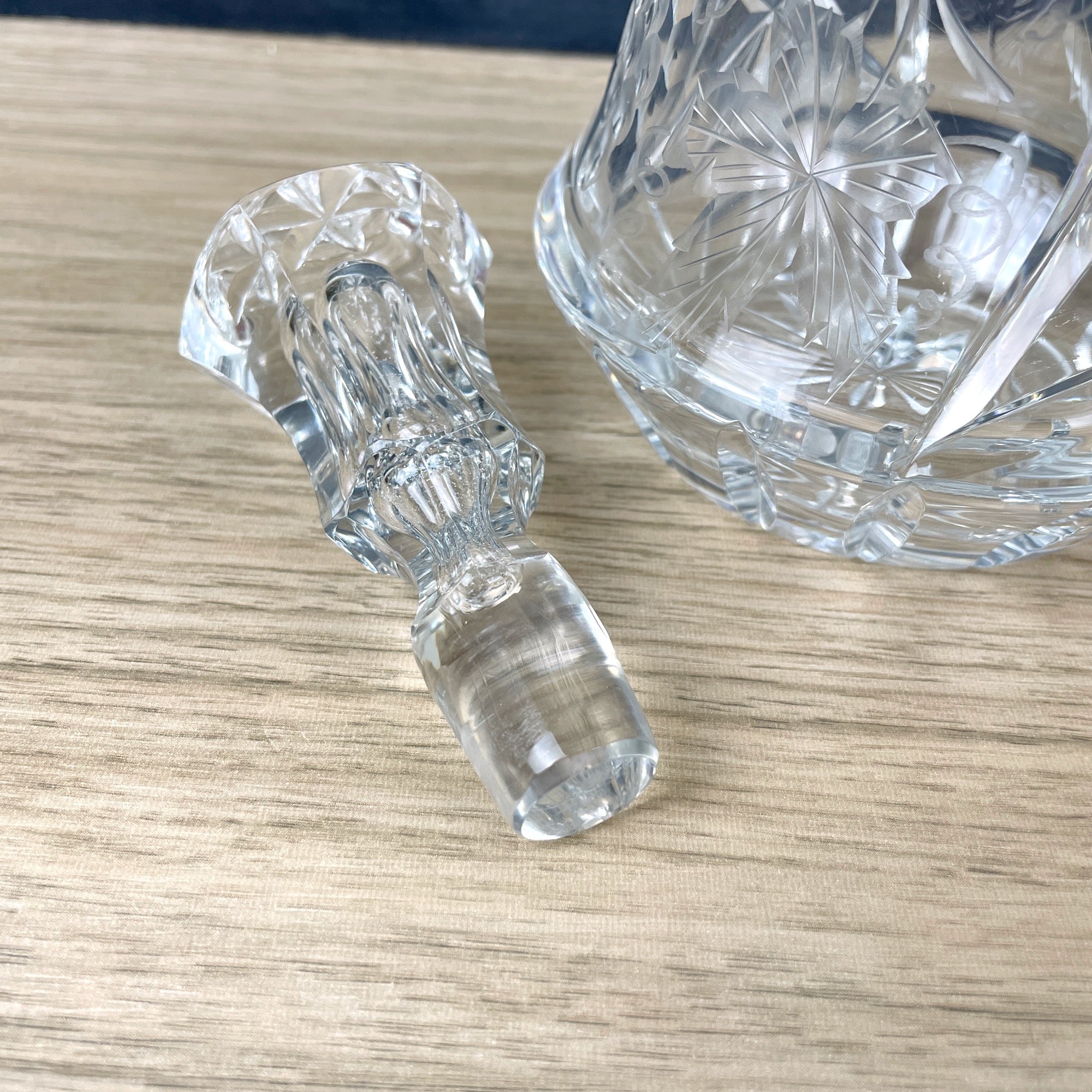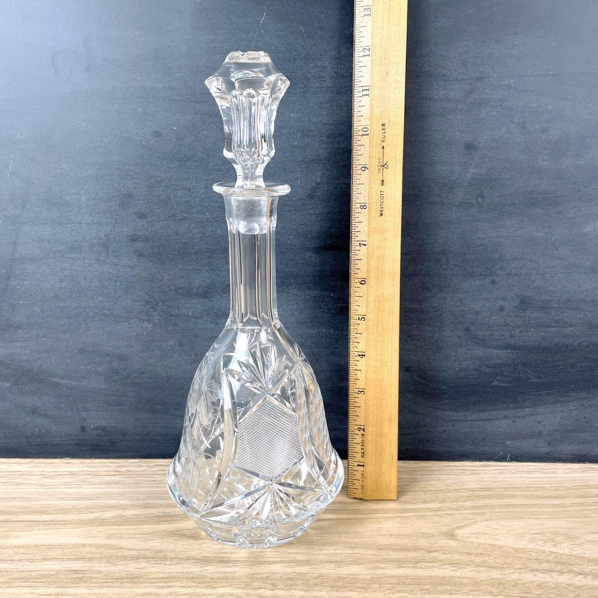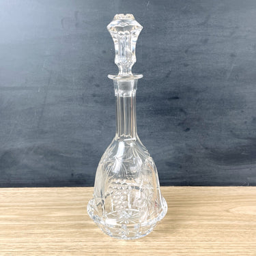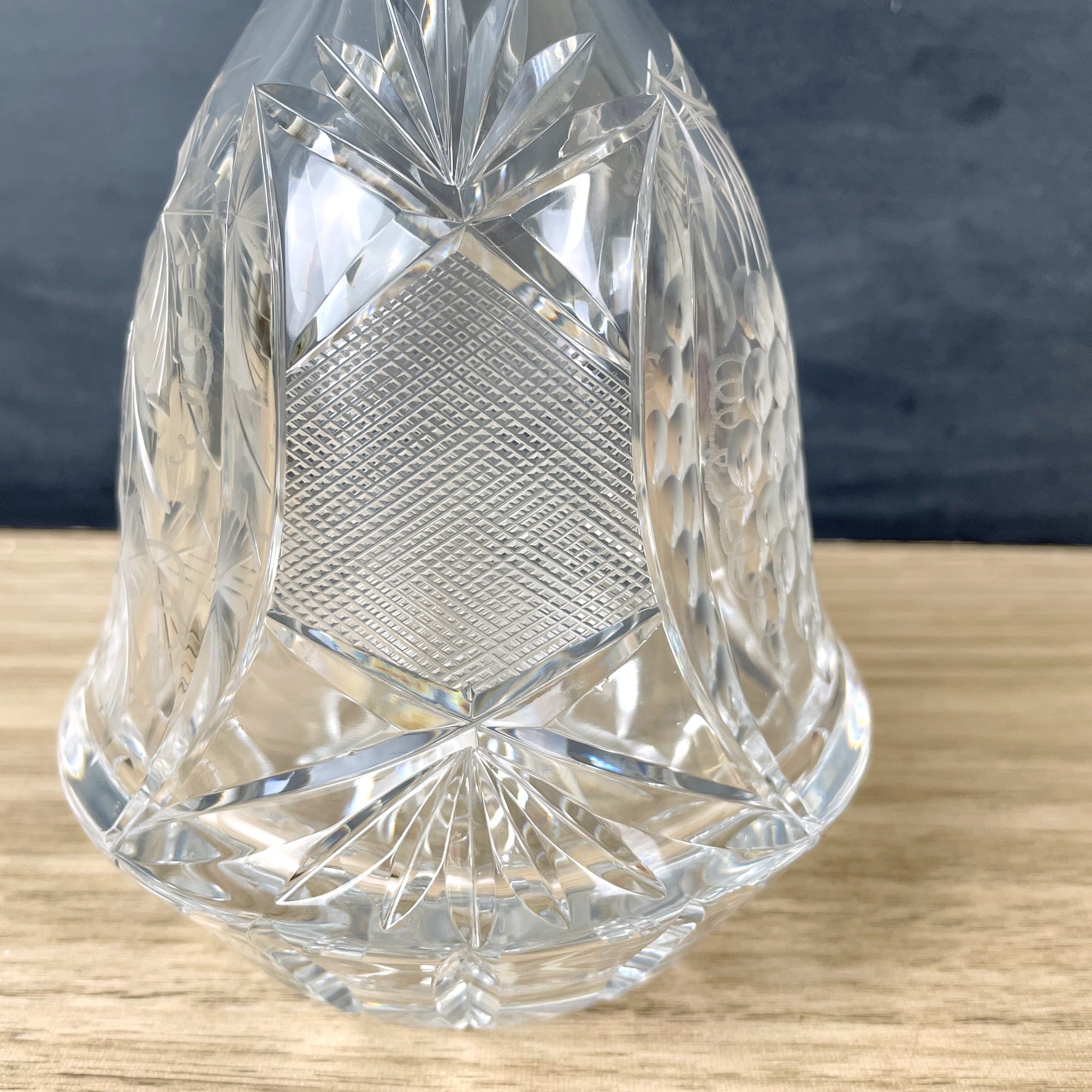 Antique liquor decanter with cut grapes and vines and a cut crosshatching. Paneled hexagonal stopper has a controlled bubble inside. Tall, elegant shape to show off your liquor.