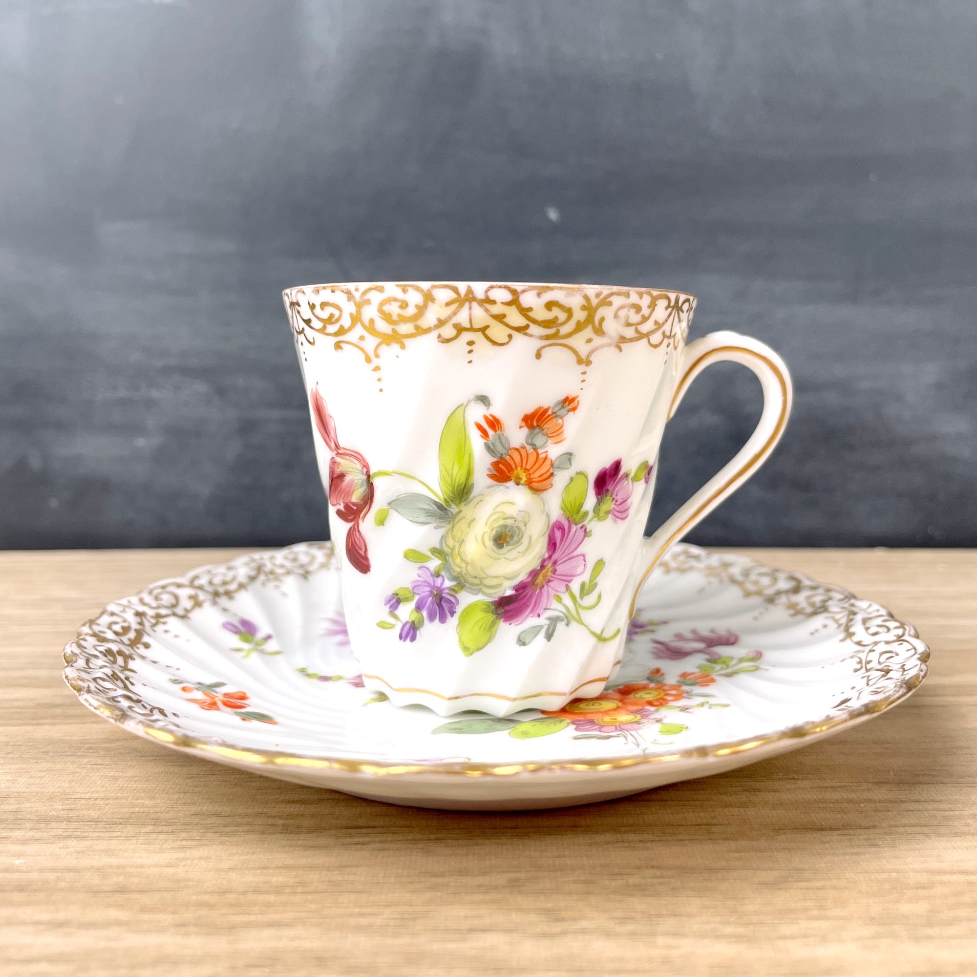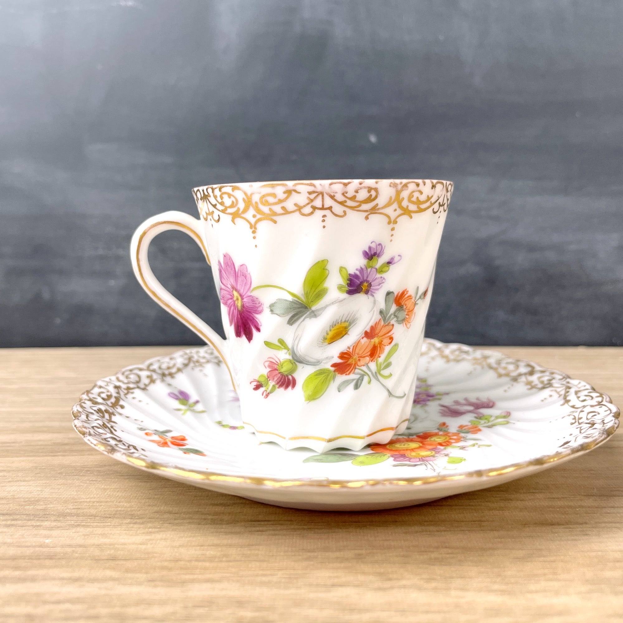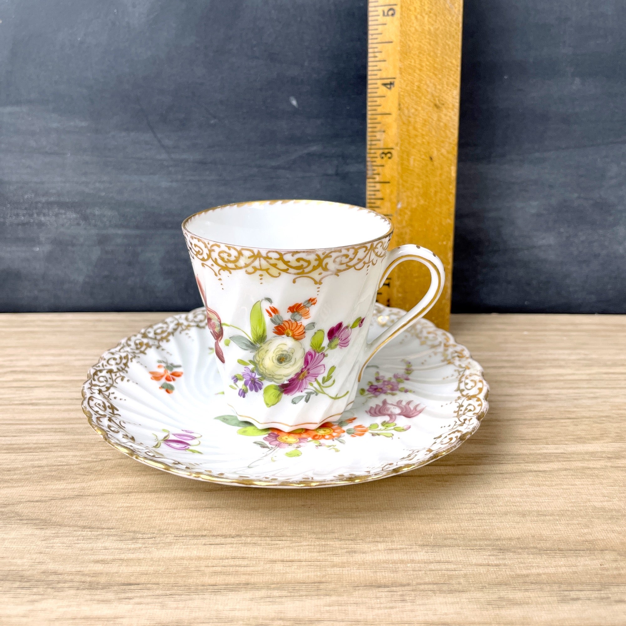 Hand painted floral demitasse cup and saucer. Hand signed Dresden with a crown. Fine European porcelain, exquisitely made. Best for display due to the crazing inside the cup.