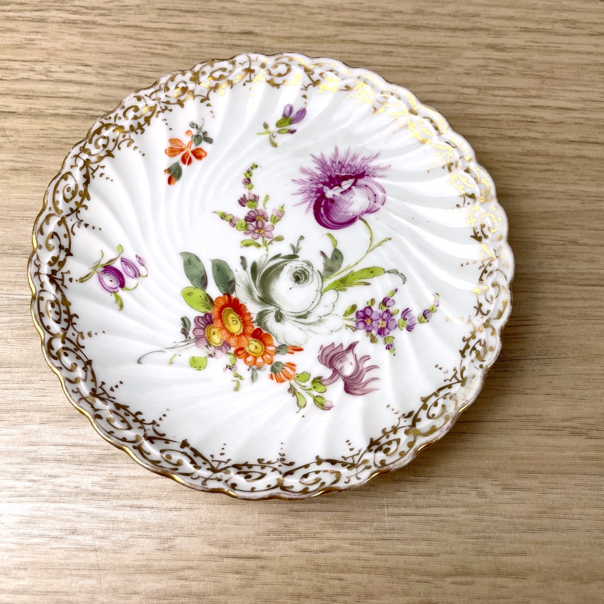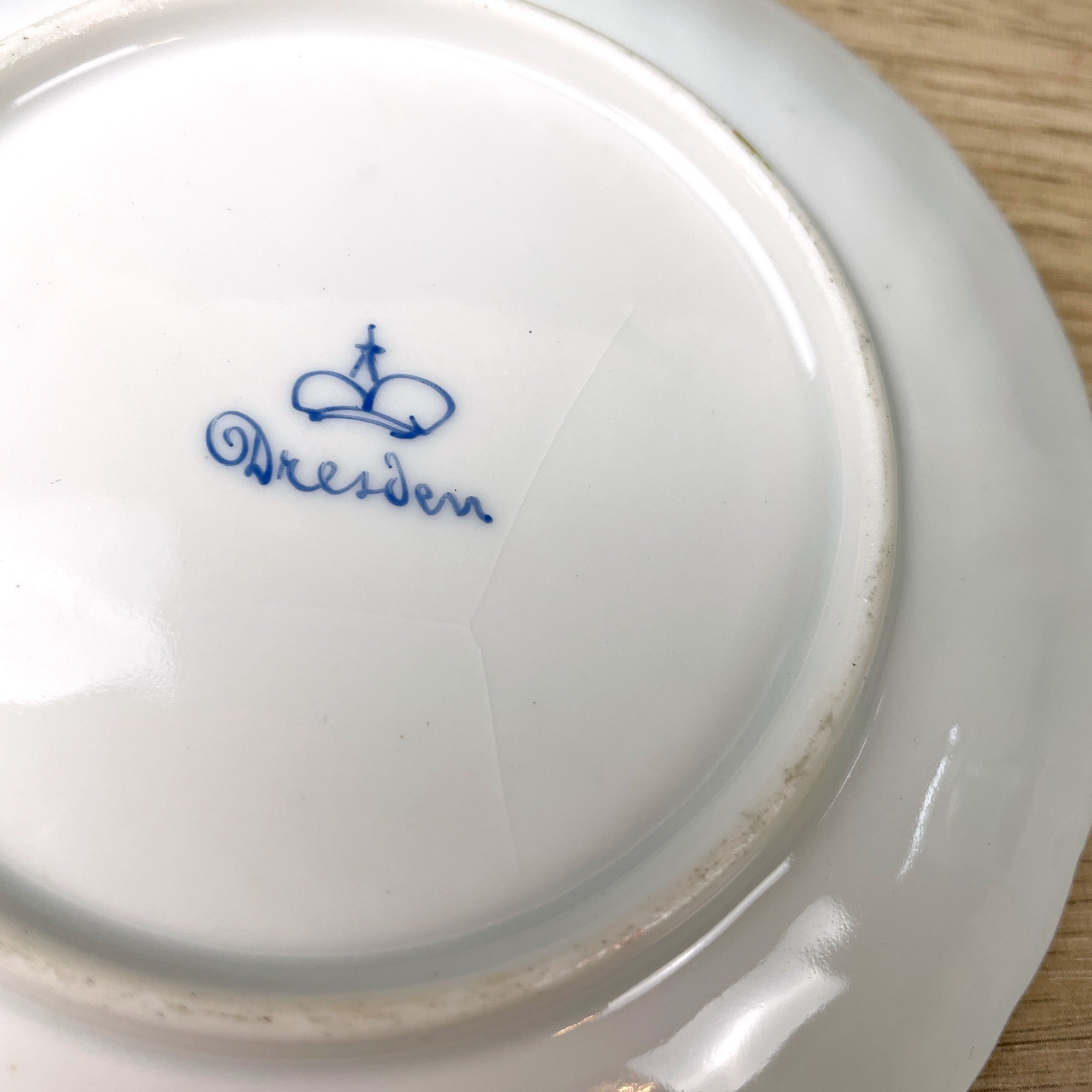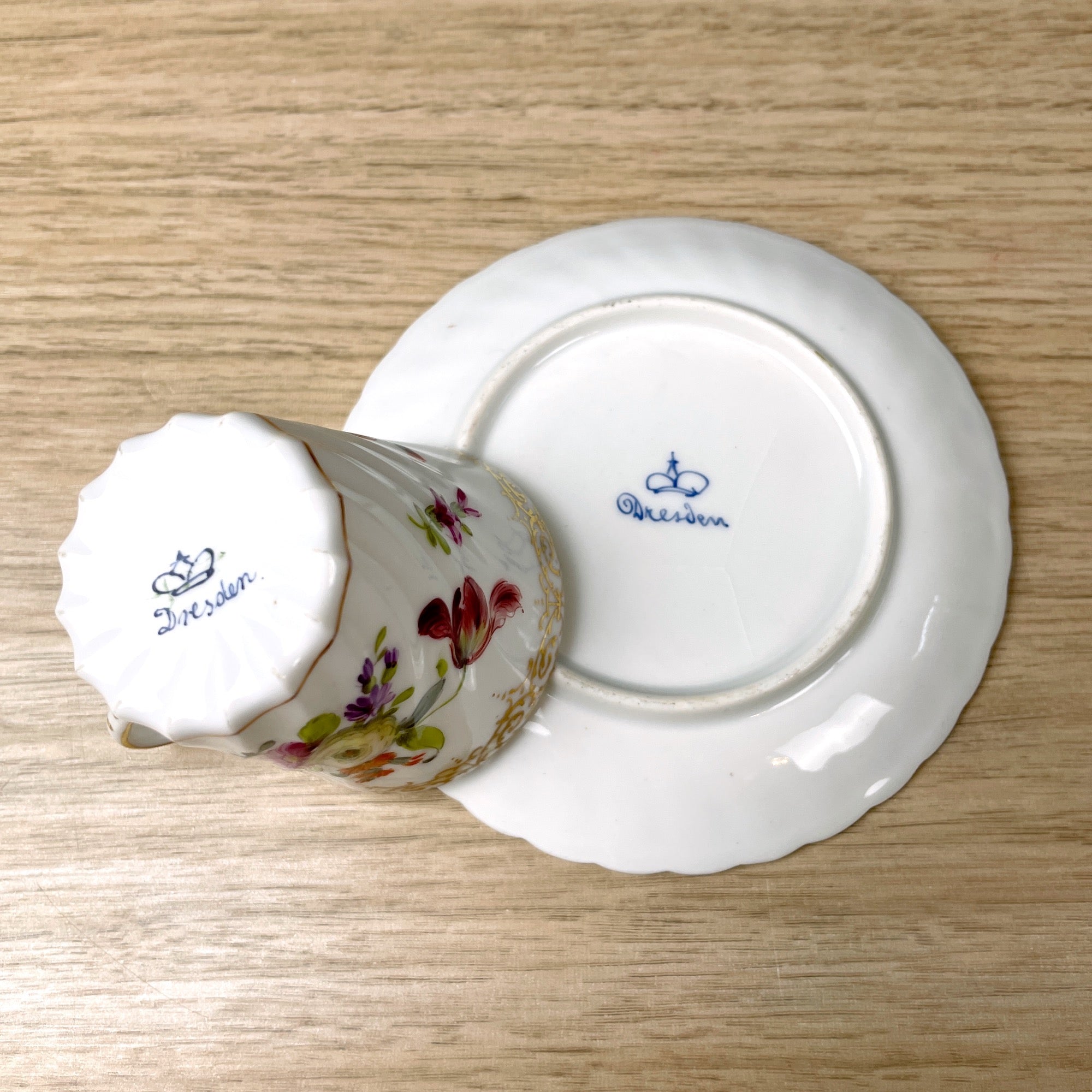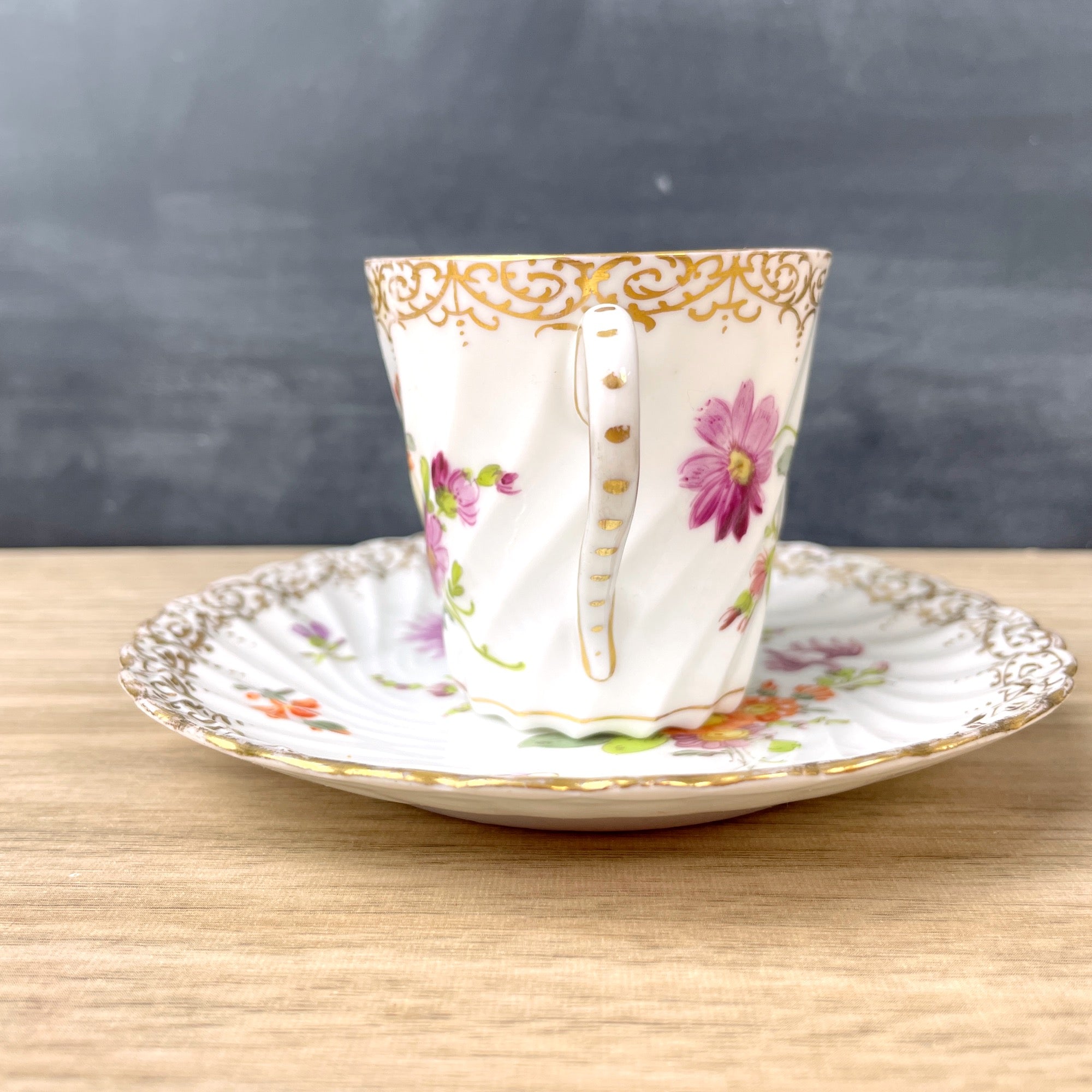 Hand painted floral demitasse cup and saucer. Hand signed Dresden with a crown. Fine European porcelain, exquisitely made. Best for display due to the crazing inside the cup.