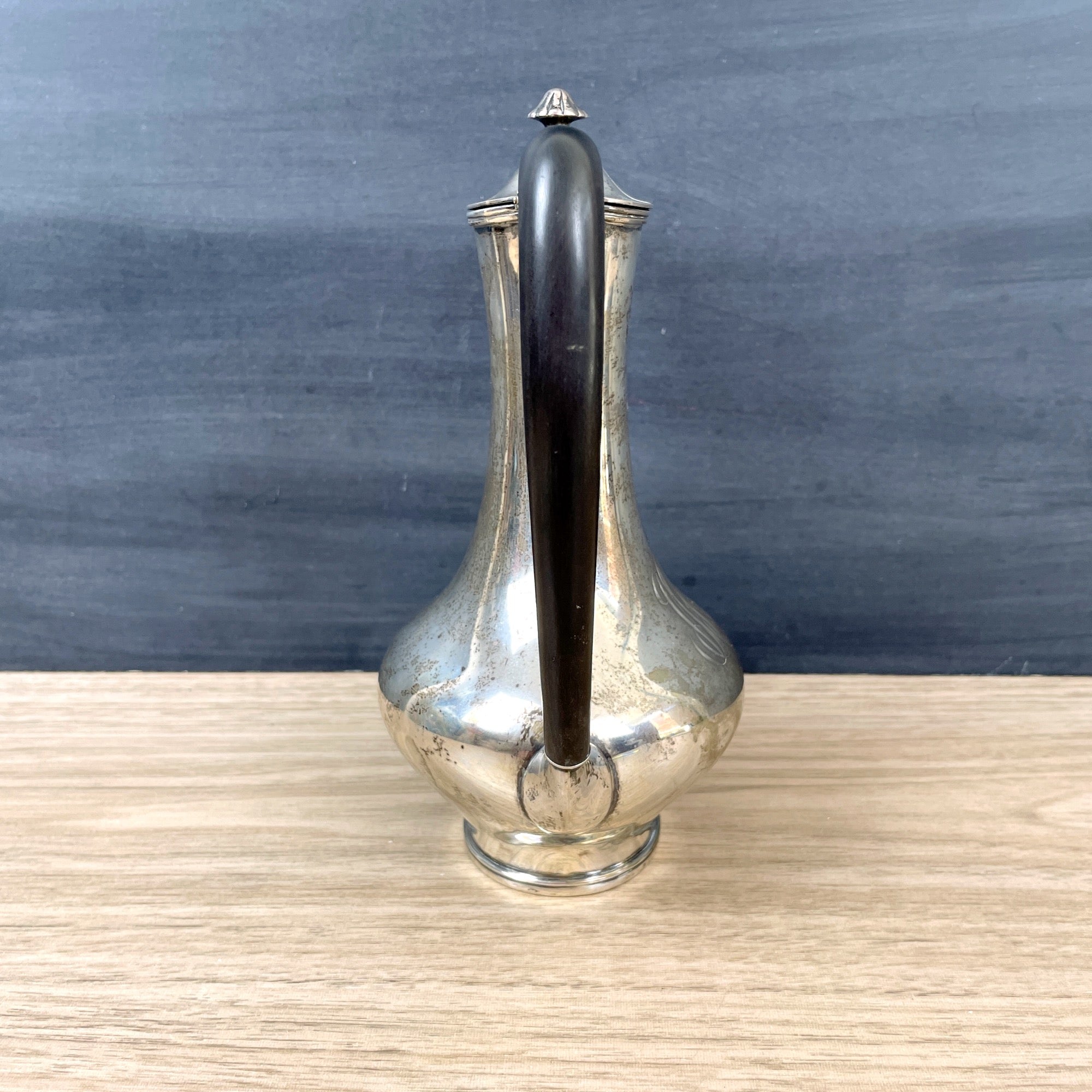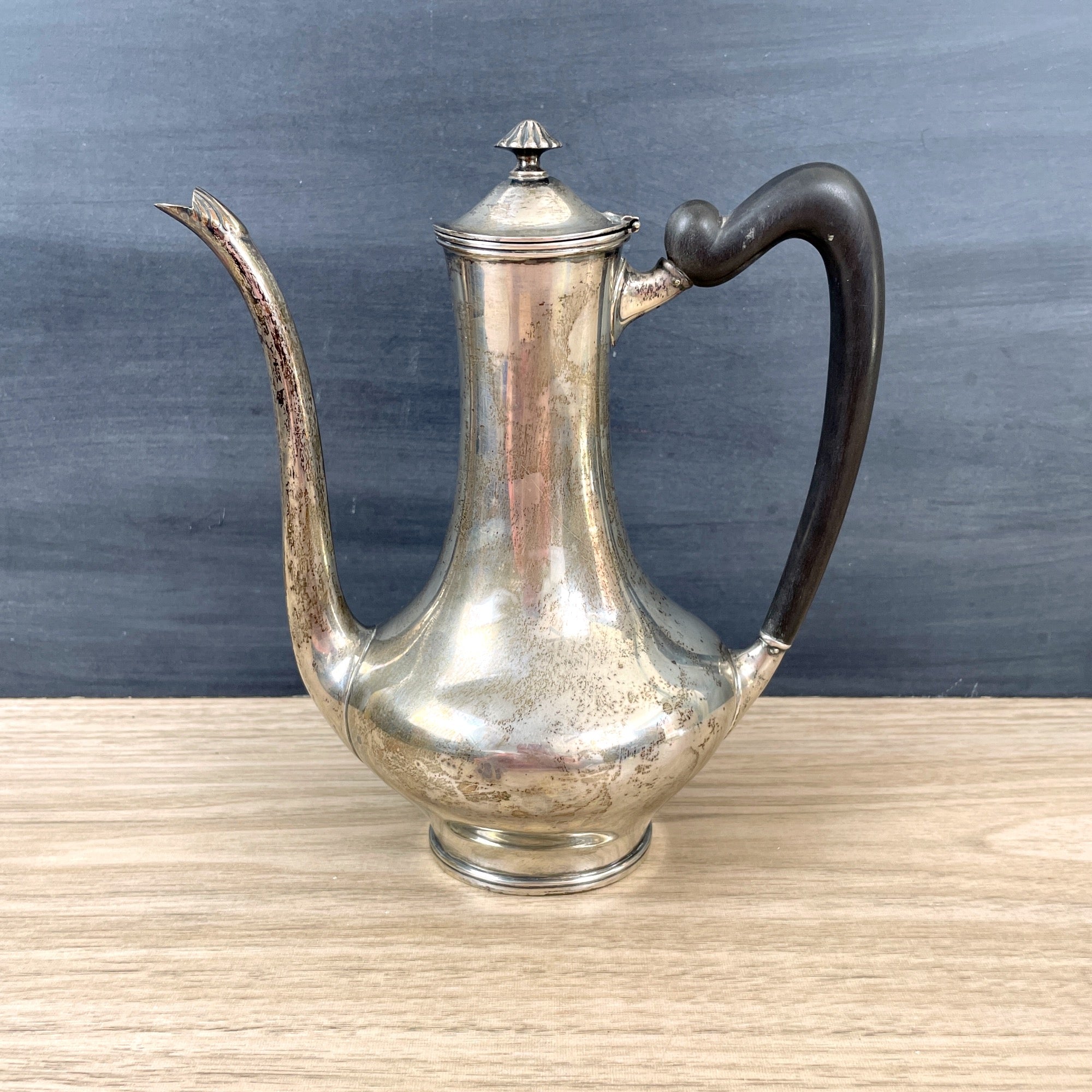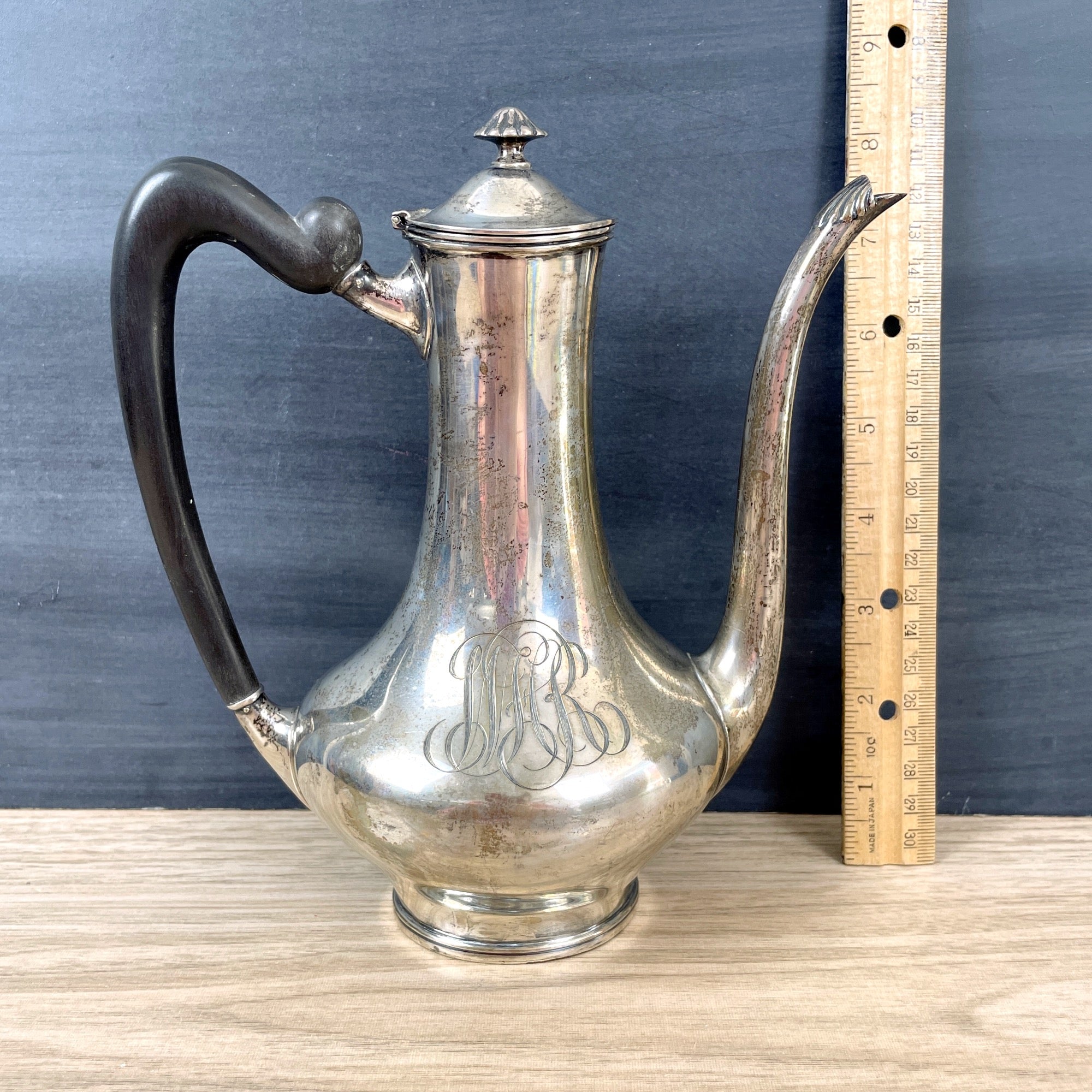 Amazing and rare small sterling silver coffee pot with a wooden handle with a fancy monogram (unable to decipher). Made by the Newburyport Silver Co of Keene, NH, which was in production from 1905-1914.
