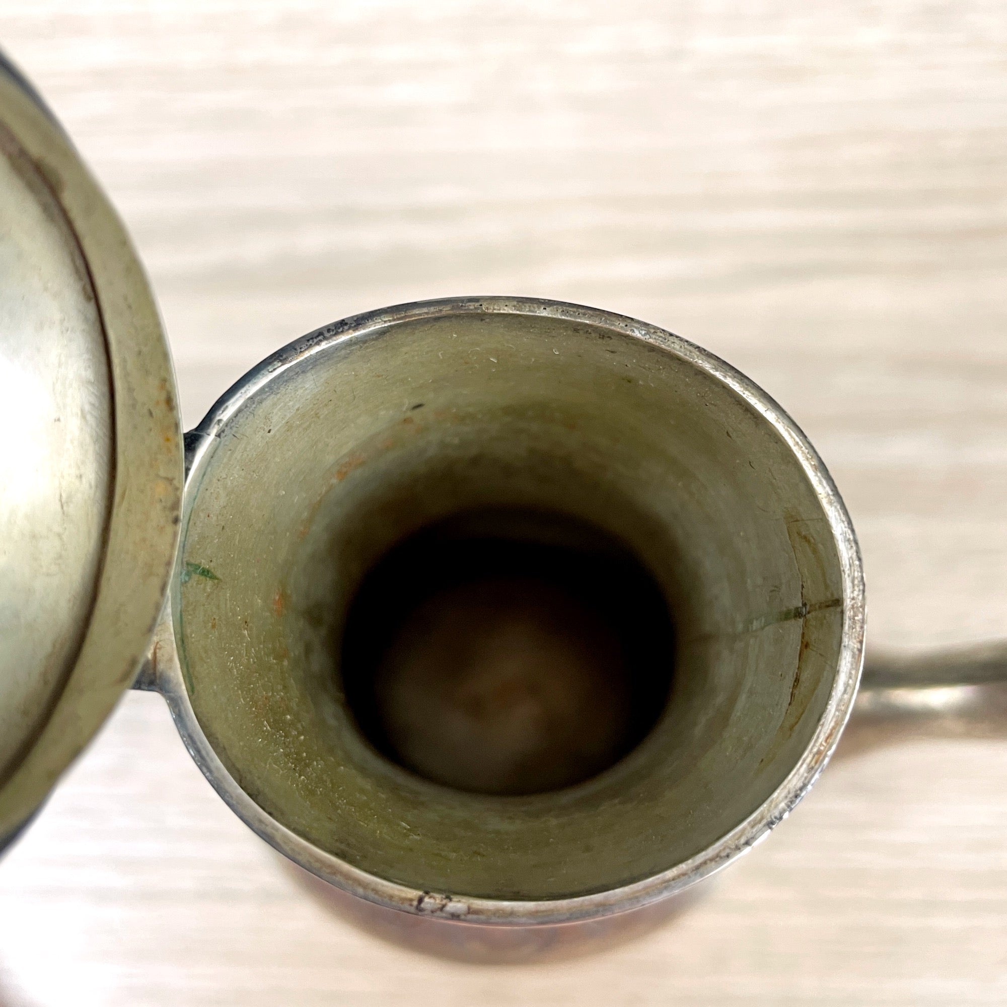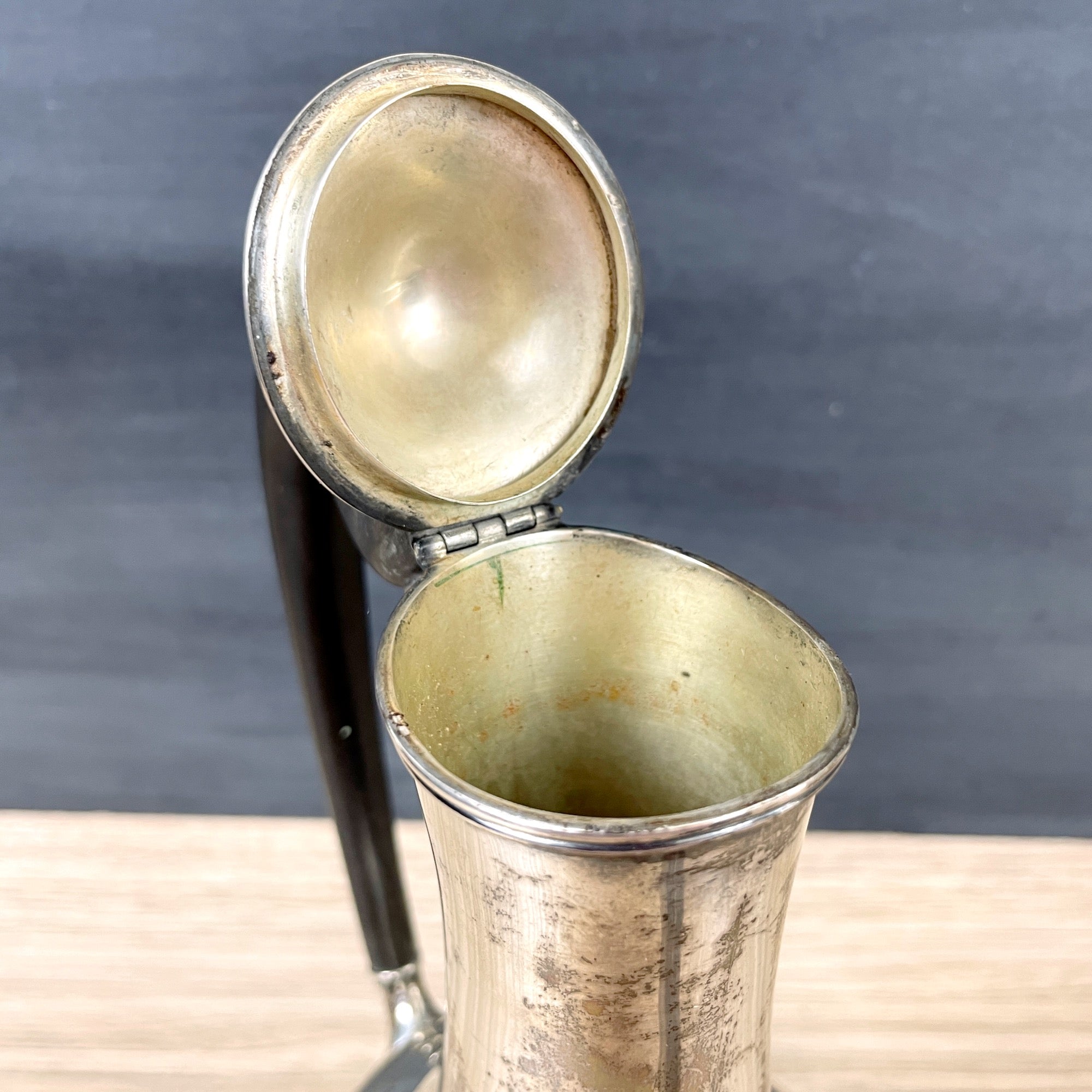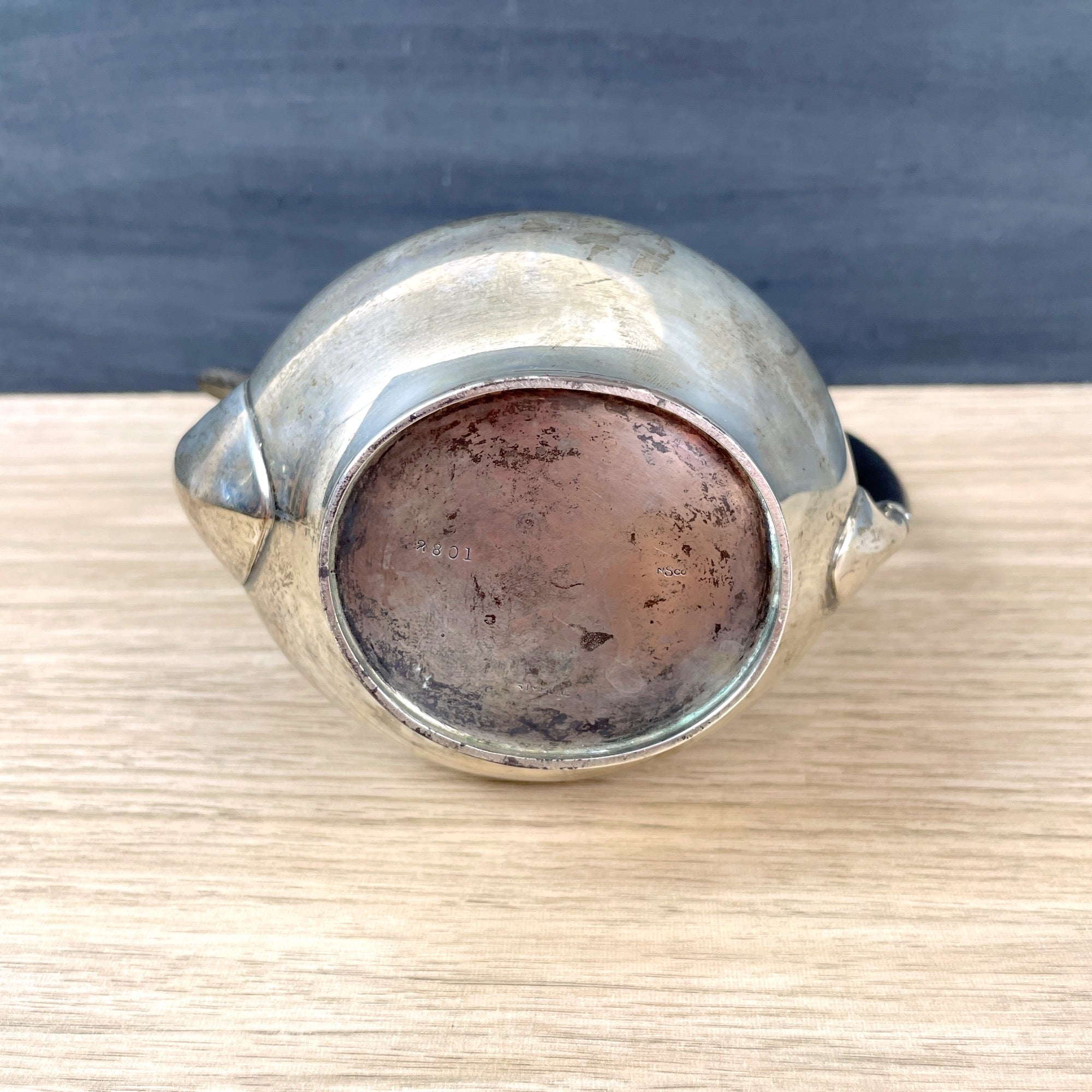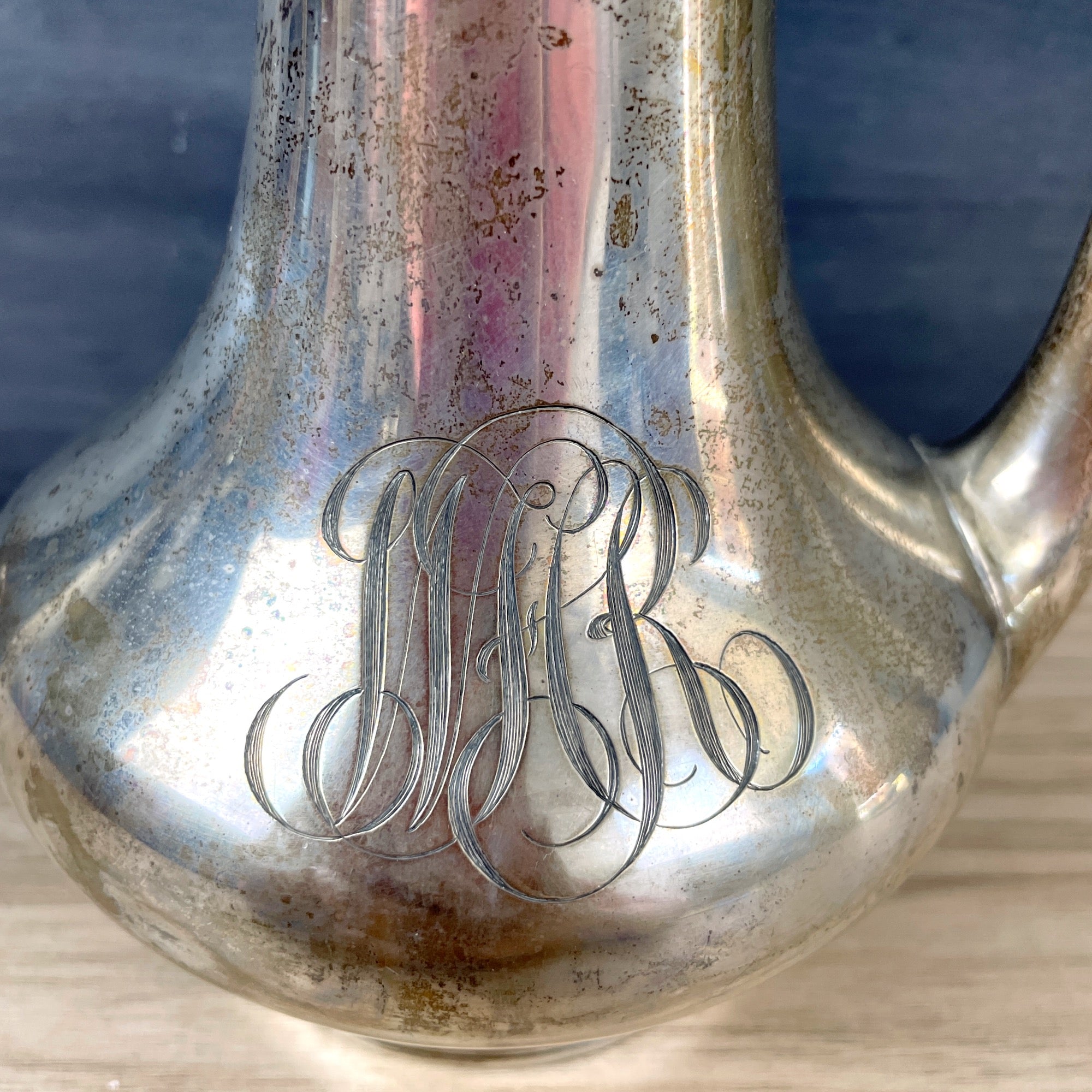Amazing and rare small sterling silver coffee pot with a wooden handle with a fancy monogram (unable to decipher). Made by the Newburyport Silver Co of Keene, NH, which was in production from 1905-1914.