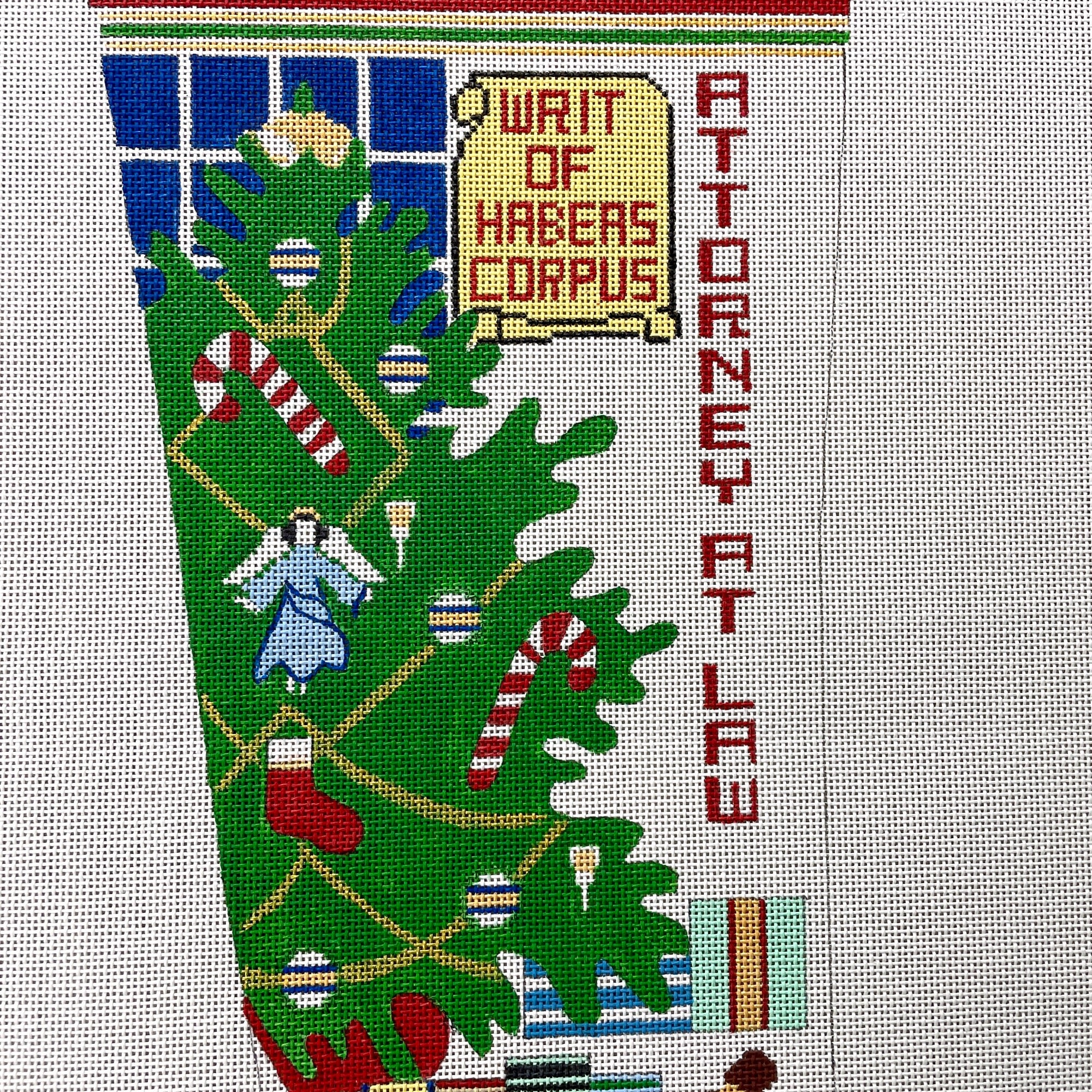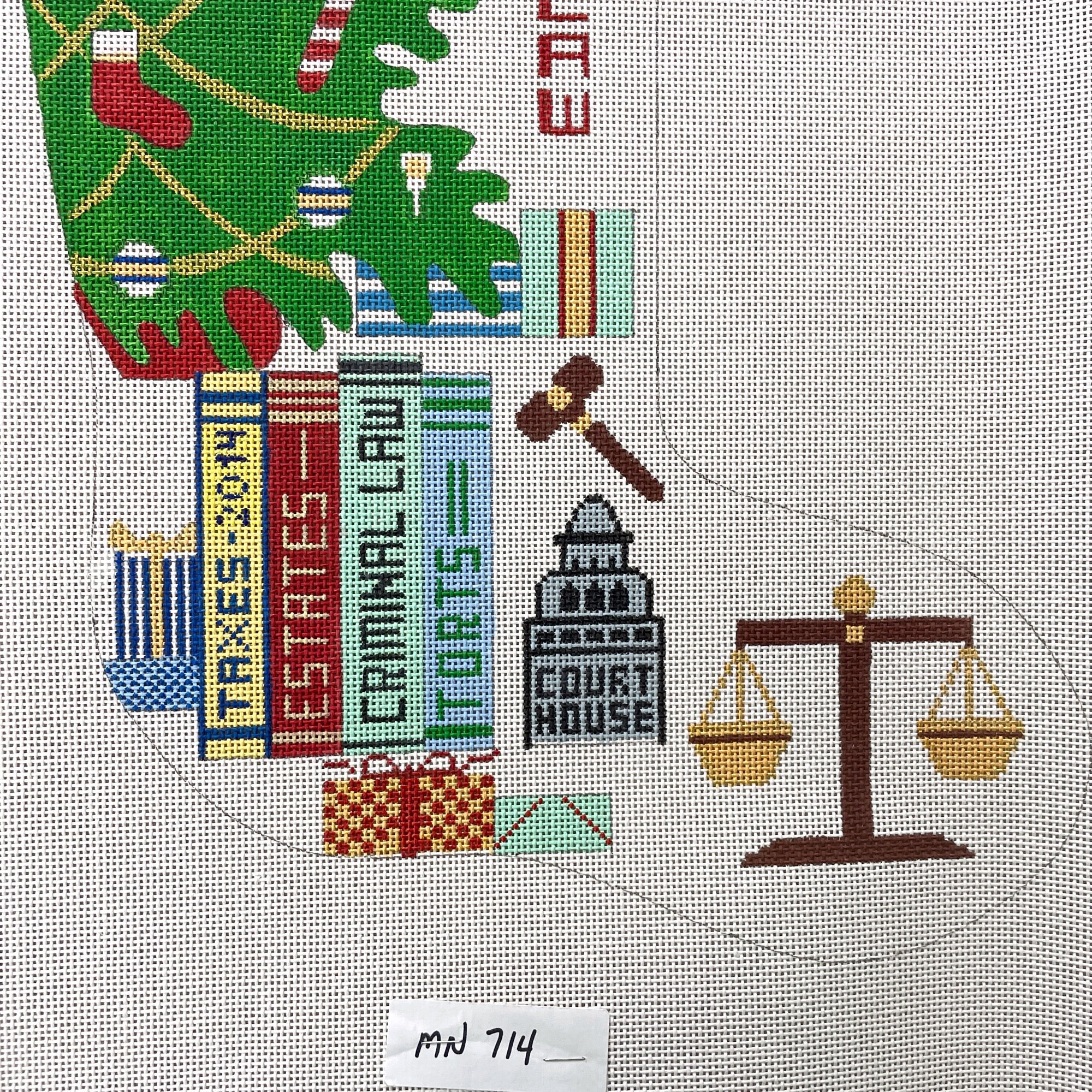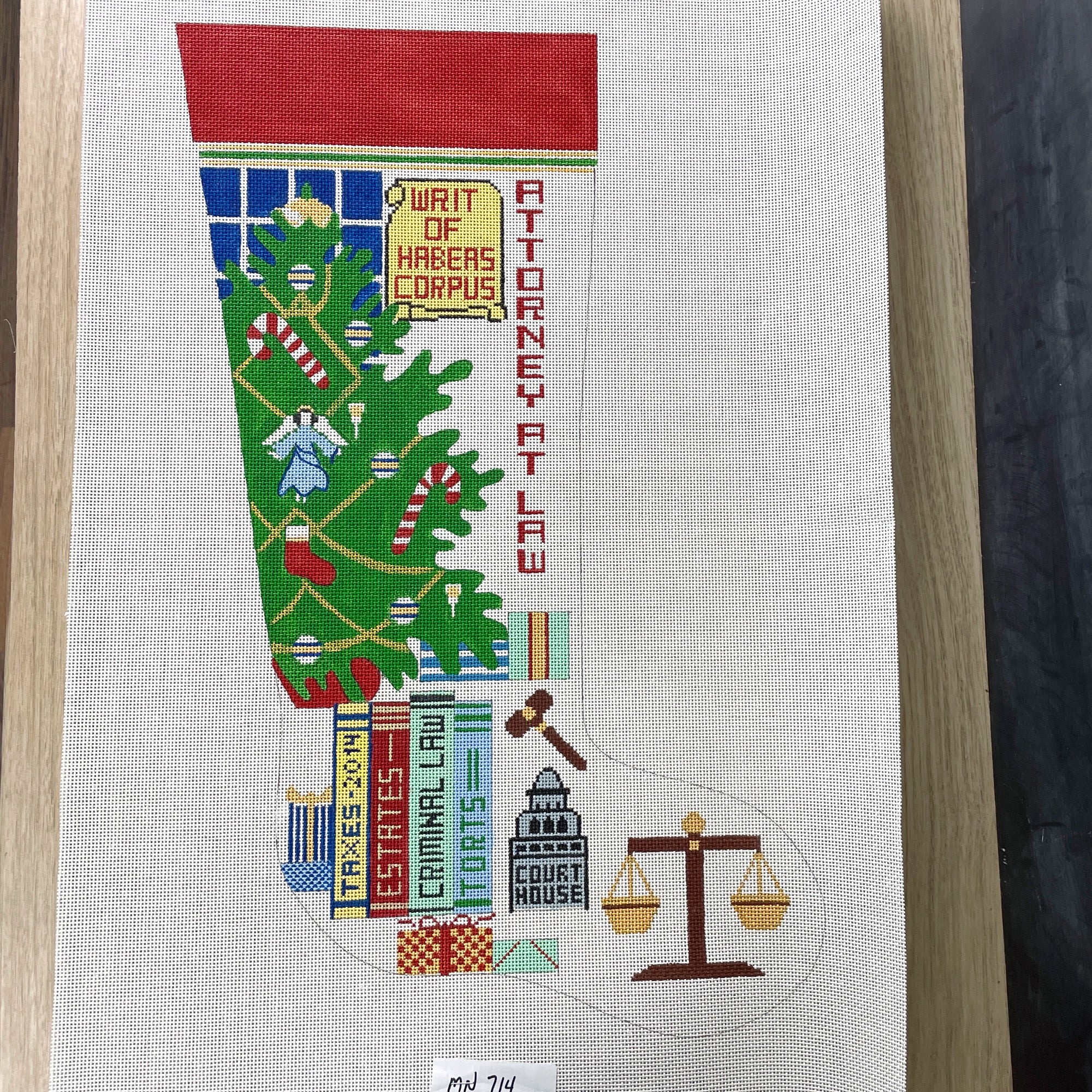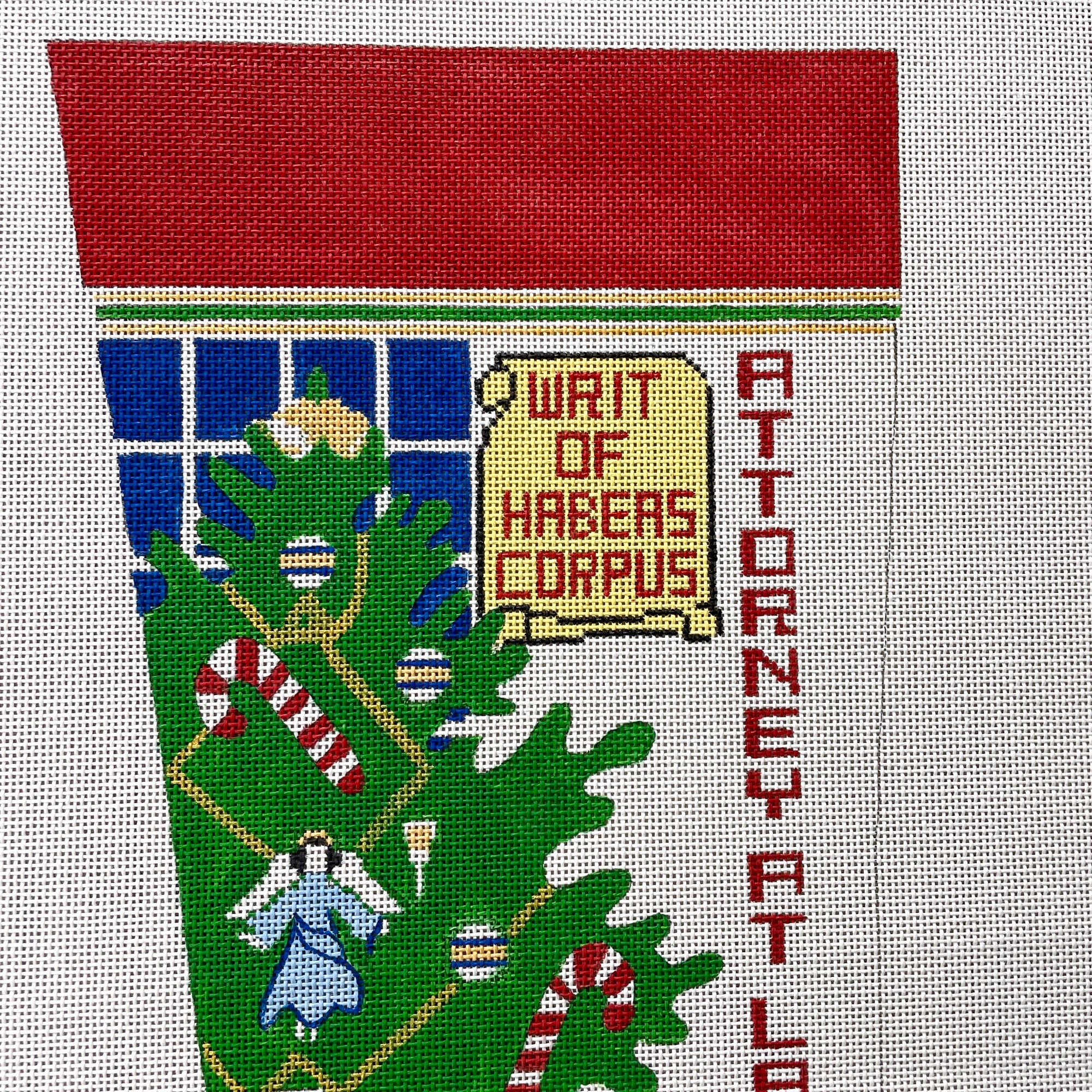 Handpainted needlepoint canvas to stitch up stocking for your favorite Attorney at Law. From Magic Needle #MN714 (or Gone Stitching #GS747). Retail $215.