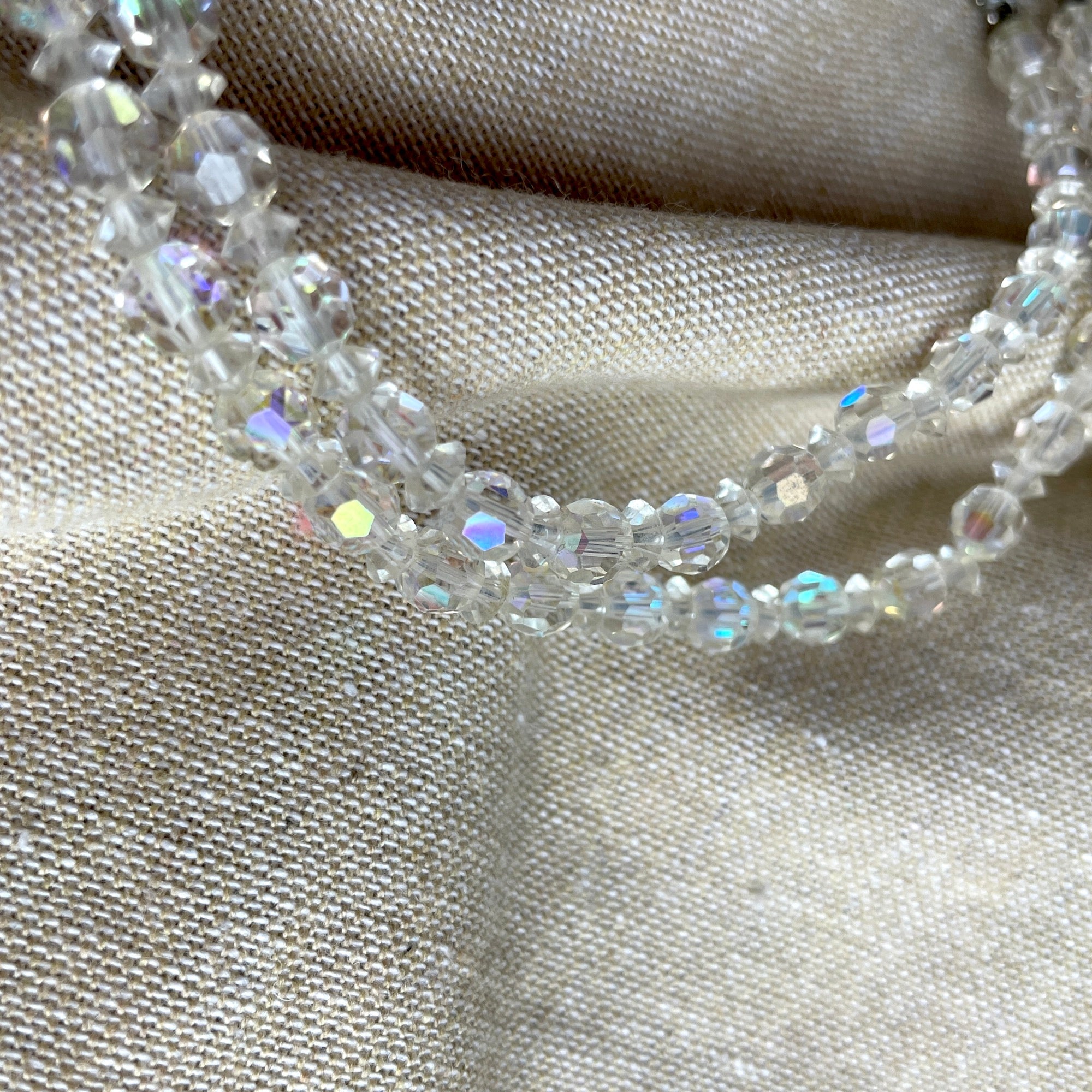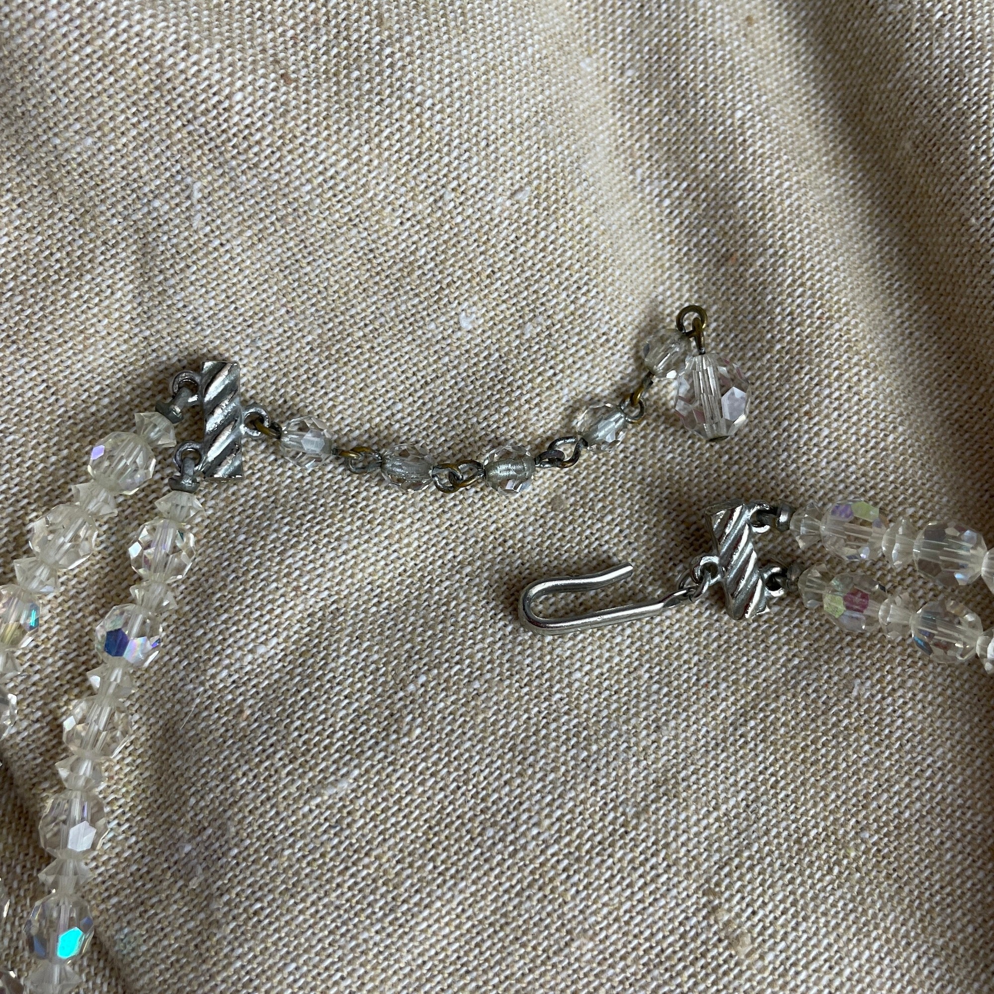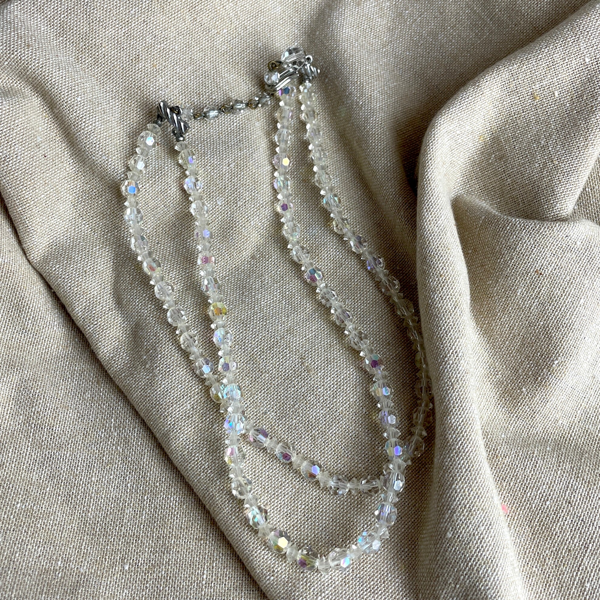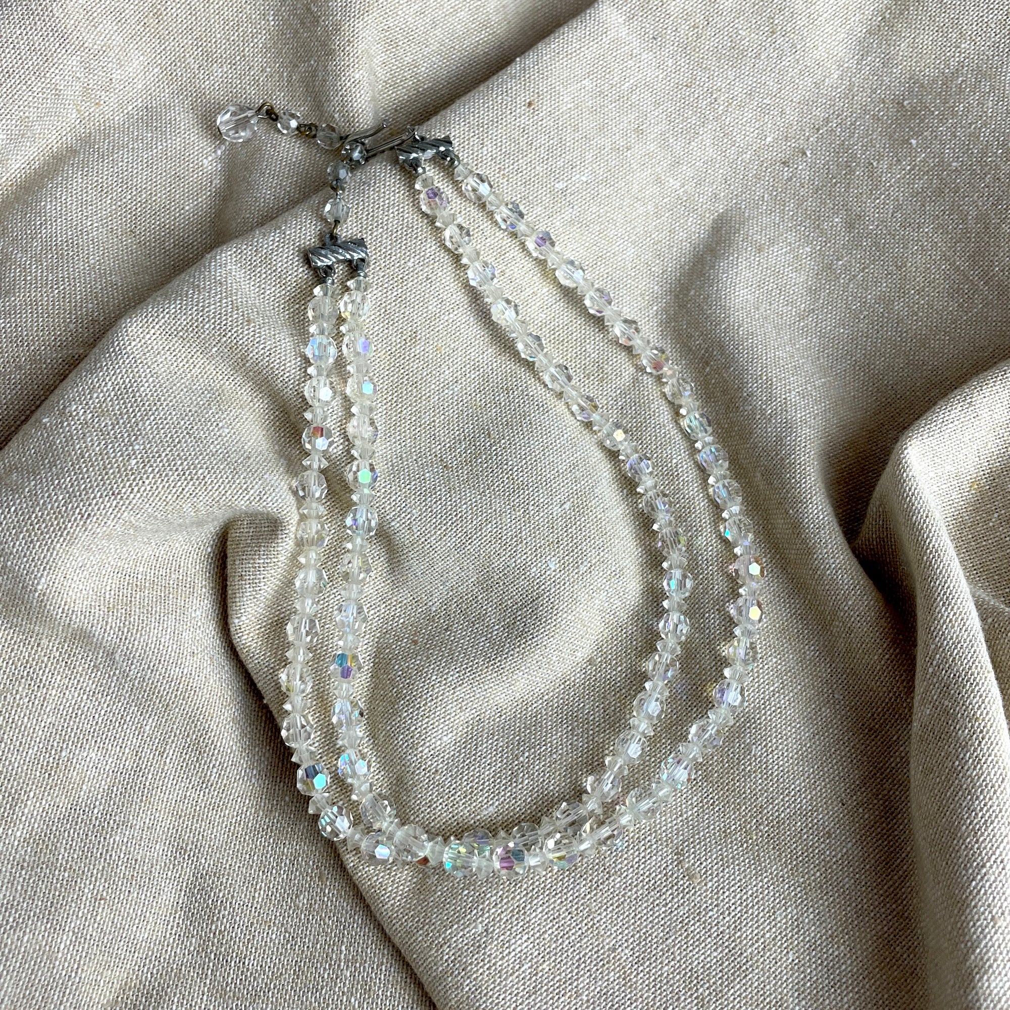 Vintage crystal necklace with aurora borealis sparkle. Two strands with hook clasp and extender. Short choker length. All beads are the same size.