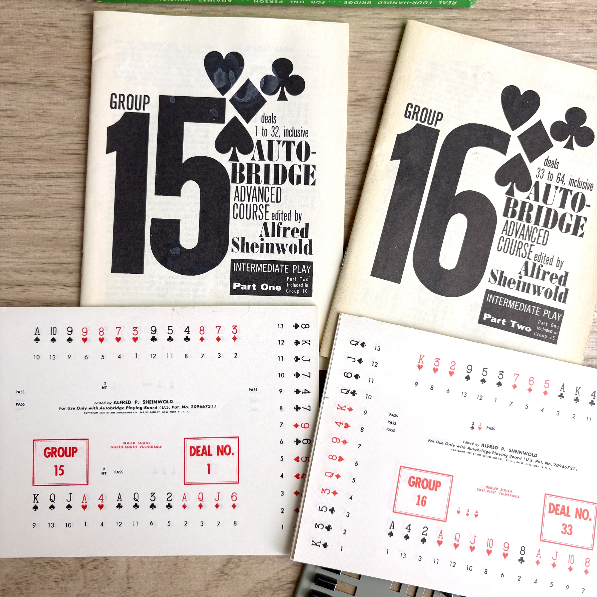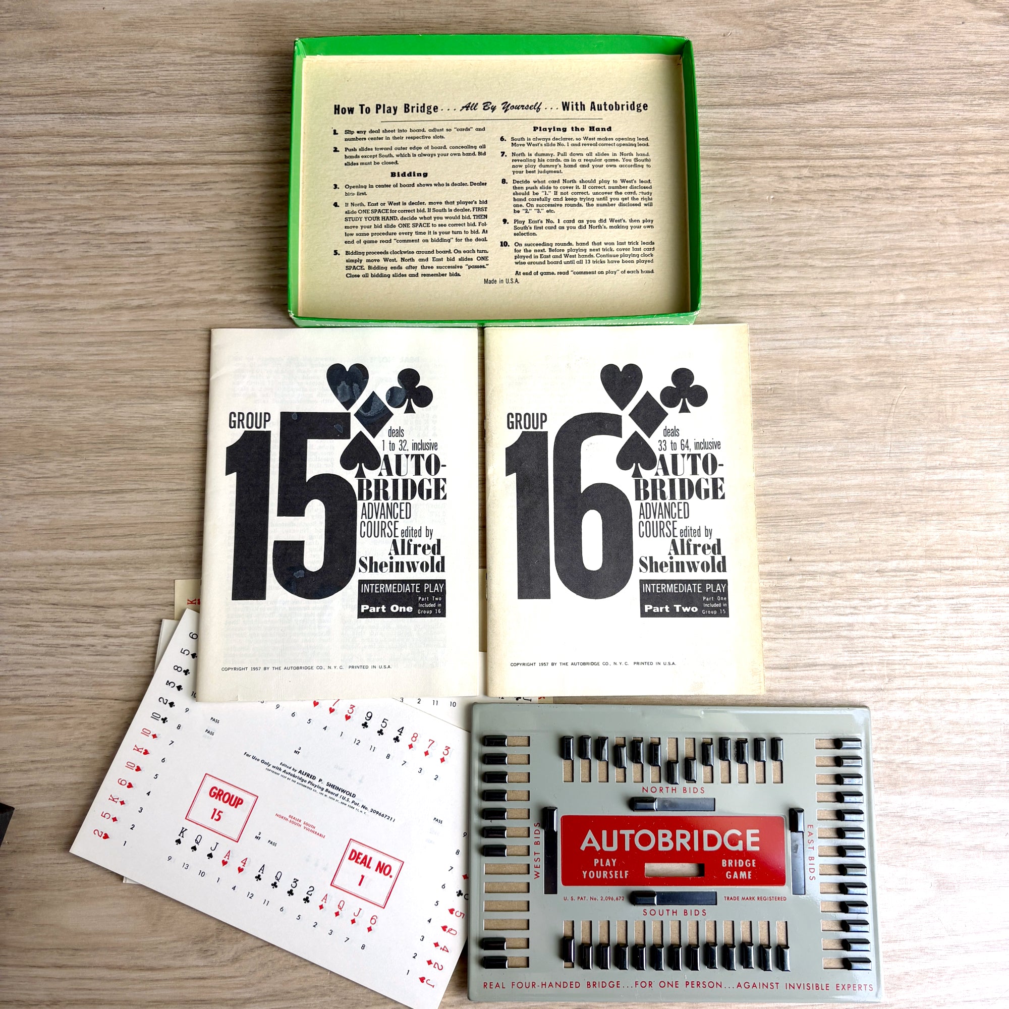 Vintage AutoBridge PGA Advanced Set game includes the playing board, 2 pads of deal sheets, and 1957 Group 15 and Group 16 AutoBridge Advanced Course booklets, edited by Alfred Sheinwold. Instructions are printed on the inside lid of the box.
