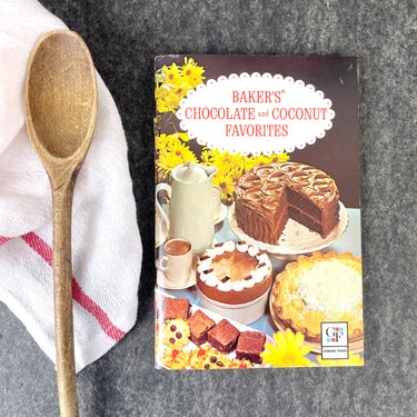 "Baker's Chocolate and Coconut Favorites" 1977 7th edition paperback cookbooklet with saddle staples from General Foods. Color and black and white photos.