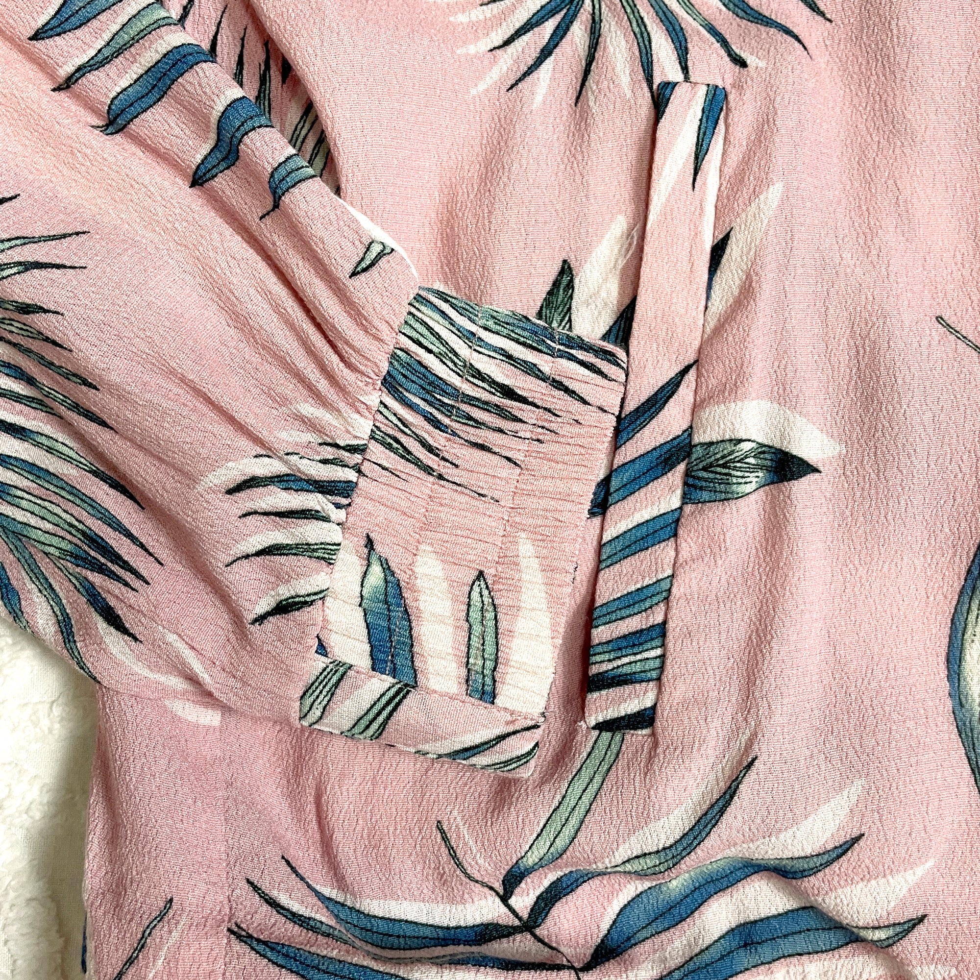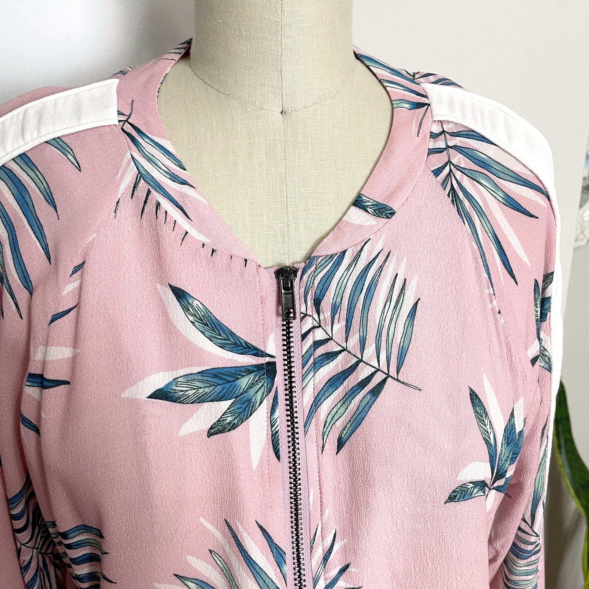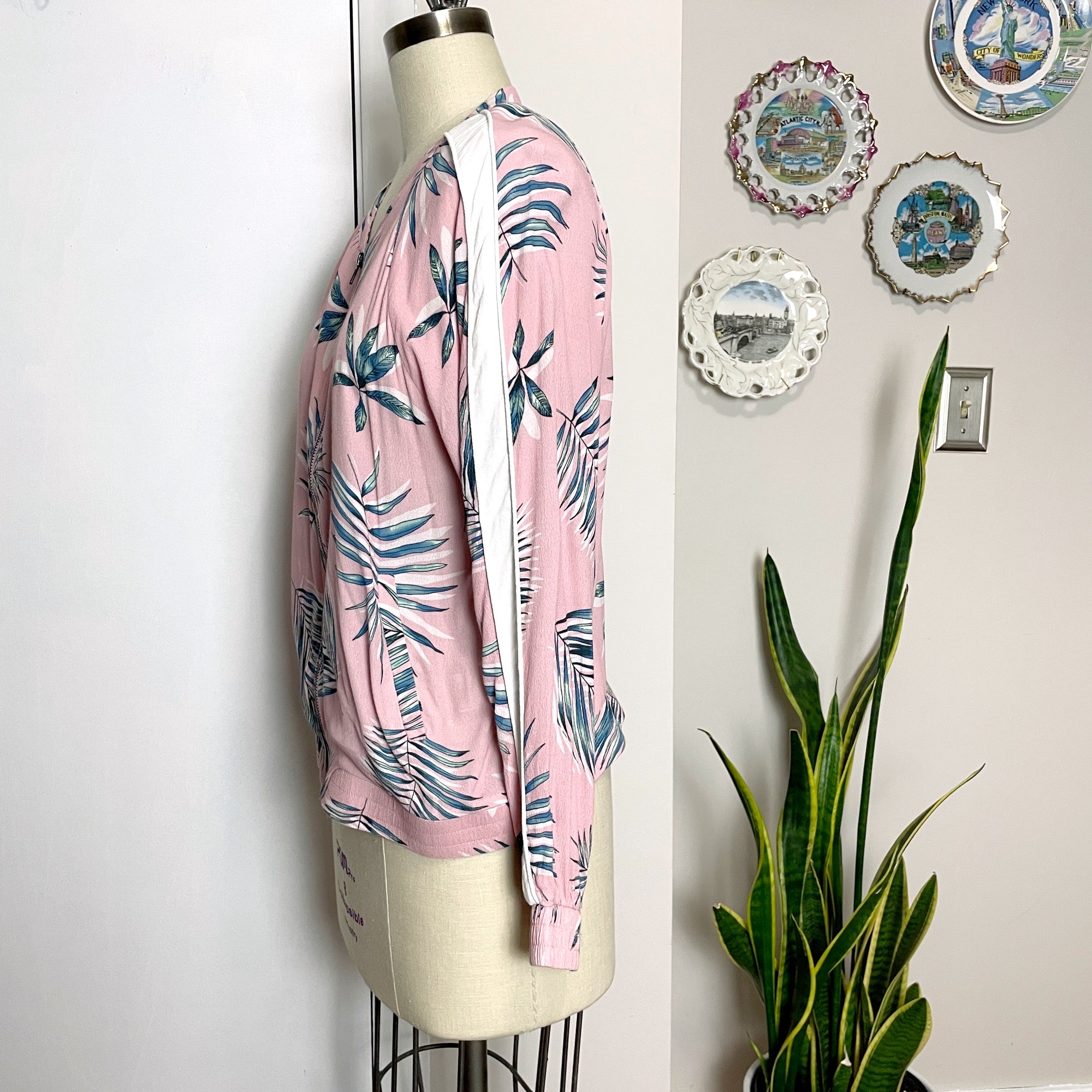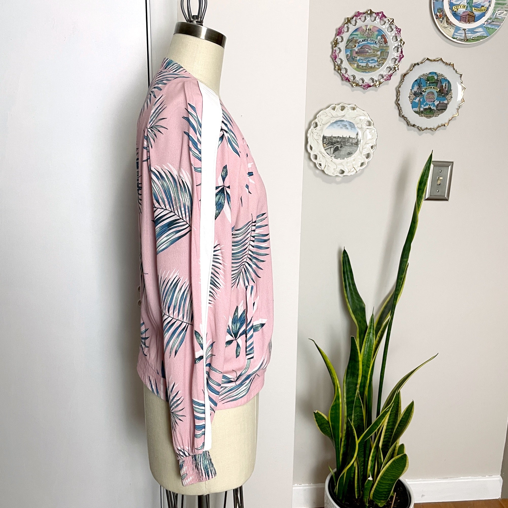 Baseball style jacket by BB Dakota. Luscious retro print of teal, blue and green palm leaves on a light rosy pink background with cream accents. Cream stripes down the raglan sleeves. Front metal zipper. Wide elastic at the waist. Round collar. Wide elastic cuffs. Two front pockets.