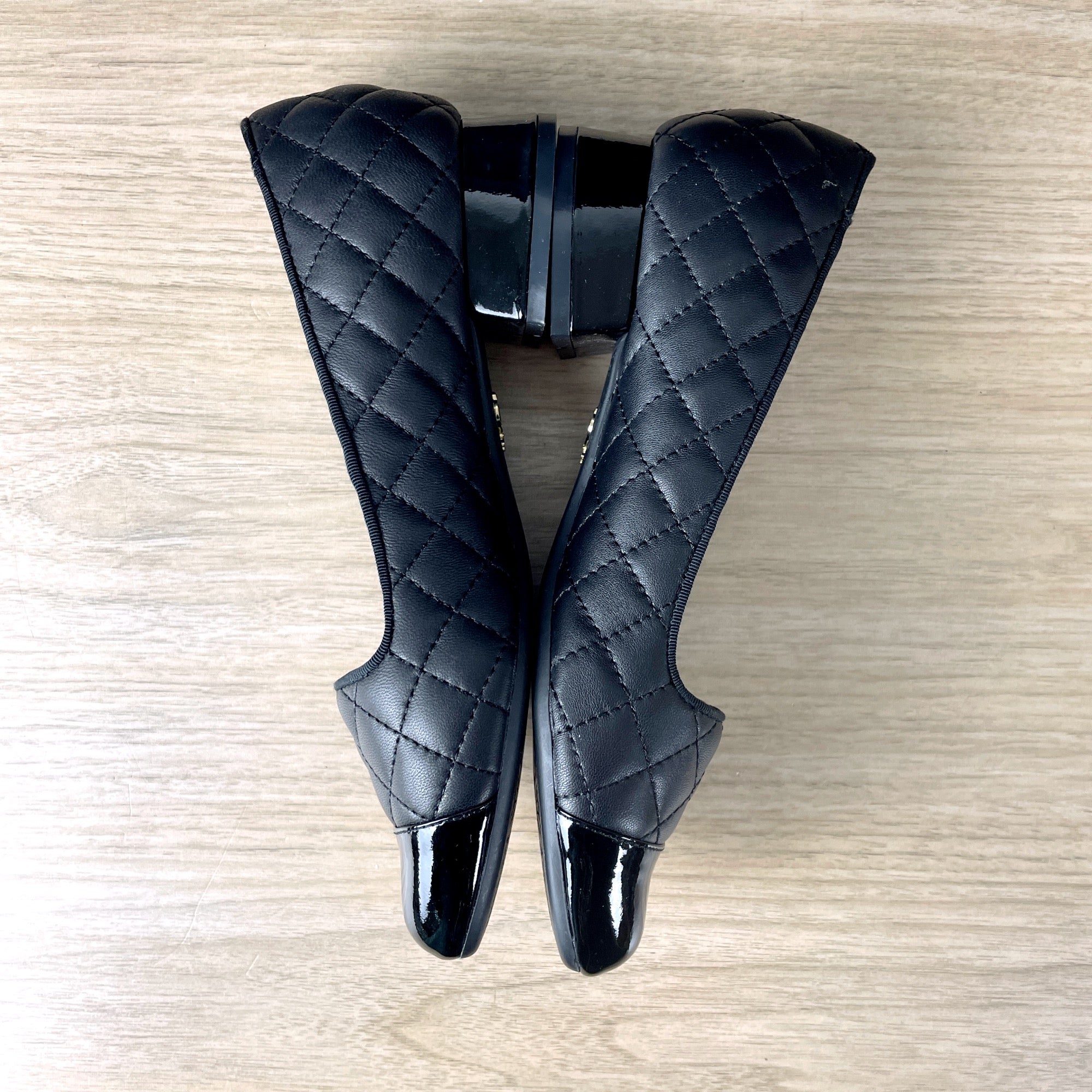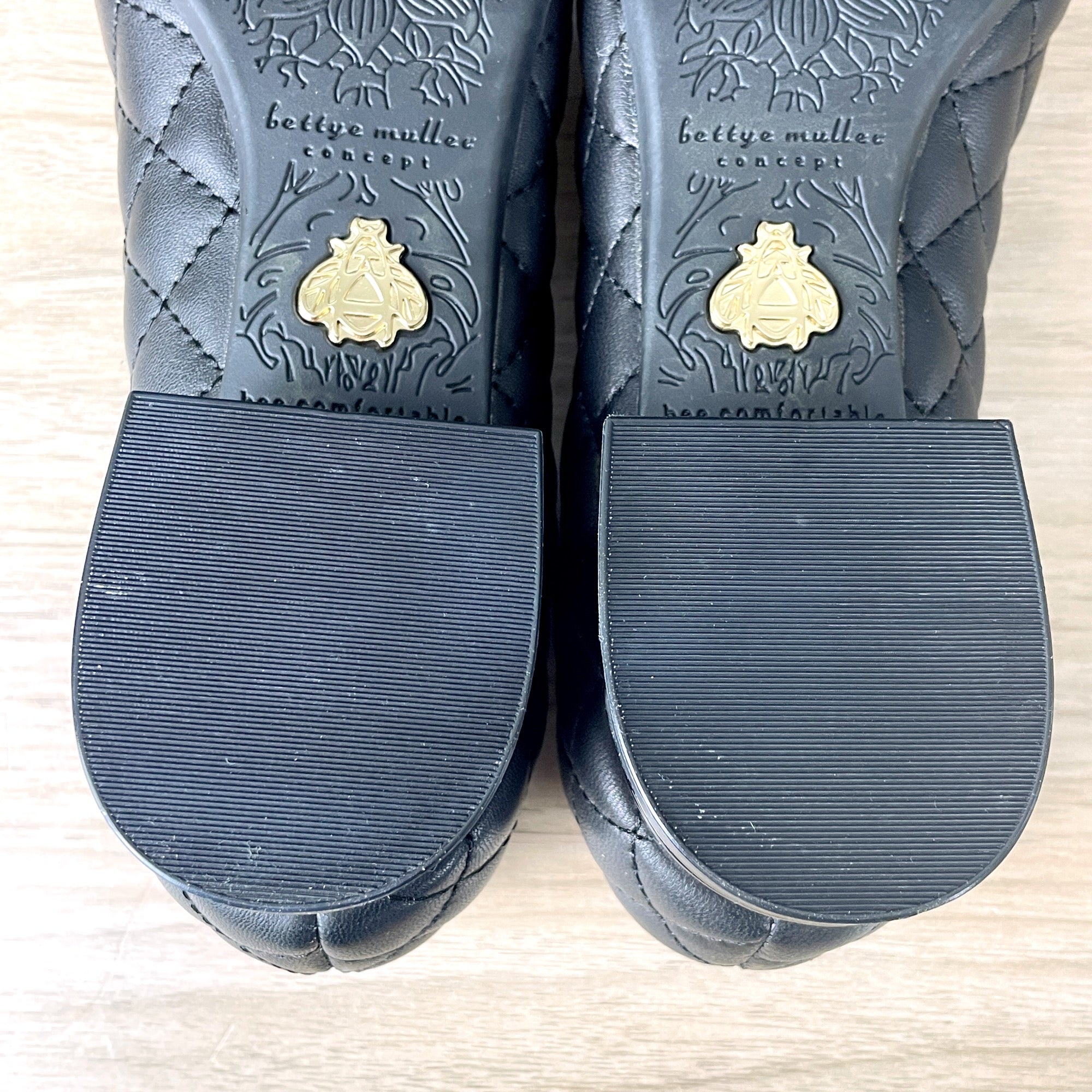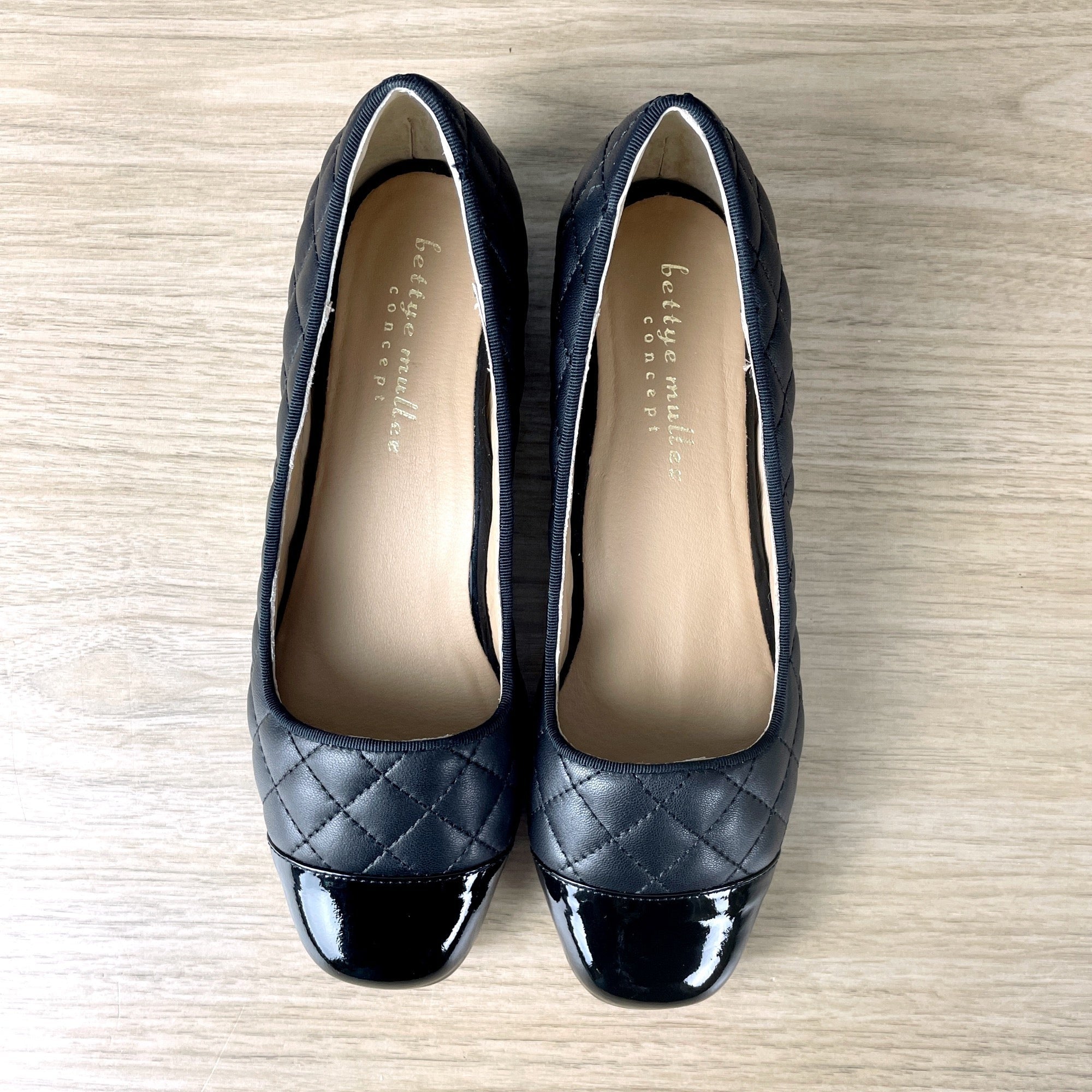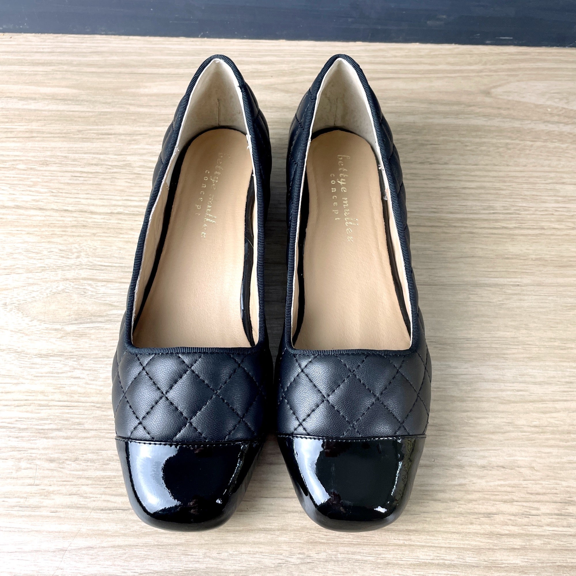 Like new pair of Bettye Muller Concept Greta black low heel pumps. Black quilted leather with patent leather toe and low block heel. Rubber soles. Flexible rubber sole. Leather lining.