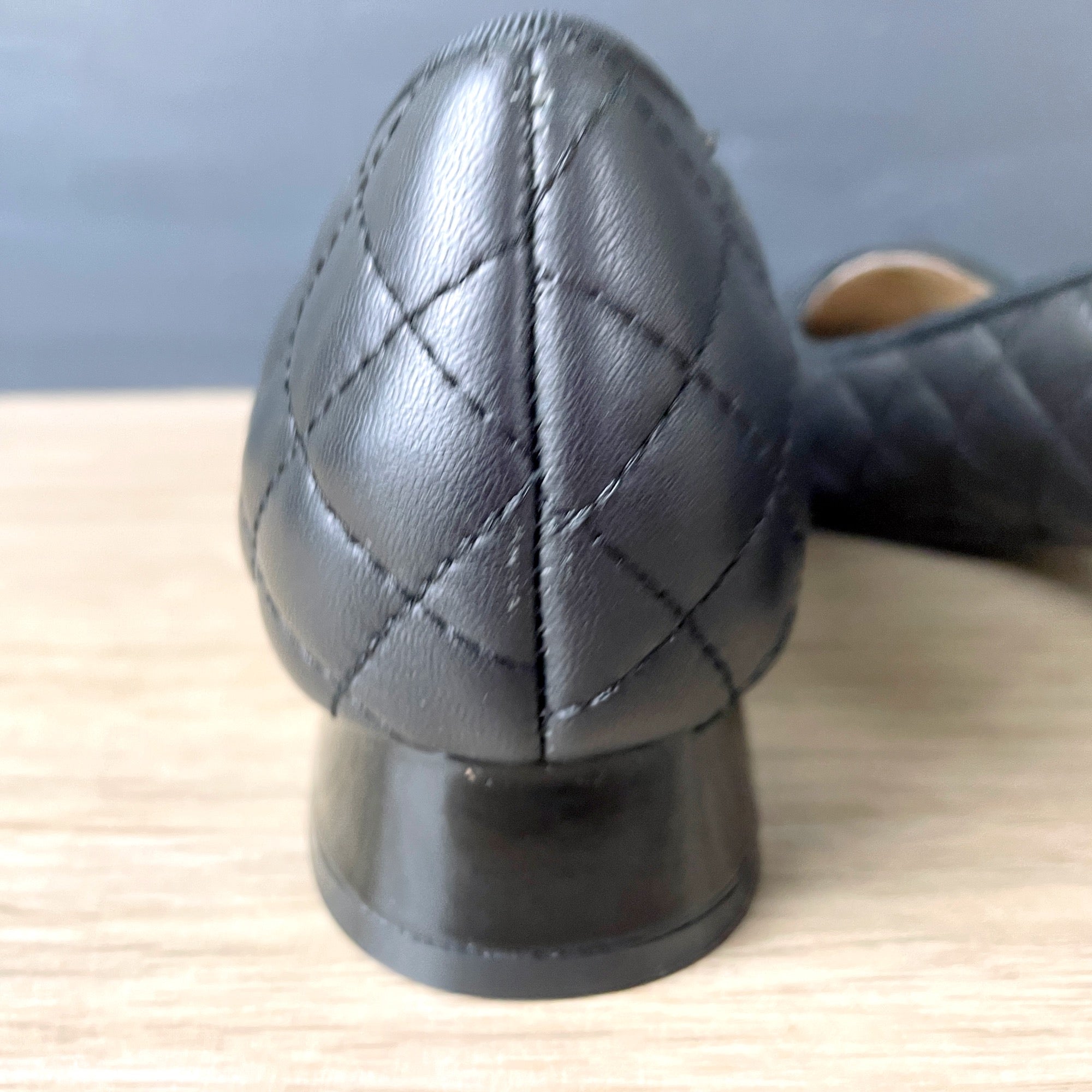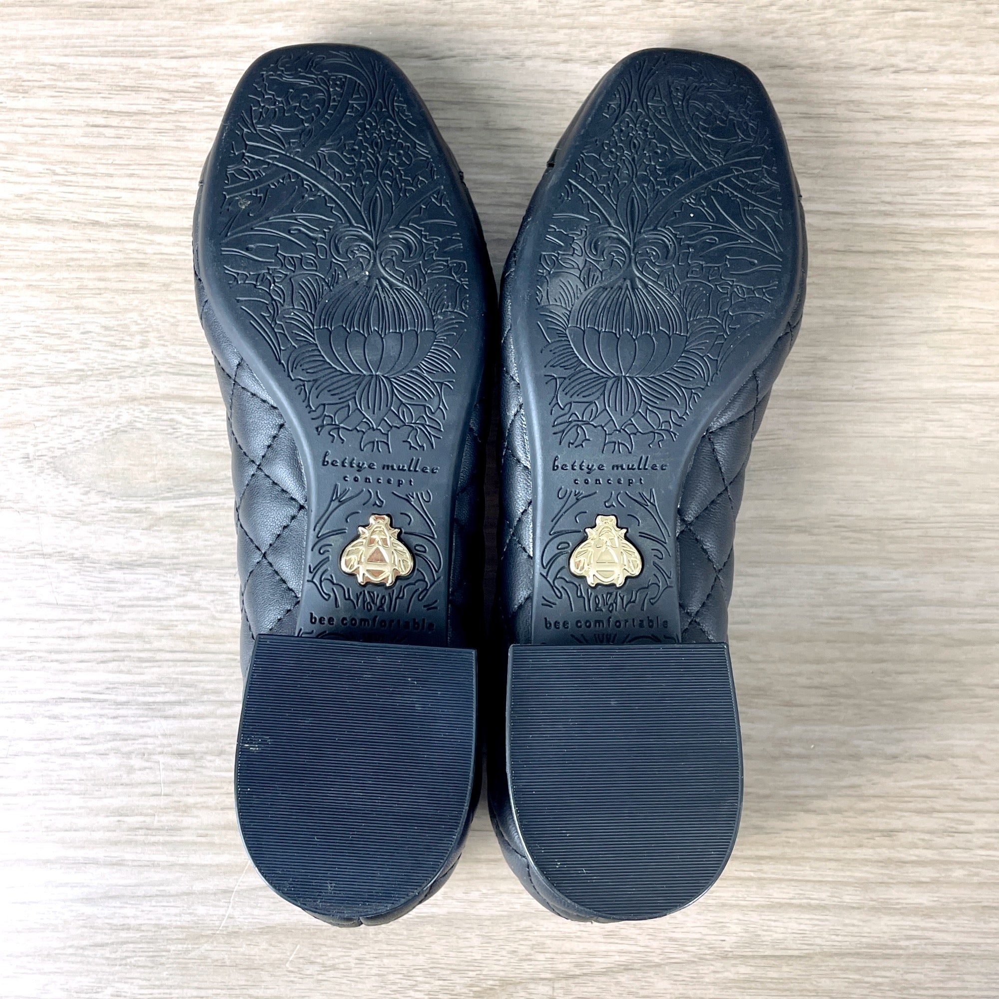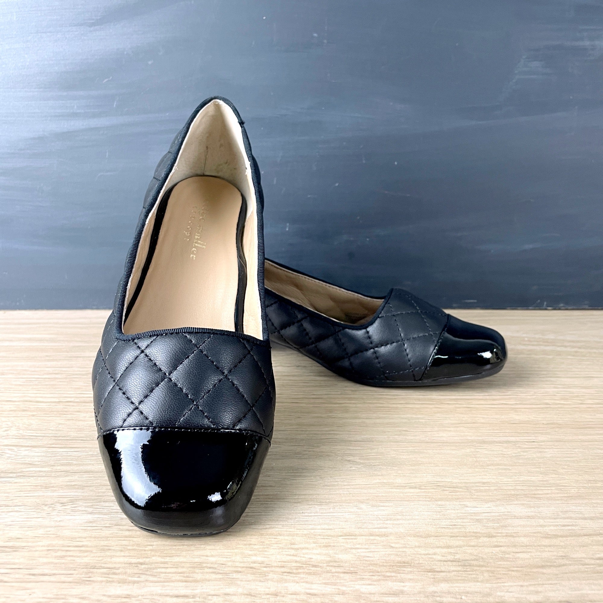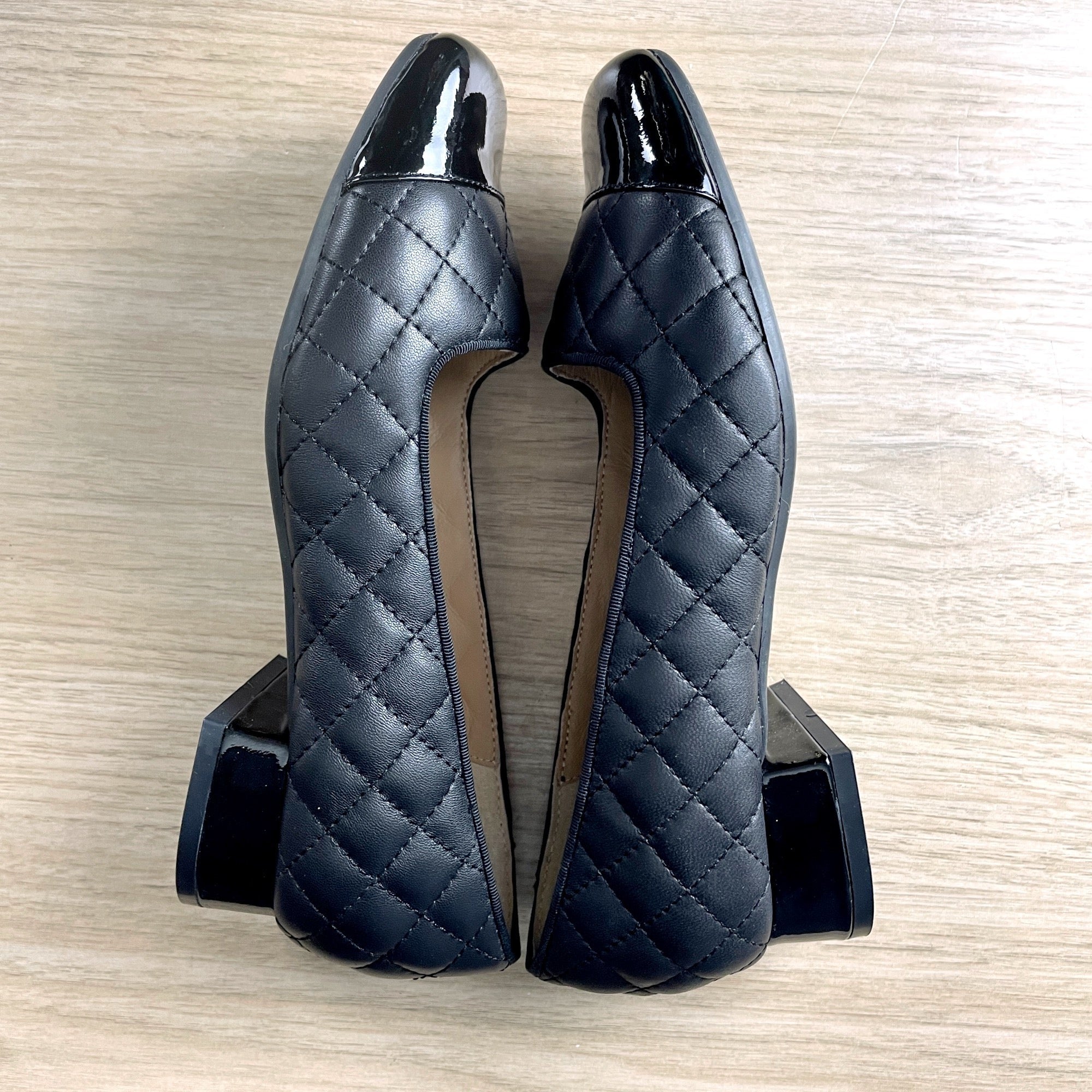 Like new pair of Bettye Muller Concept Greta black low heel pumps. Black quilted leather with patent leather toe and low block heel. Rubber soles. Flexible rubber sole. Leather lining.