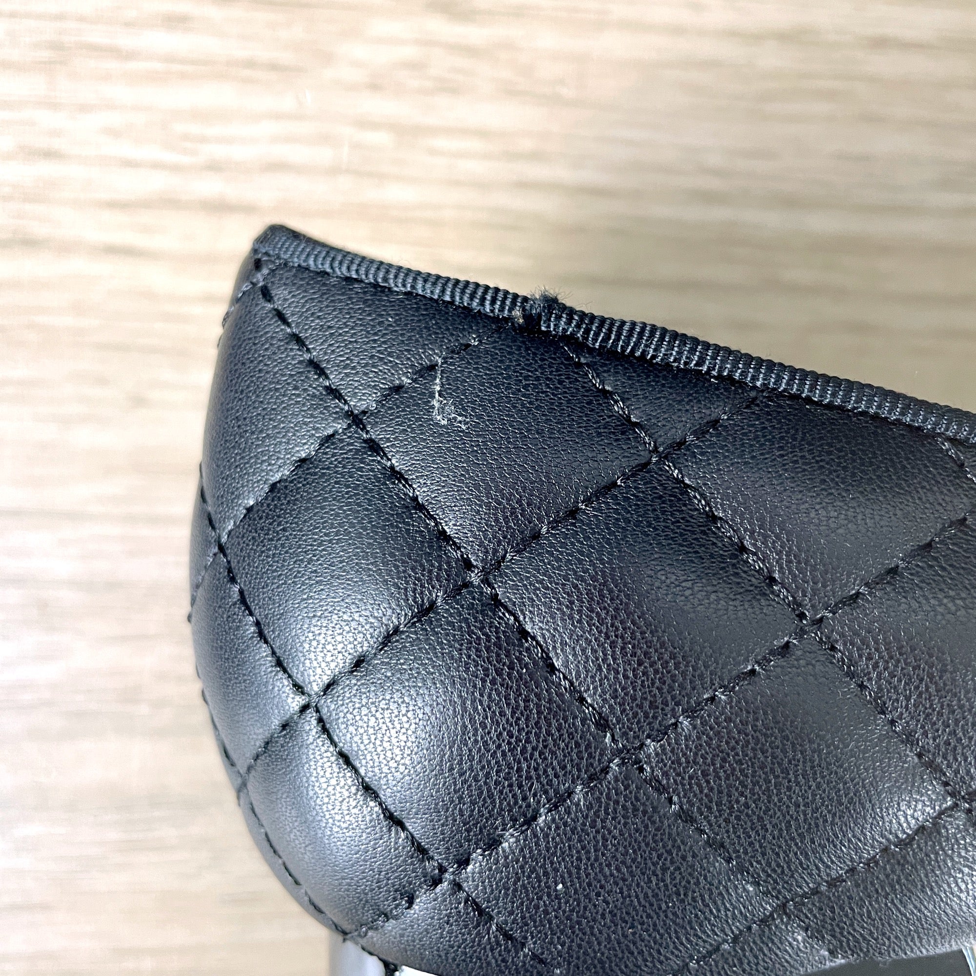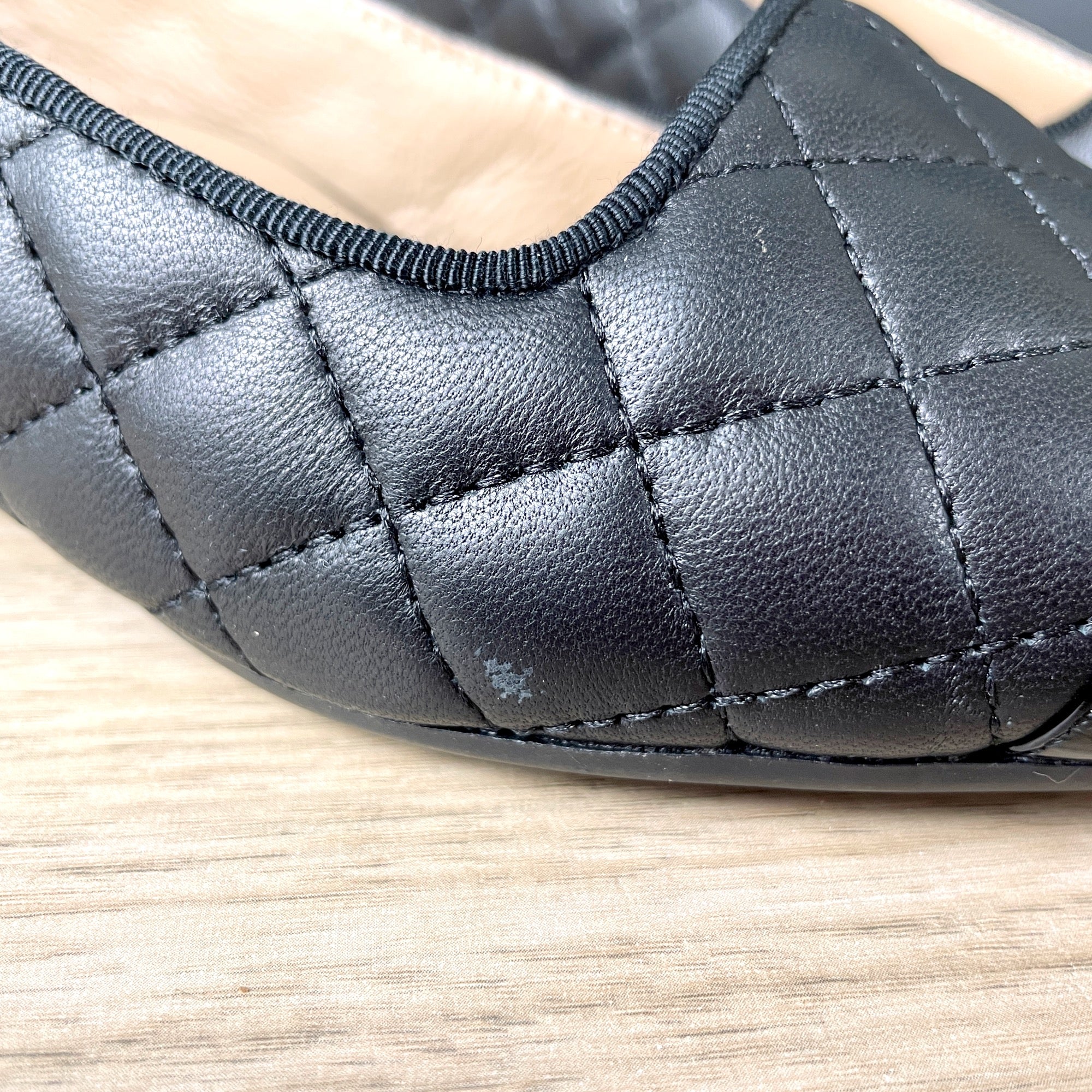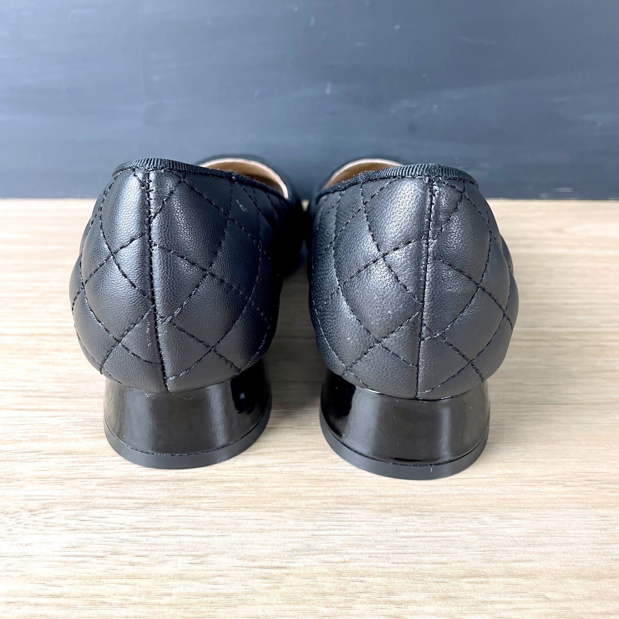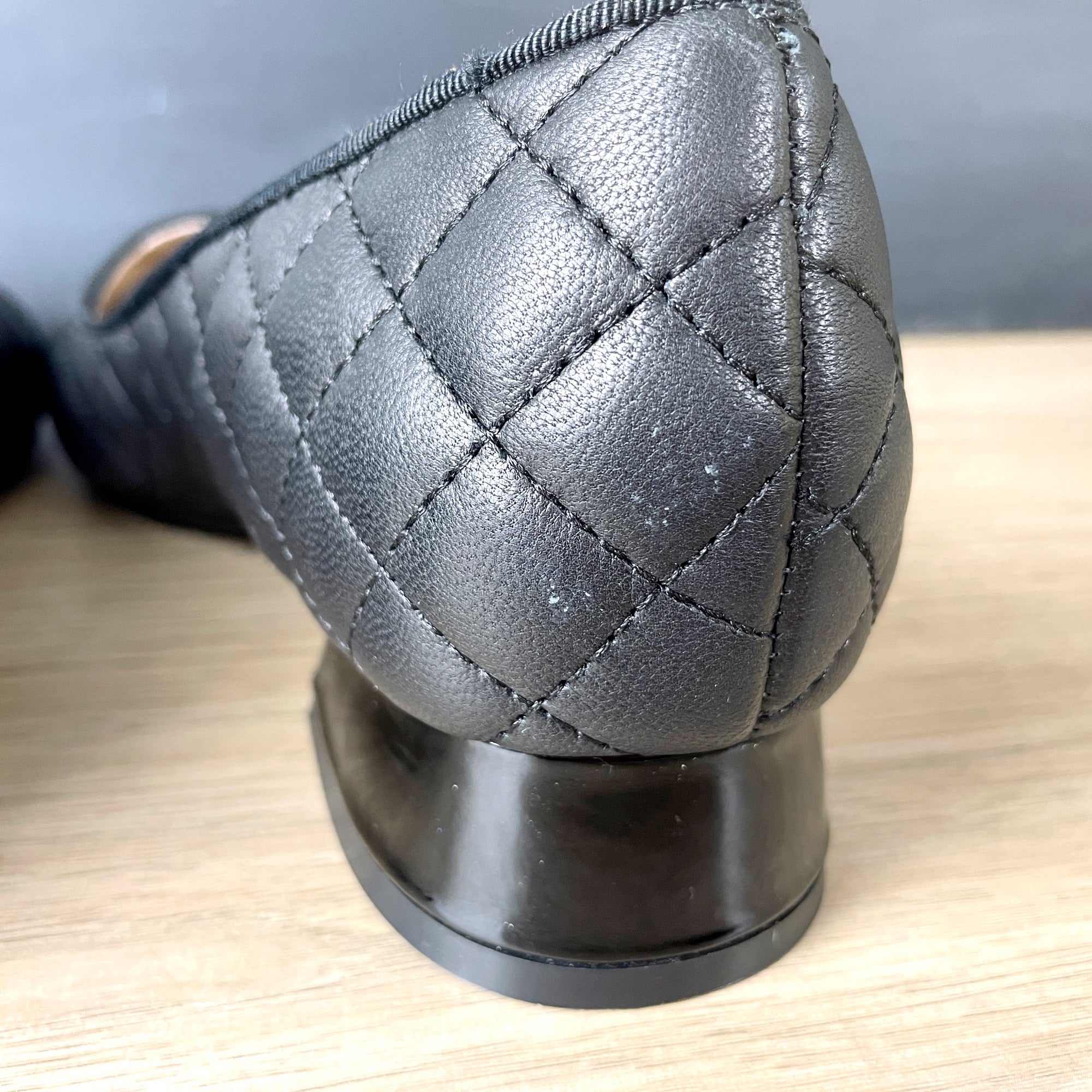 Like new pair of Bettye Muller Concept Greta black low heel pumps. Black quilted leather with patent leather toe and low block heel. Rubber soles. Flexible rubber sole. Leather lining.