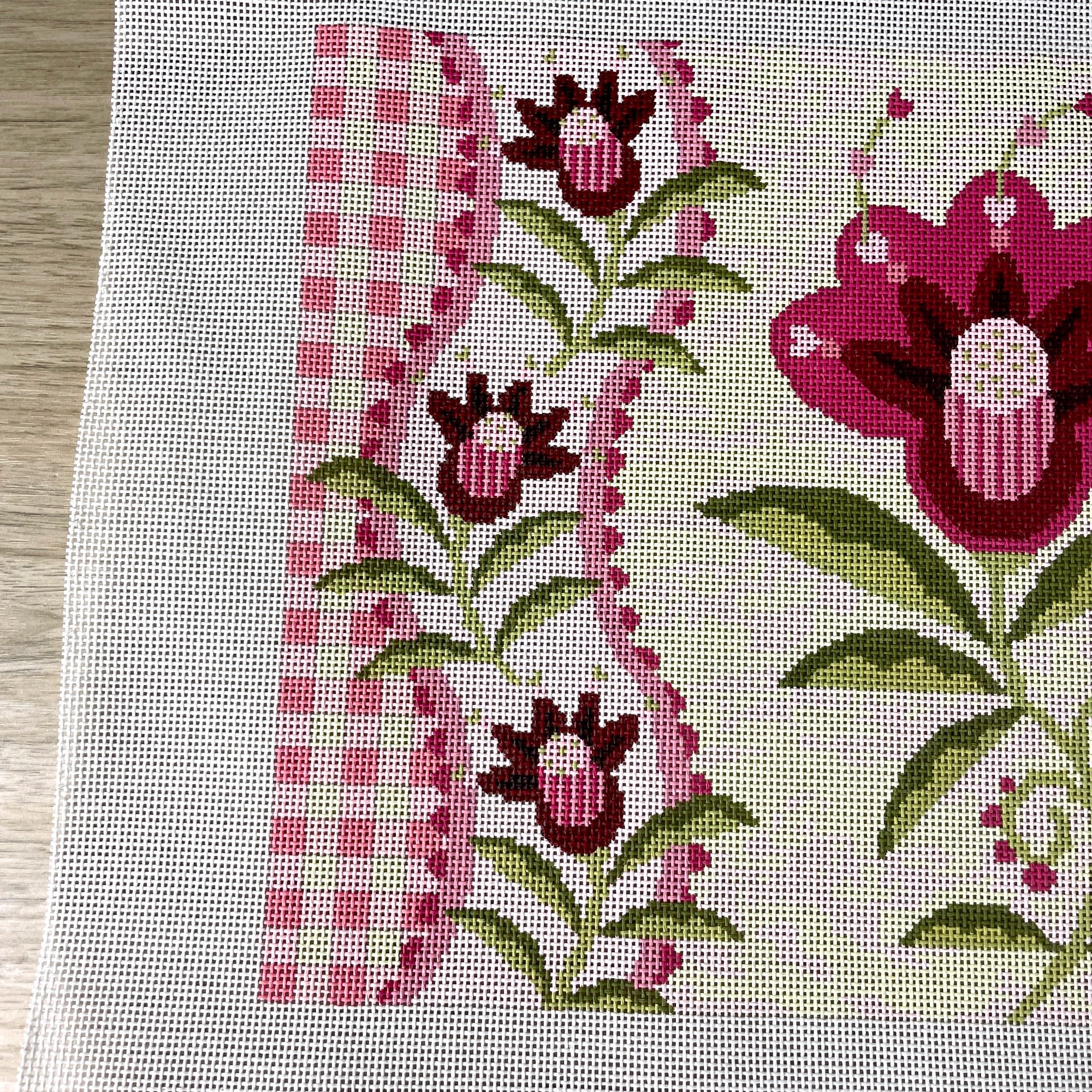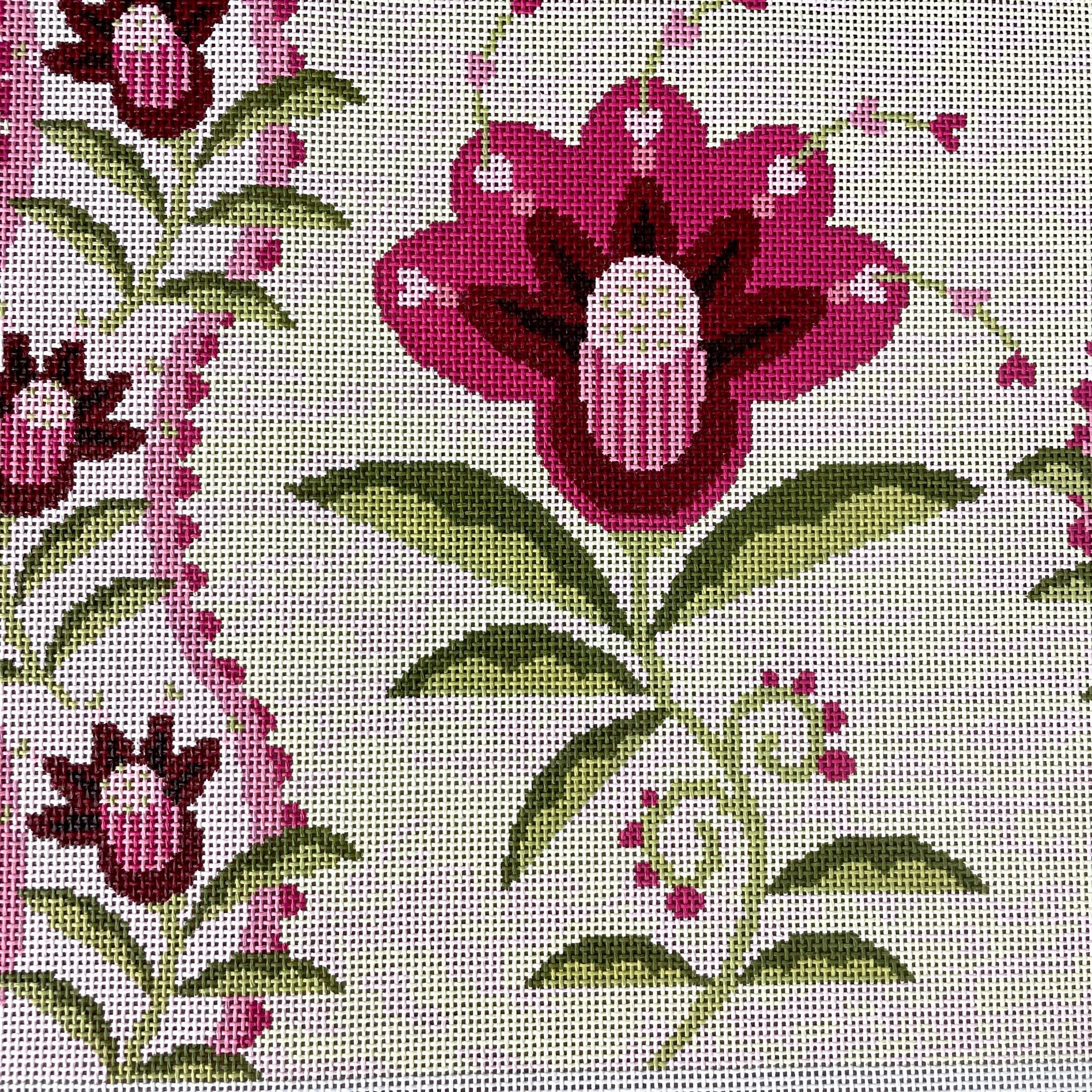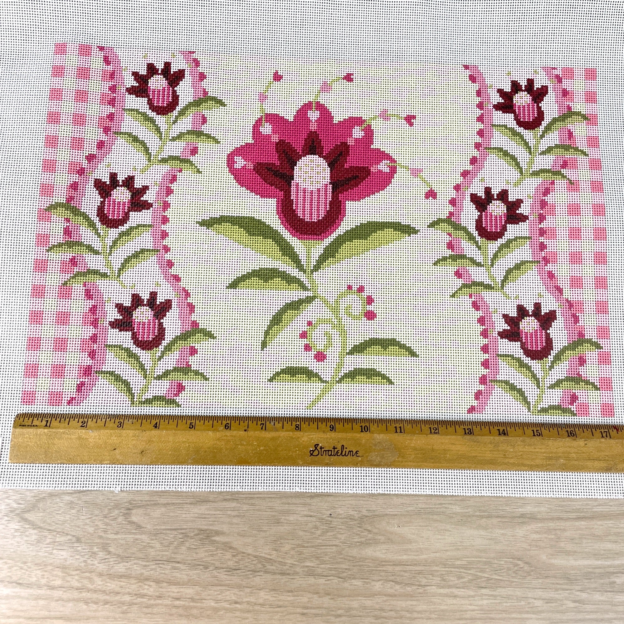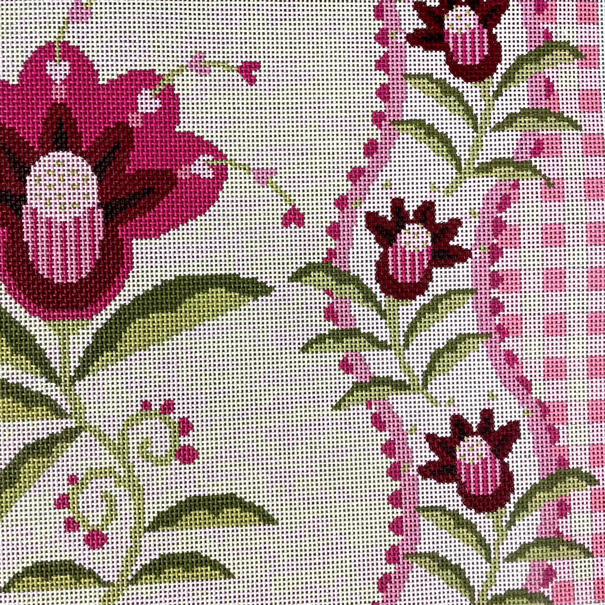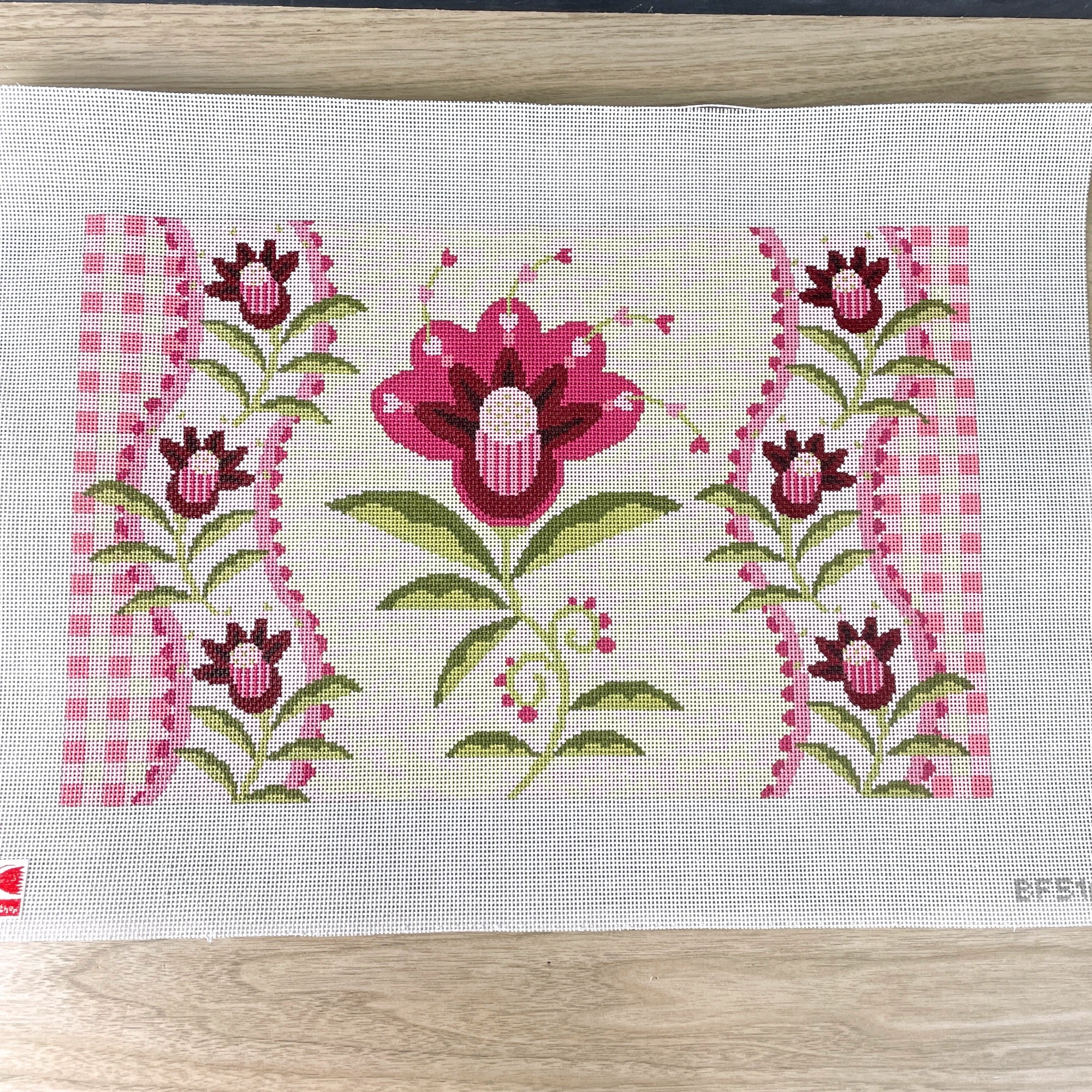 Pretty in shades of pink and green, Birds of a Feather "Pink Floral" needlepoint canvas #BF516. Retail $280.