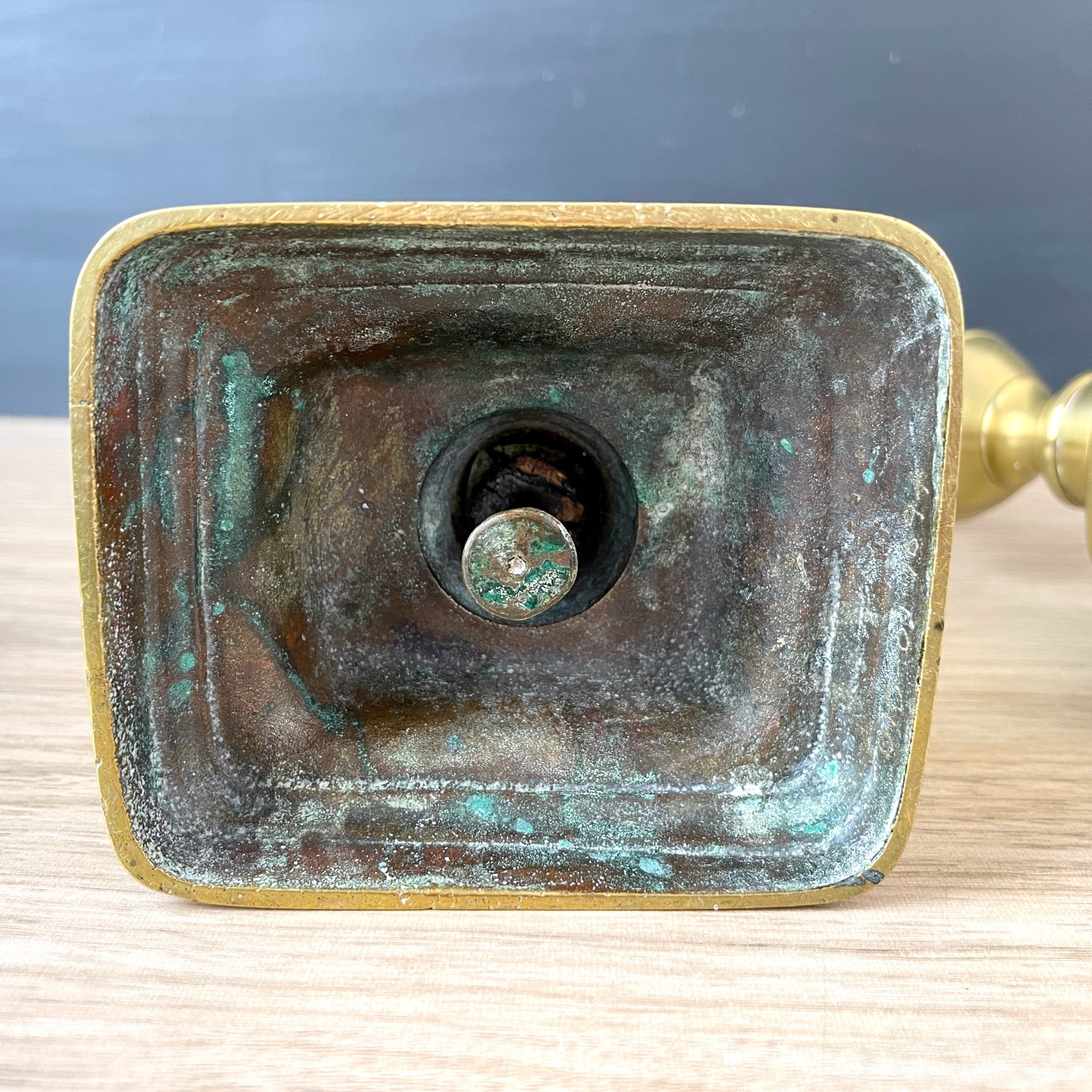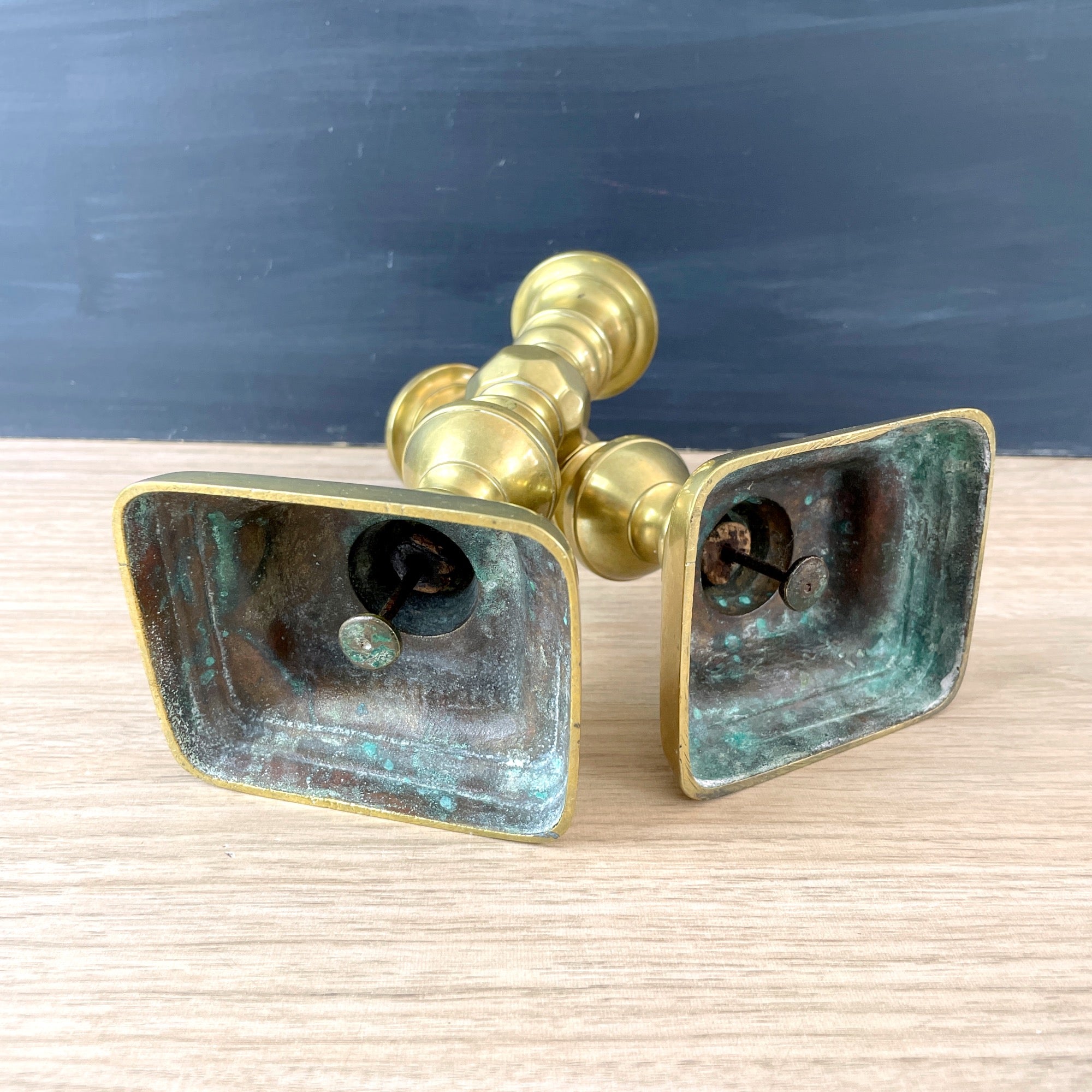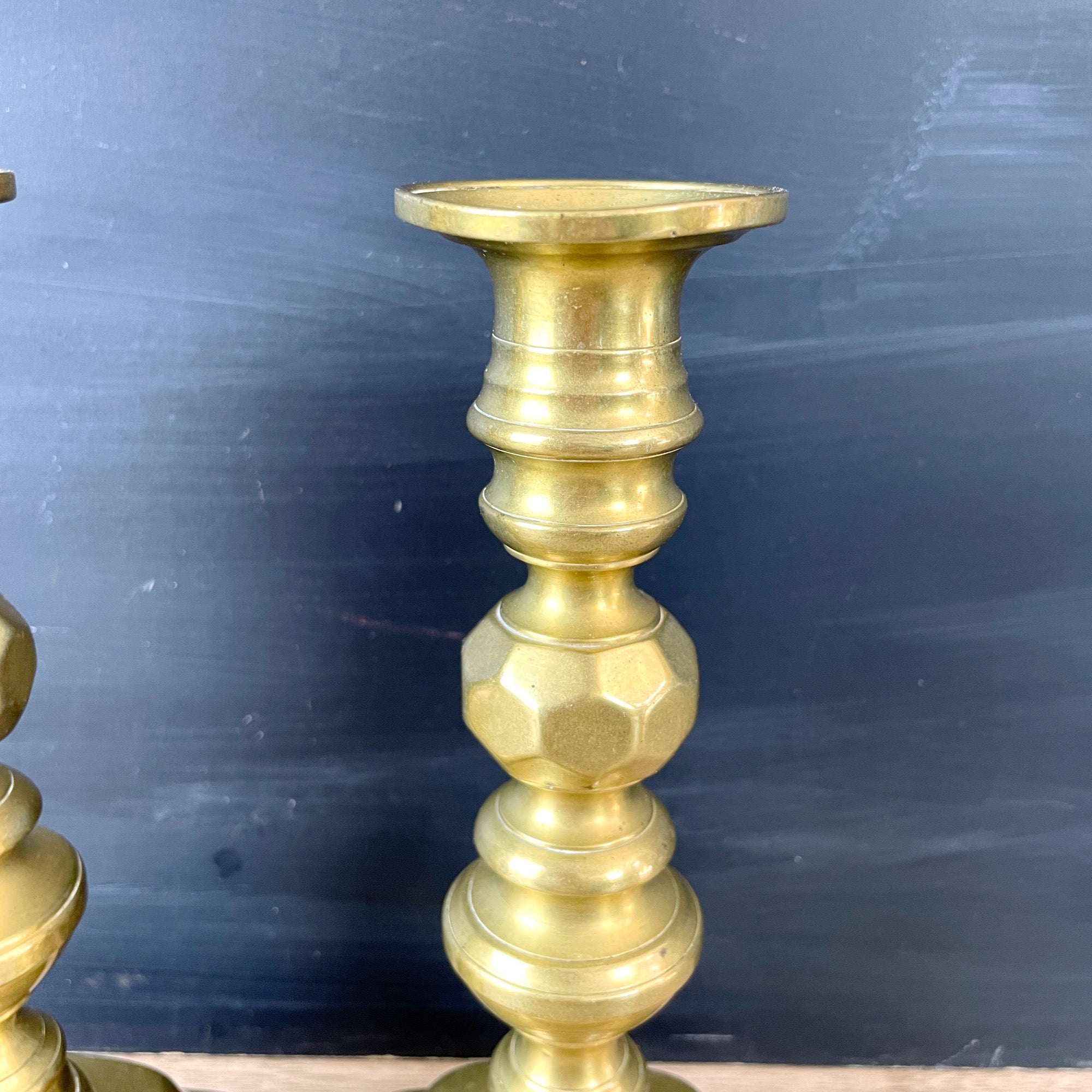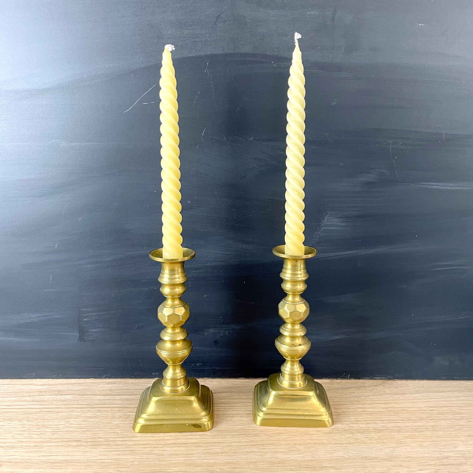 CONDITION Very good. There are marks on one of the bases and one of the turnings. The push-ups don't work. Have NOT been polished, the warm patina is as found. The bobeche on one has a wave to it.
