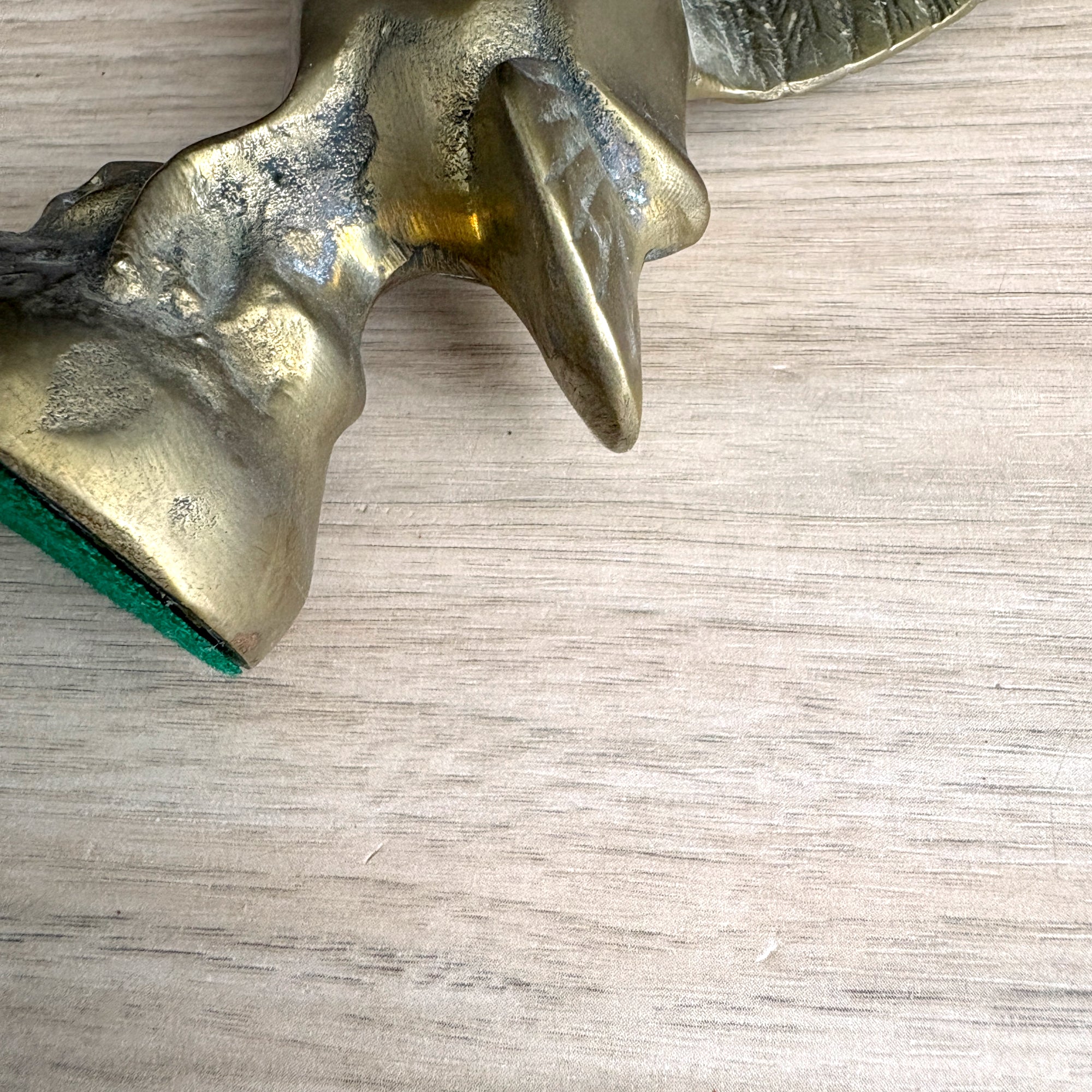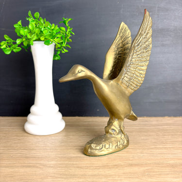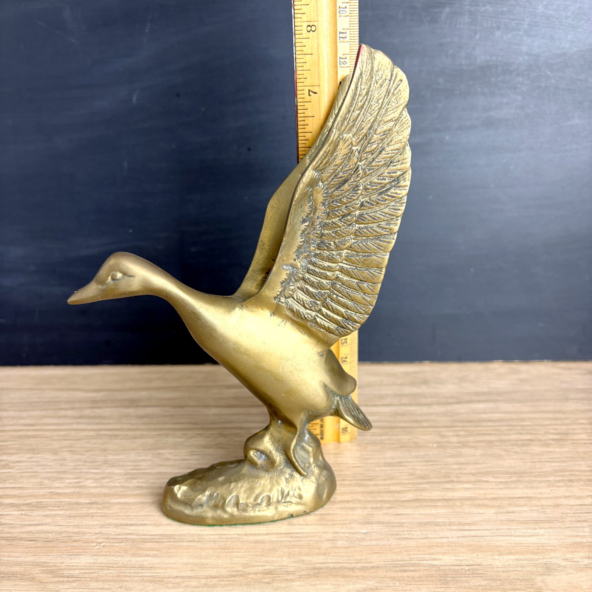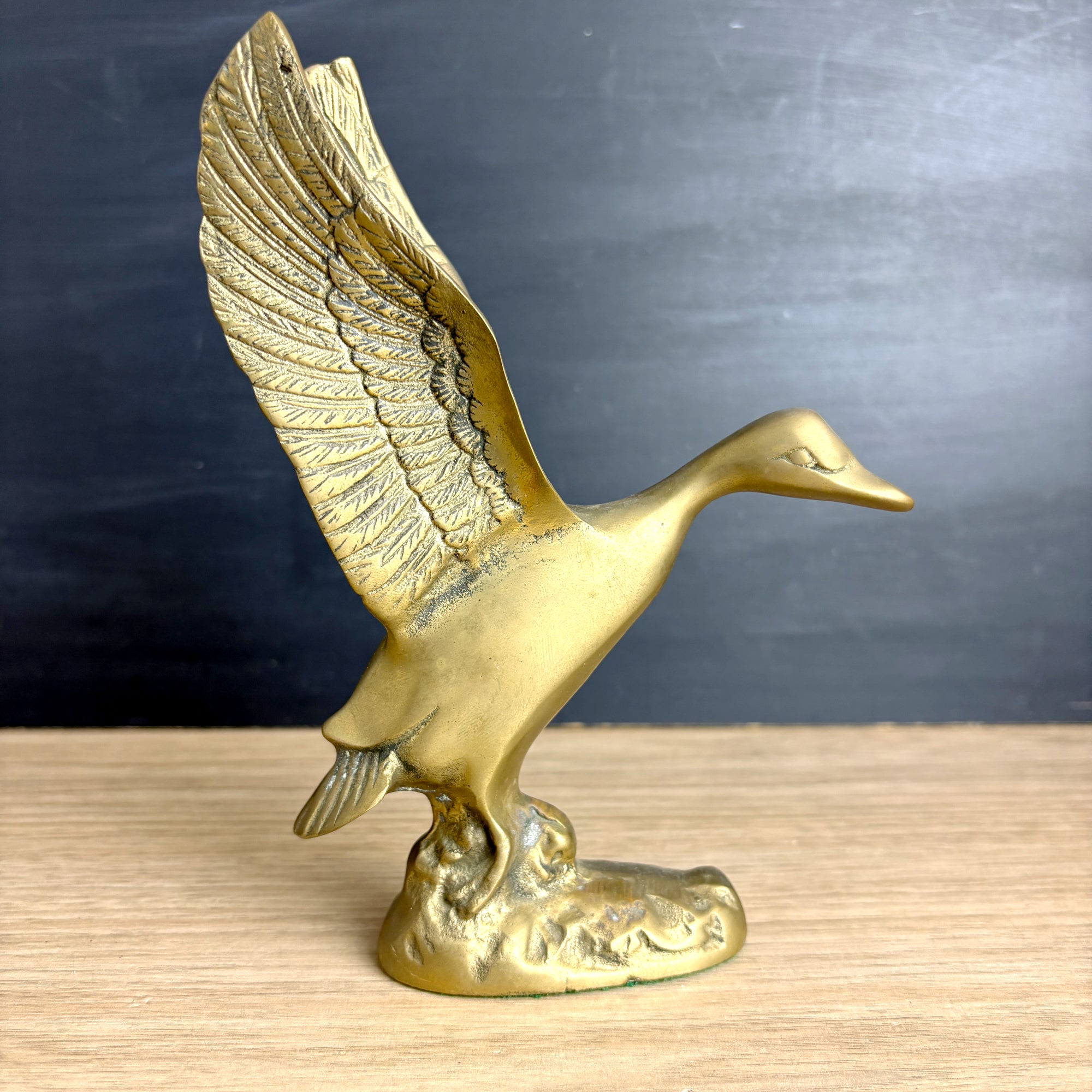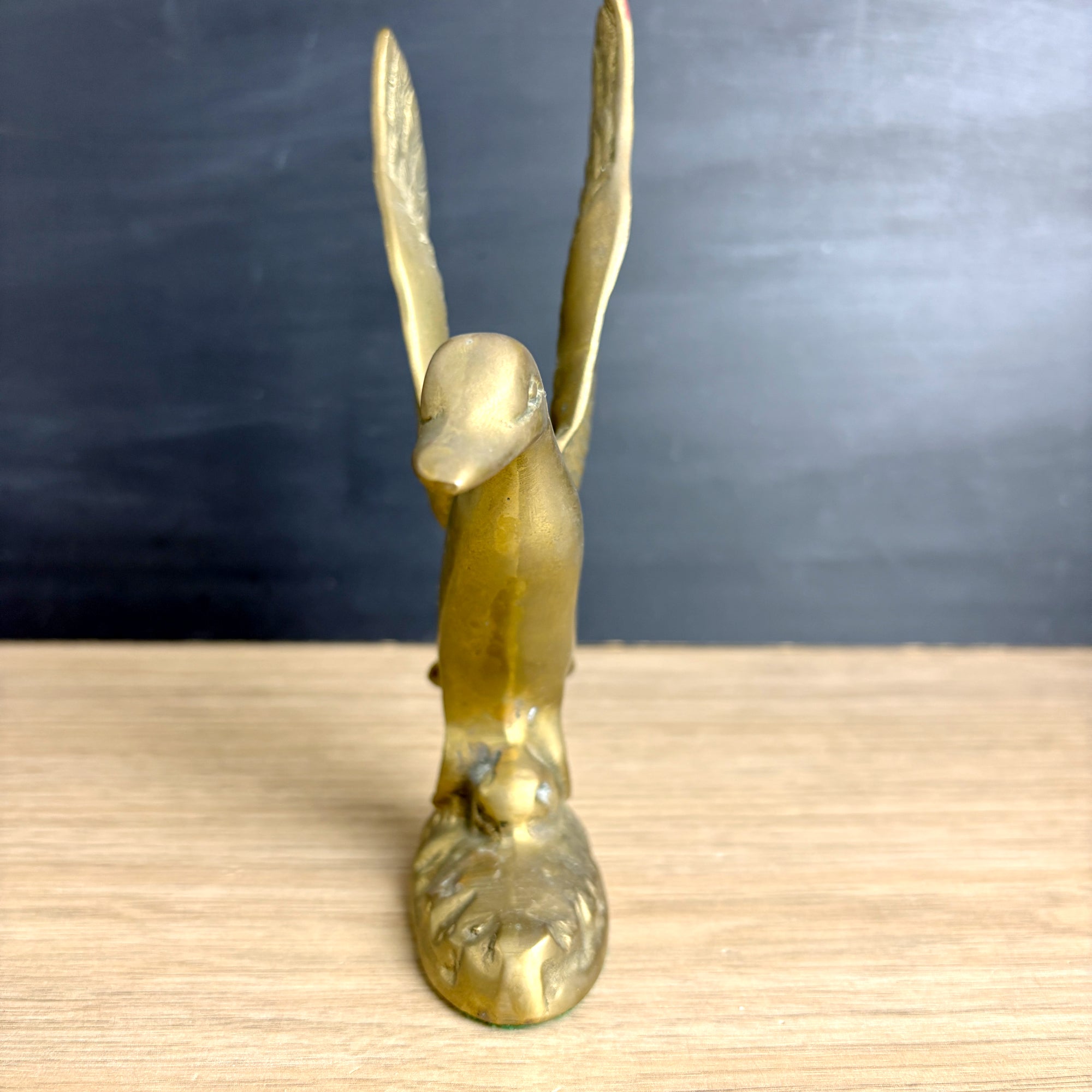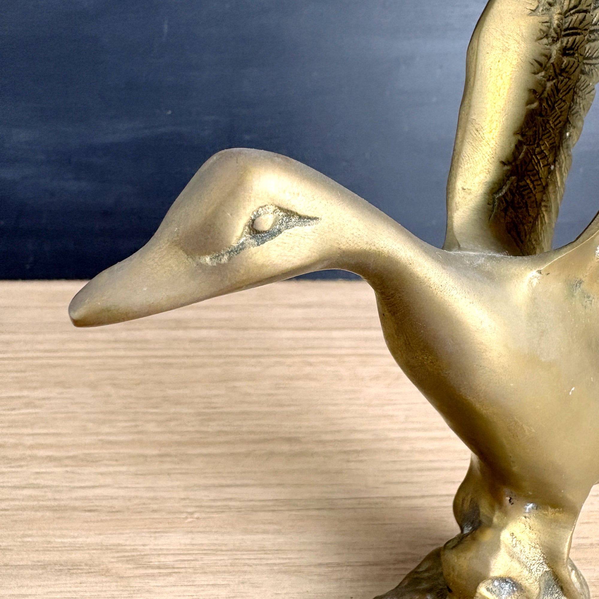 Vintage mid century brass duck or goose in flight paperweight. Body is quite sleek, but wings and tail feathers are detailed.