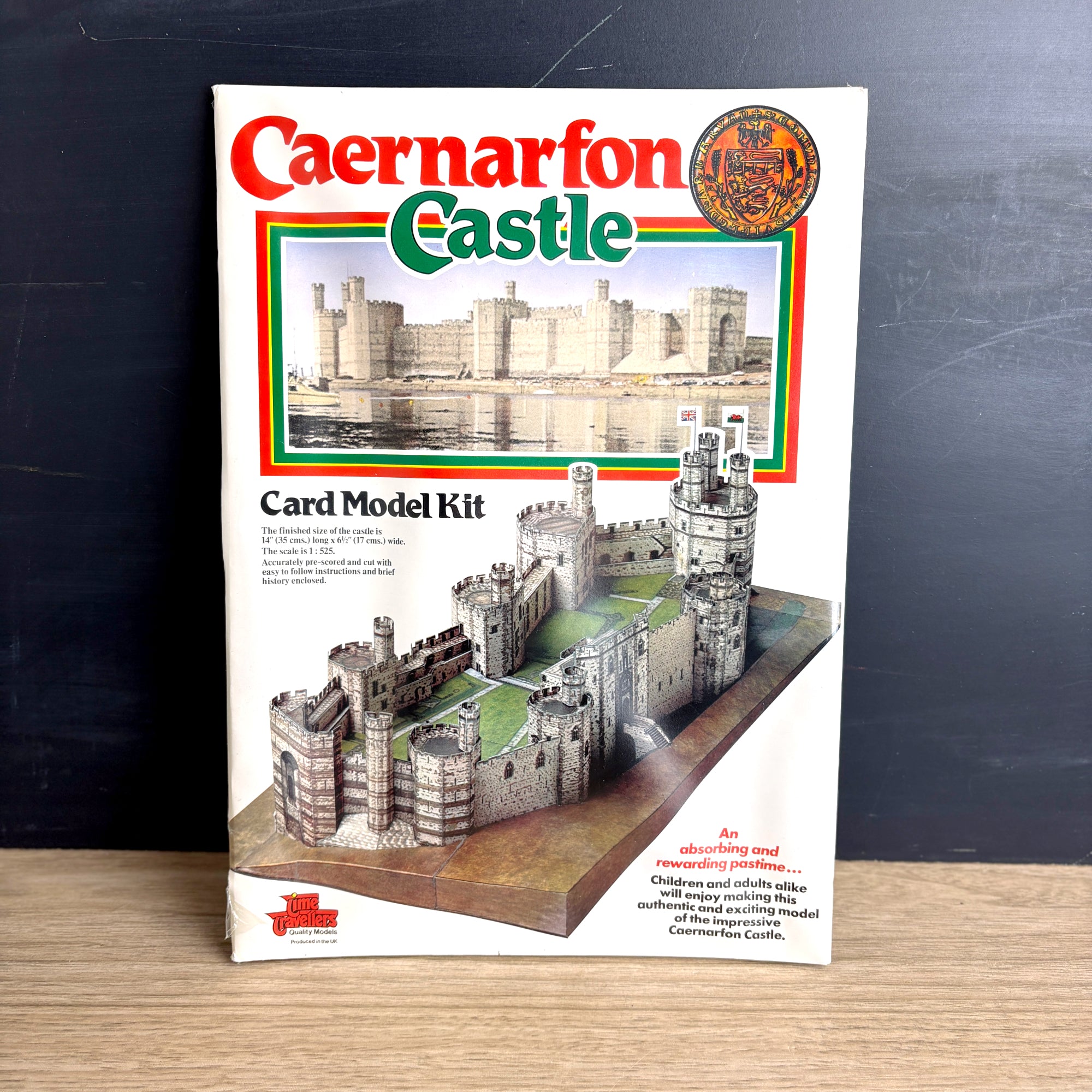 Complete, sealed in package, vintage Caernarfon Castle in Wales card model kit made by Time Travellers Quality Models of the UK. Kit includes a brief history of Caernarfon Castle, where in 1969 then-Prince, now King Charles was invested as the Prince of Wales by Queen Elizabeth. More fun facts: former British PM David Lloyd George represented the area when he was a Member of Parliament, and the castle was the sight of a 2019 rally for Welsh Independence. Easy to assemble card stock model kit. Completed castle measures 14" x 6 1/2".