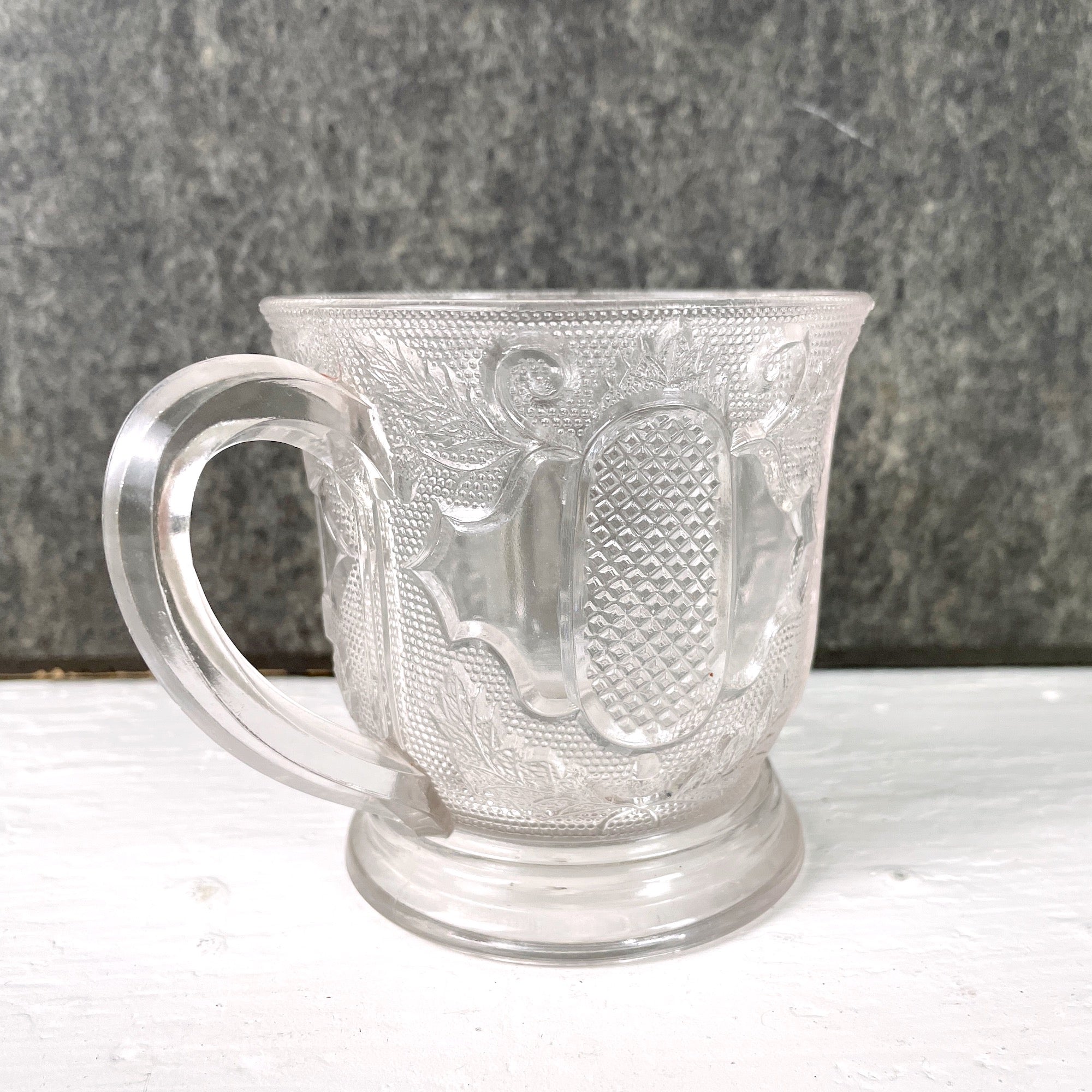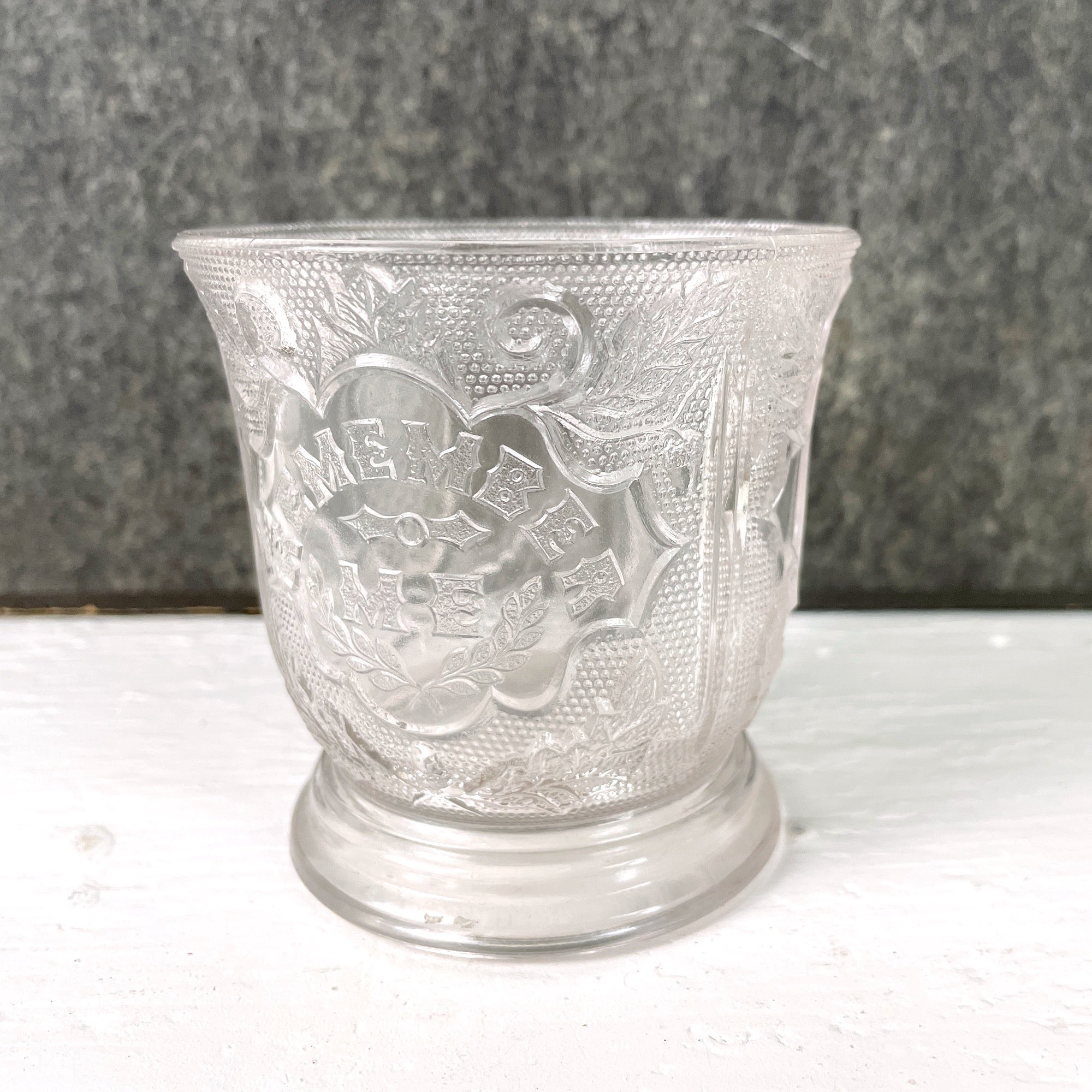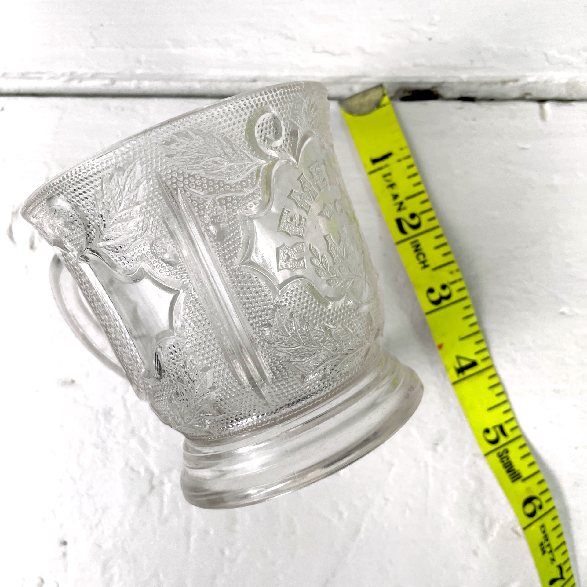 Antique EAPG mug from the late 1800s, "Remember Me" by Campbell, Jones and Co. of Pittsburgh. Small footed mug with front facing shield with the motto surrounded by vines.