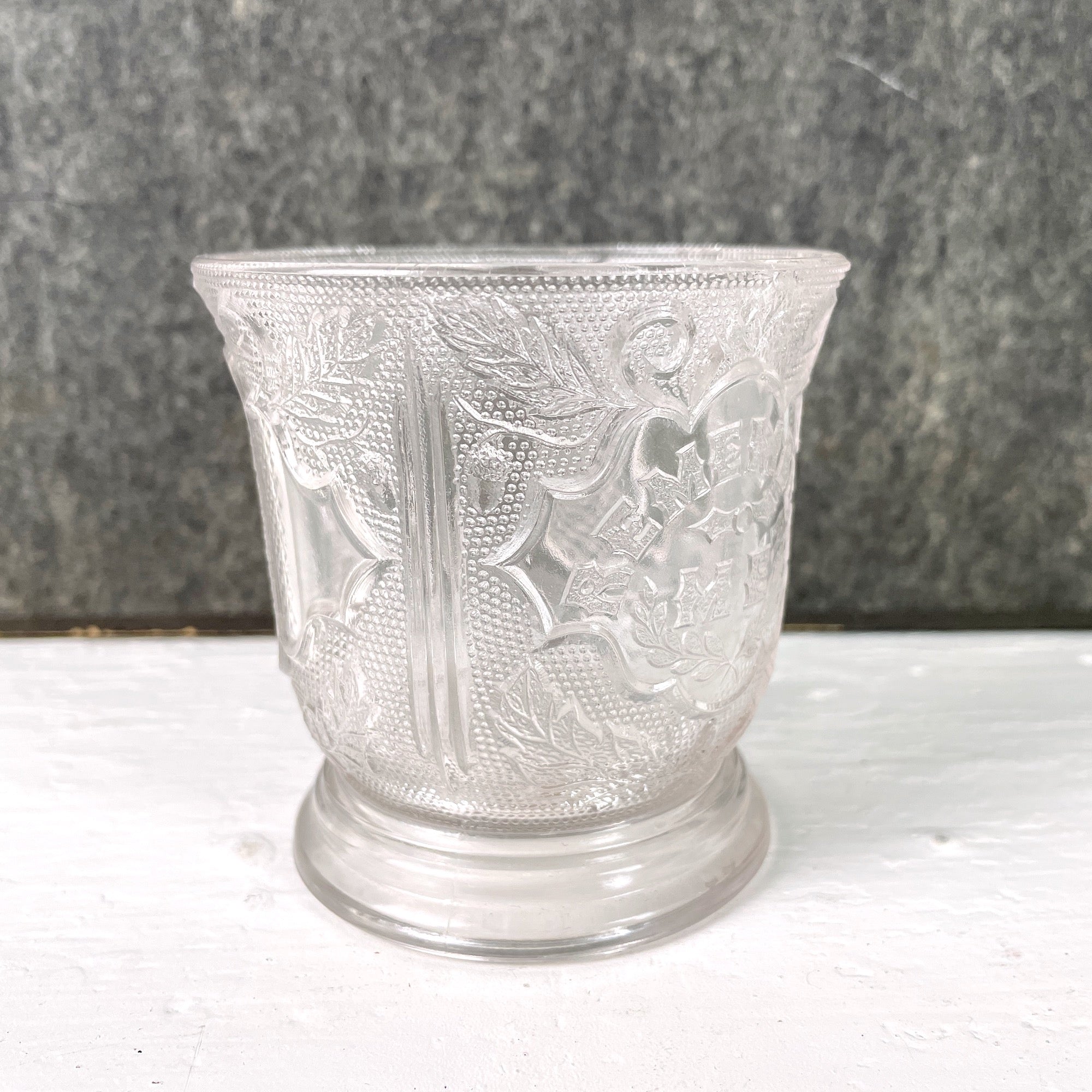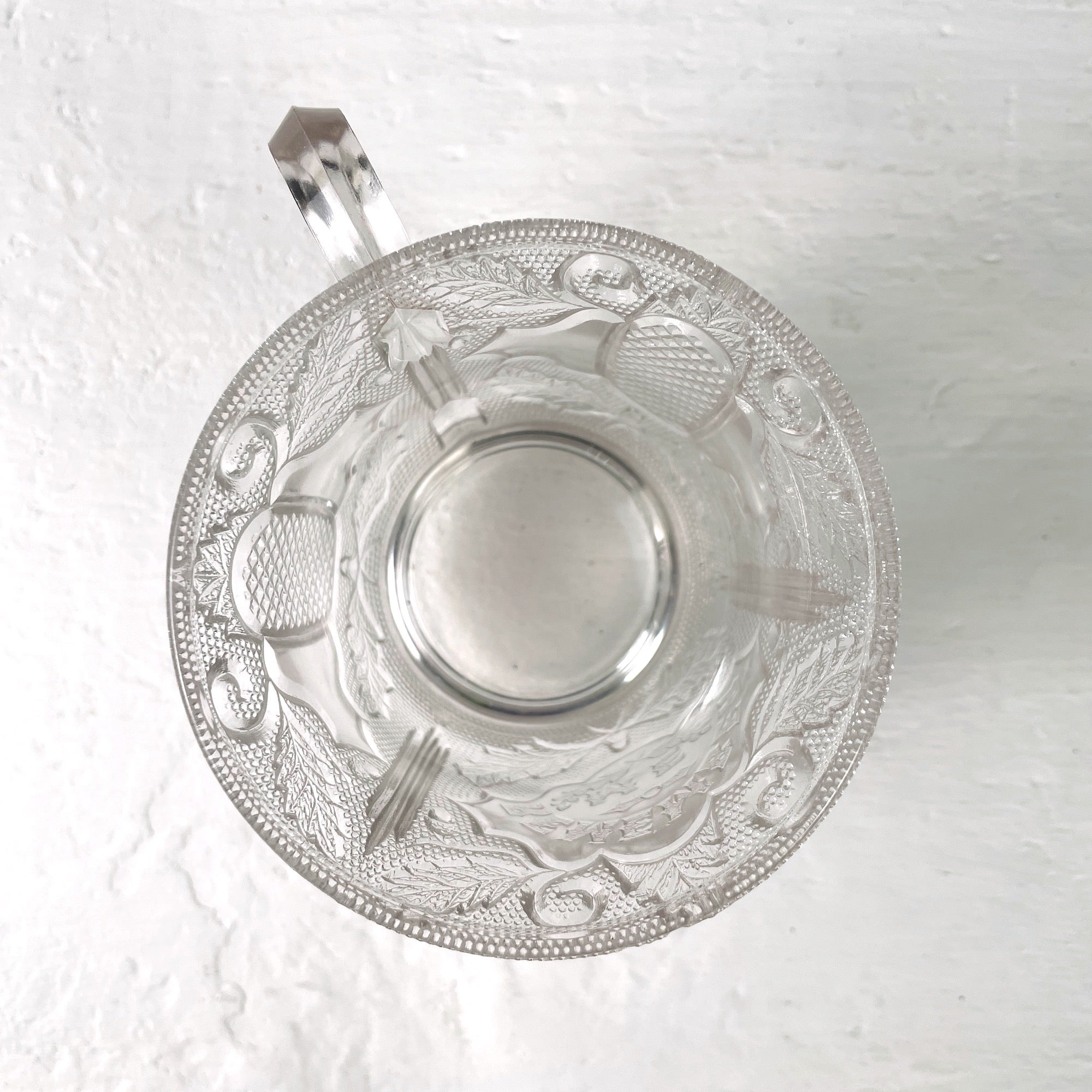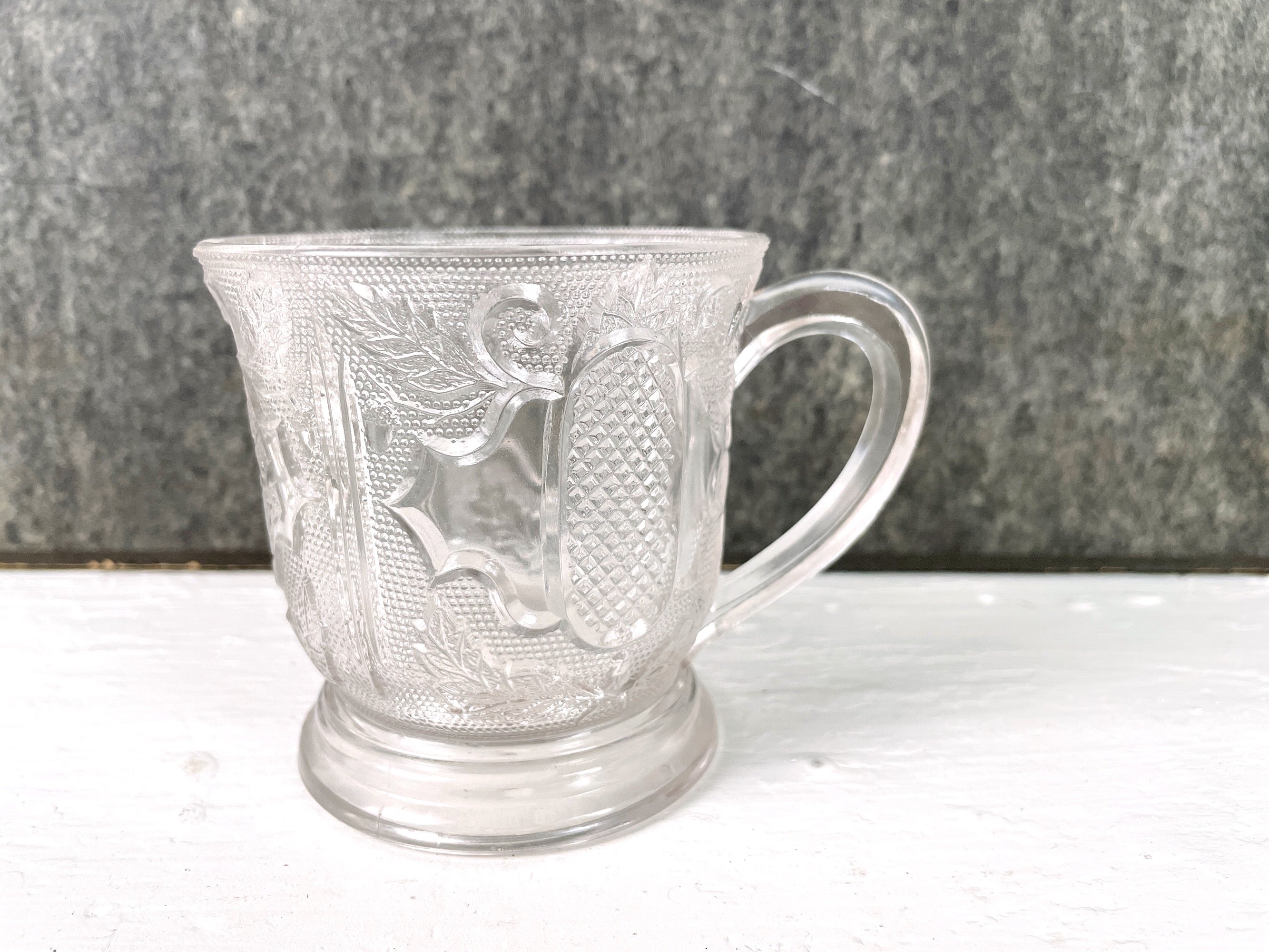 Antique EAPG mug from the late 1800s, "Remember Me" by Campbell, Jones and Co. of Pittsburgh. Small footed mug with front facing shield with the motto surrounded by vines.