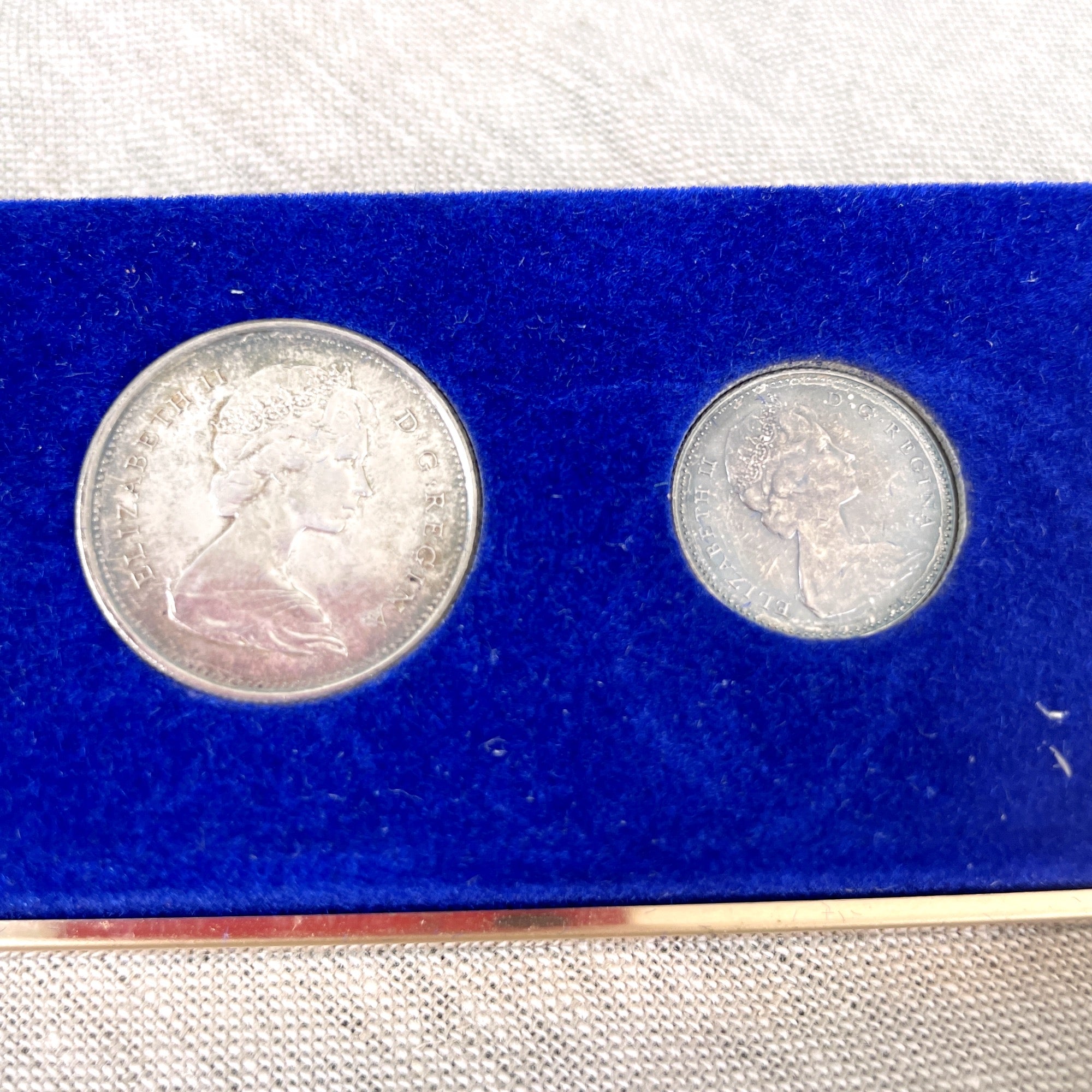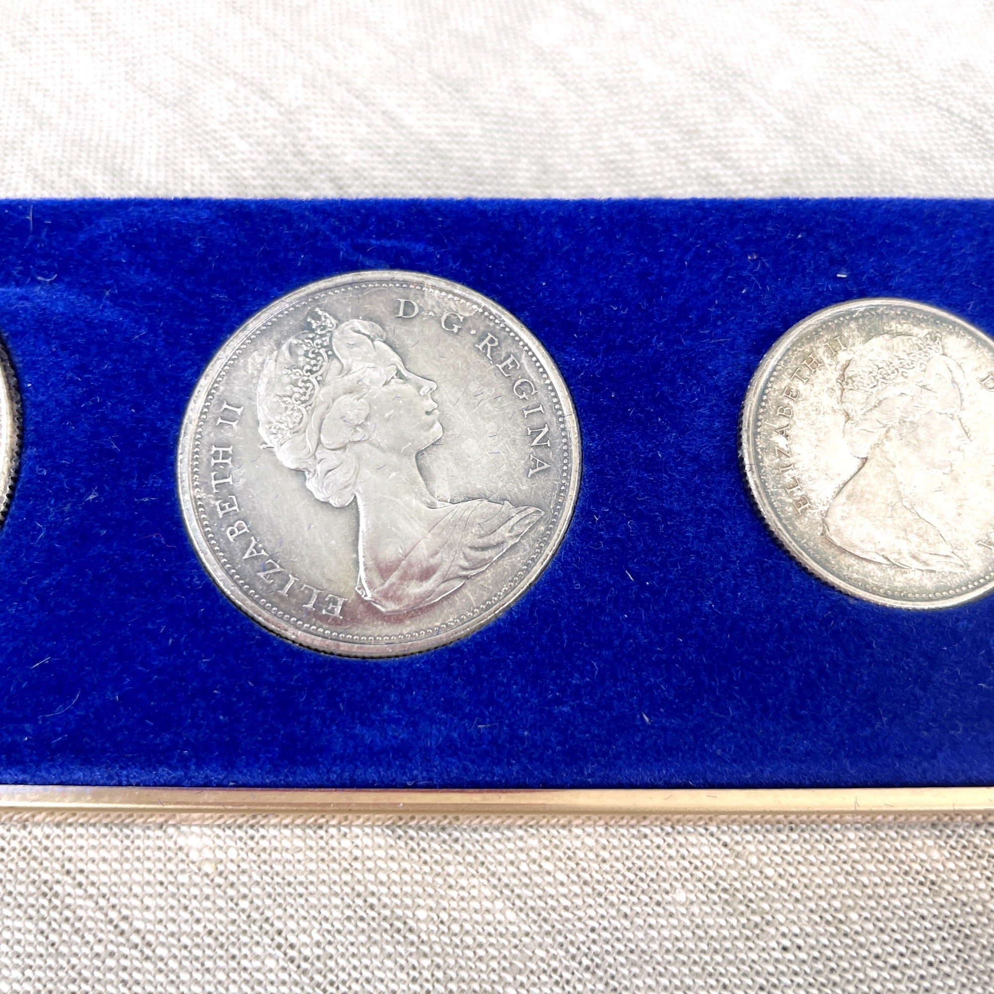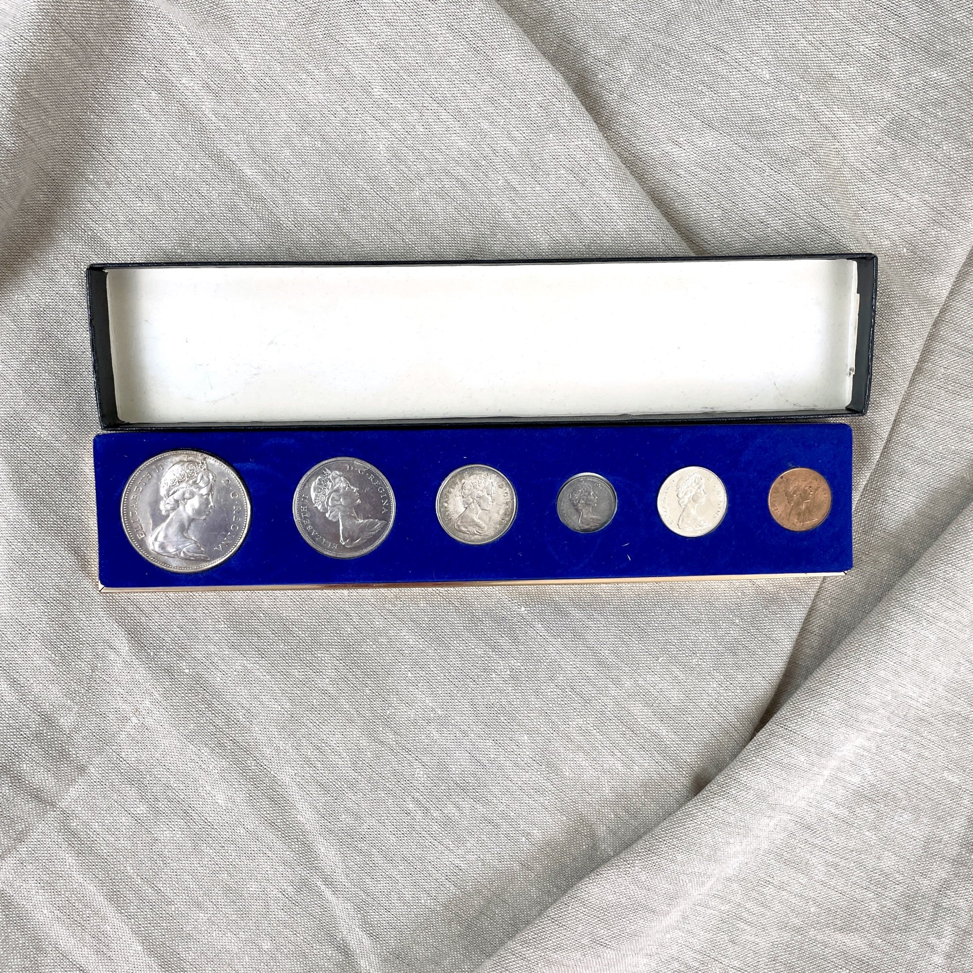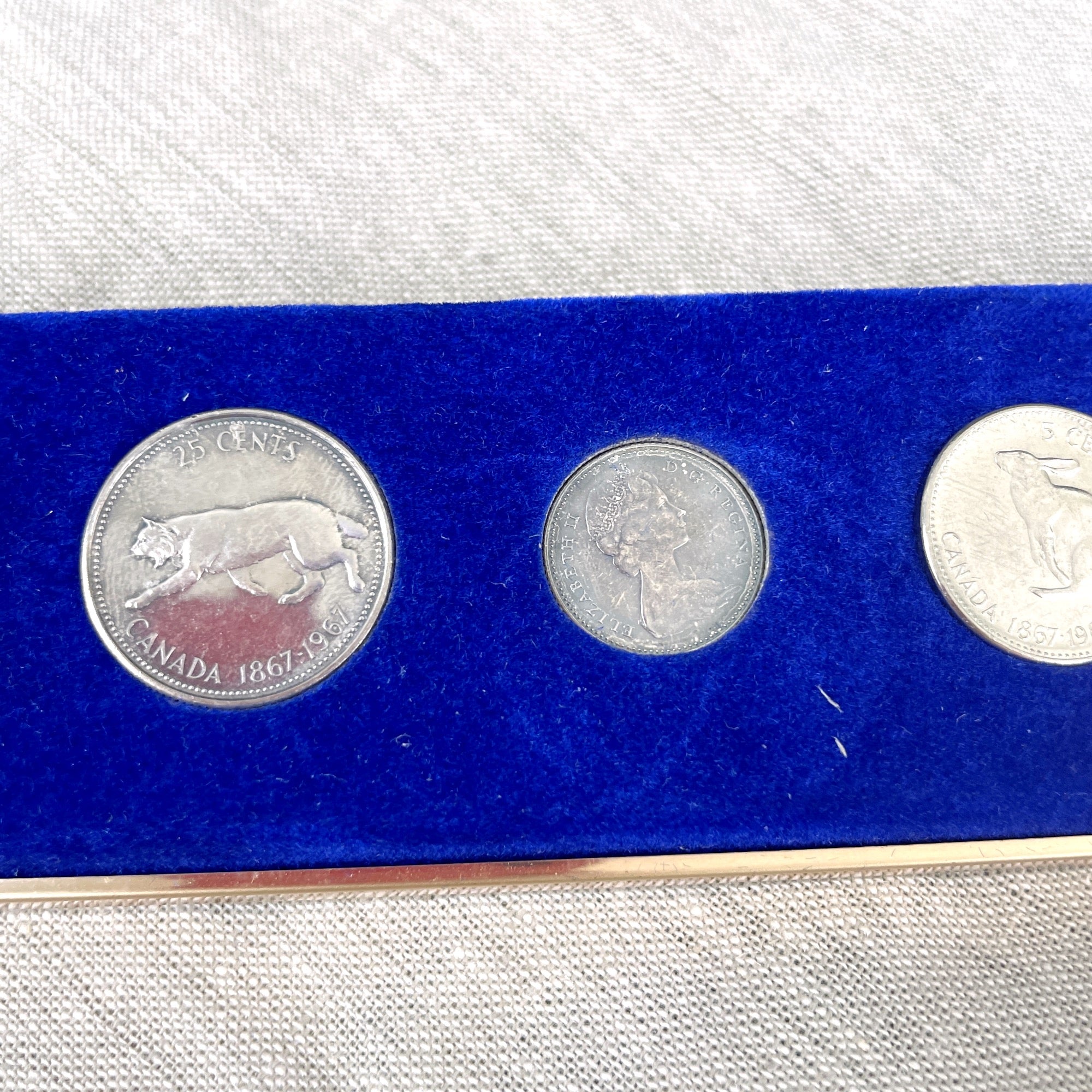 Set of 6 Canadian coins issued in 1967, the year of Canada's Centennial. Includes the following denominations 1.00, .50, .25, .10, .05 and .01. Heads side on all coins is the queen; tails side are the animals of Canada (goose, wolf, mountain cat, fish, rabbit and peace dove) In black and gold presentation box and original paper box (which has writing on it.)