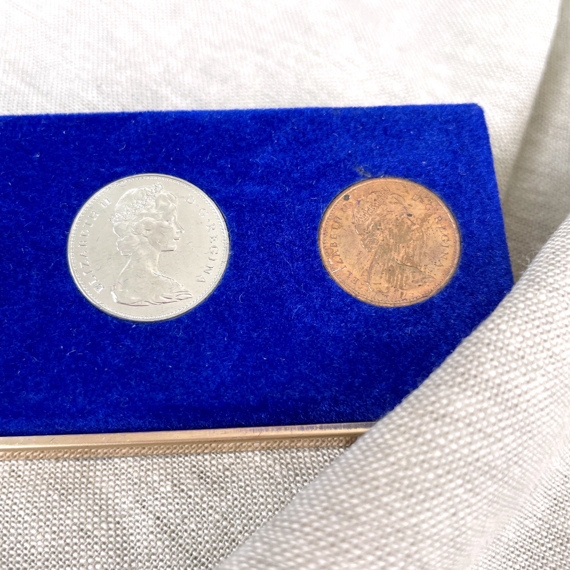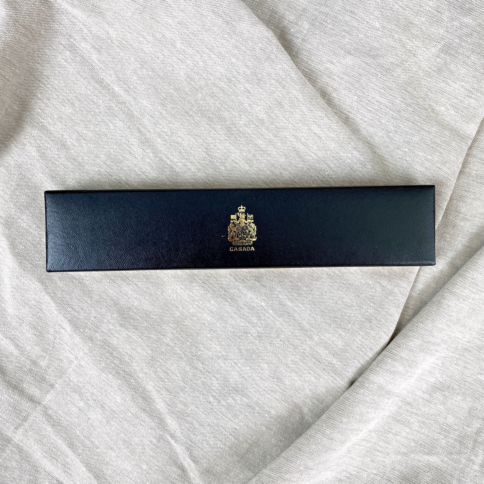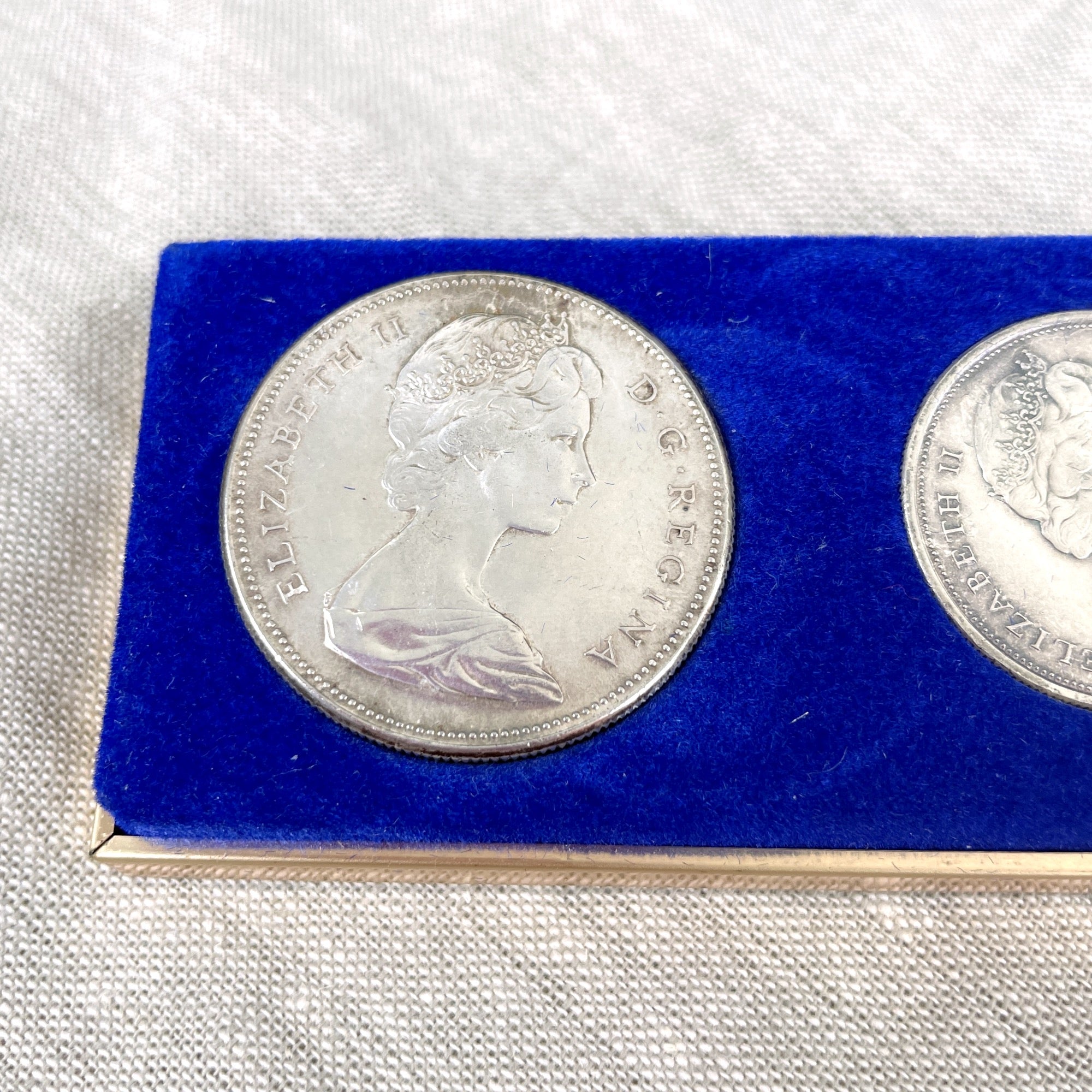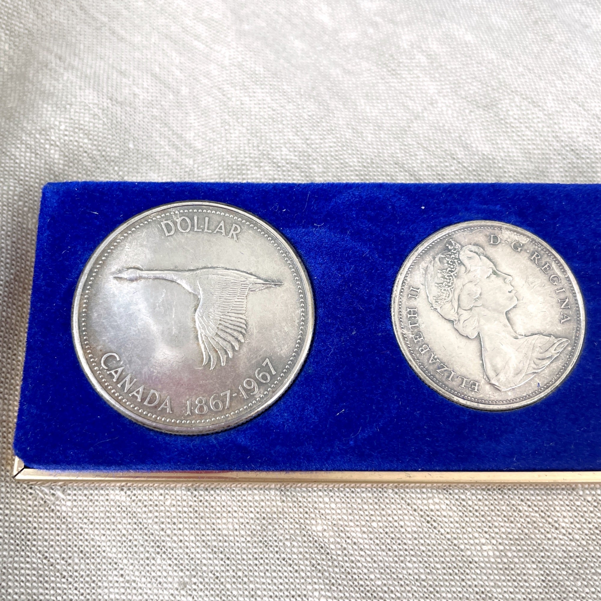 Set of 6 Canadian coins issued in 1967, the year of Canada's Centennial. Includes the following denominations 1.00, .50, .25, .10, .05 and .01. Heads side on all coins is the queen; tails side are the animals of Canada (goose, wolf, mountain cat, fish, rabbit and peace dove) In black and gold presentation box and original paper box (which has writing on it.)