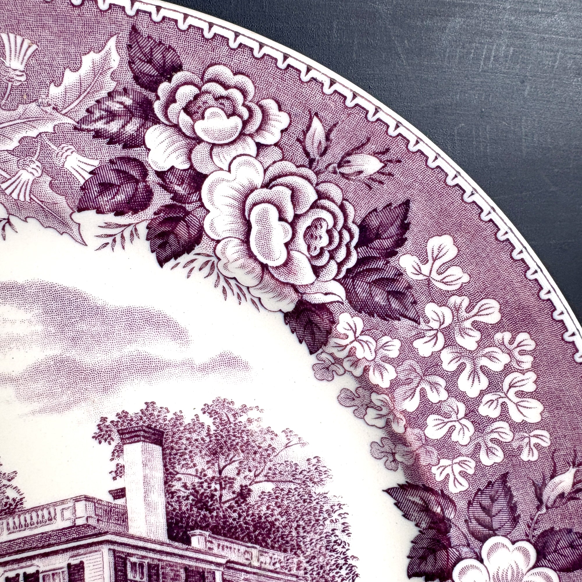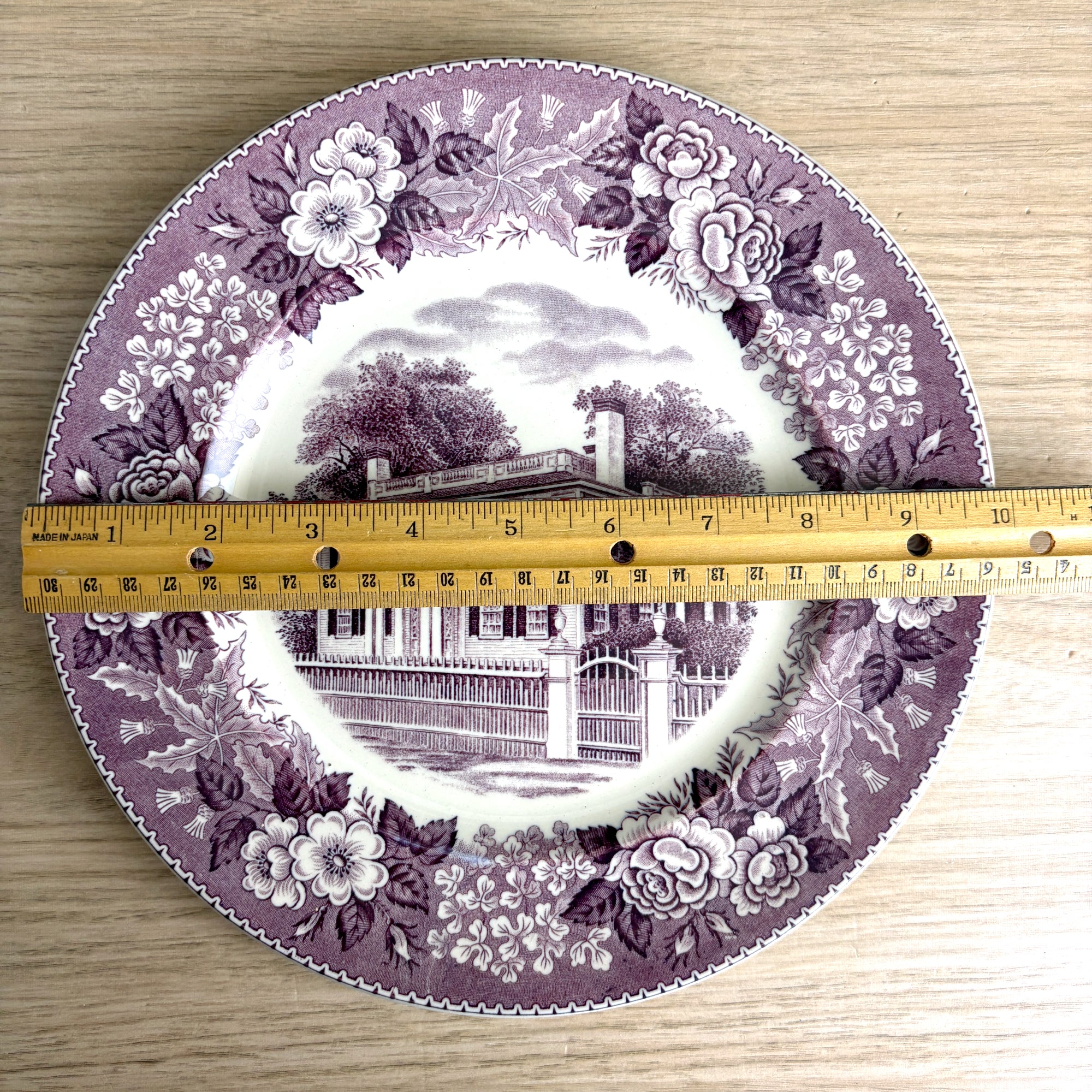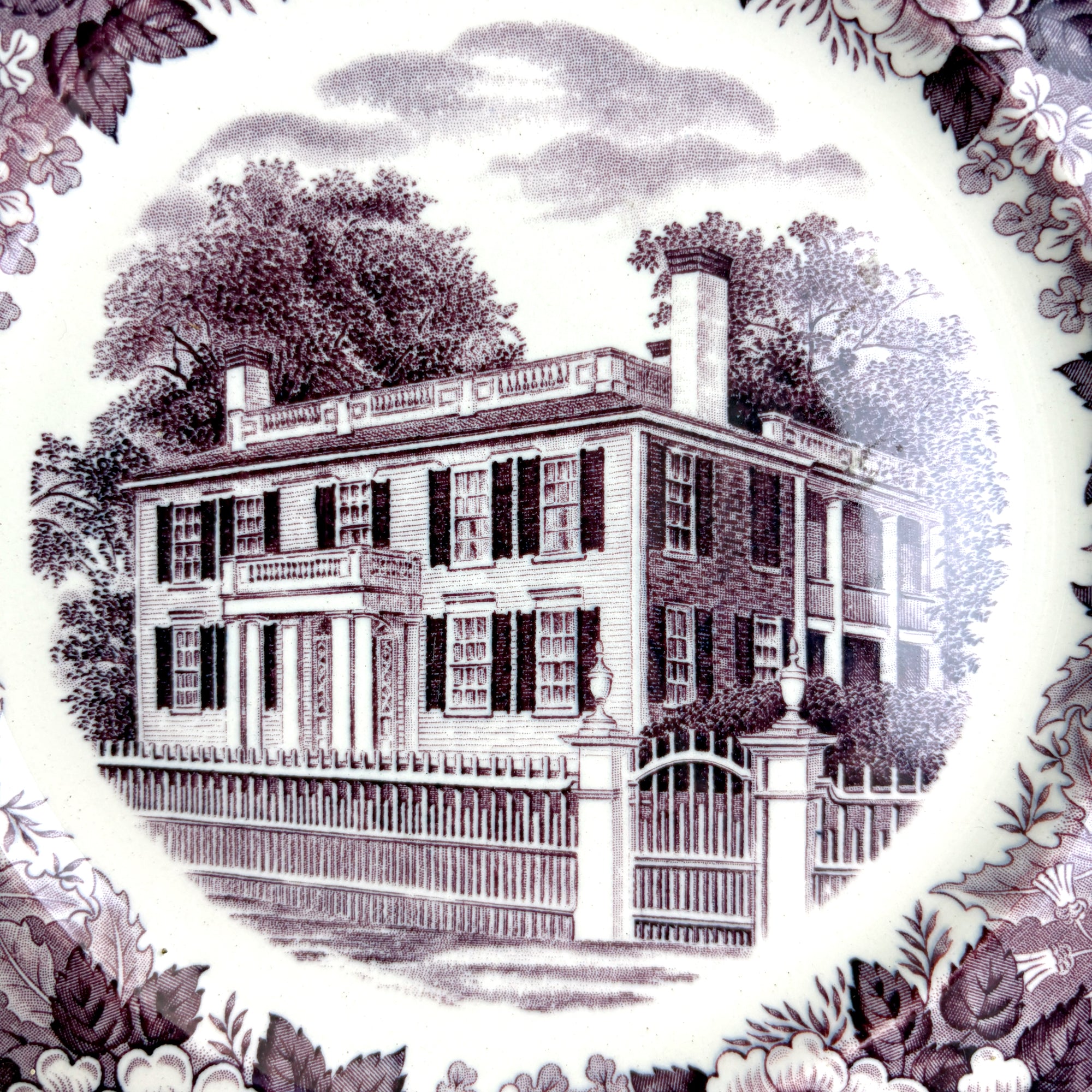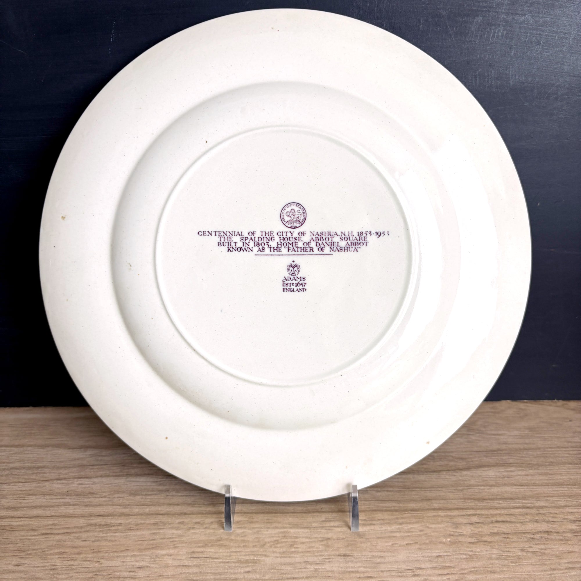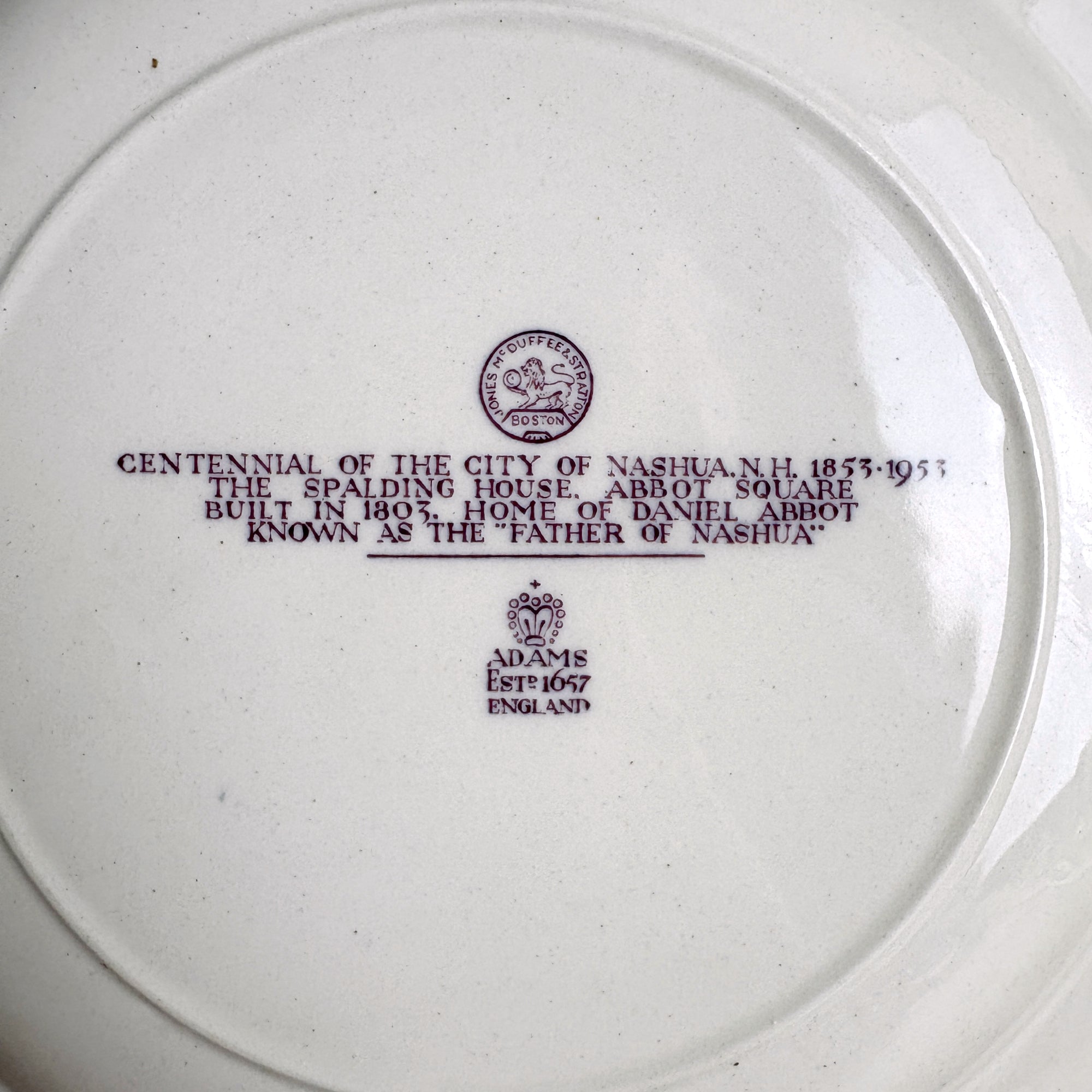 Vintage commemorative plate for the Centennial of The City of Nashua N.H. 1853-1953 The Spalding House, Abbot Square. Built in 1803, was the home of Daniel Abbot, known as the "Father of Nashua." Plate made by Adams, England. The center image depicts the Spalding house, with a wide floral motif around the rim.