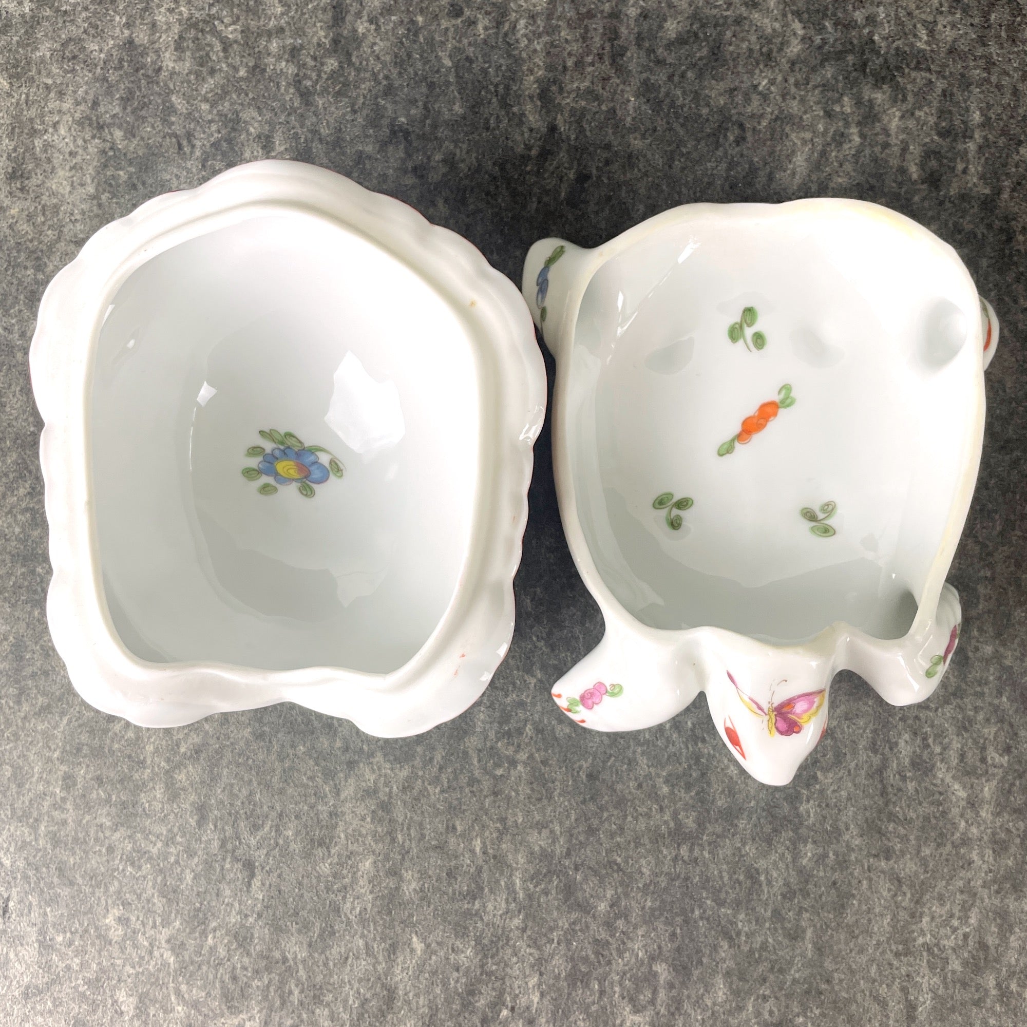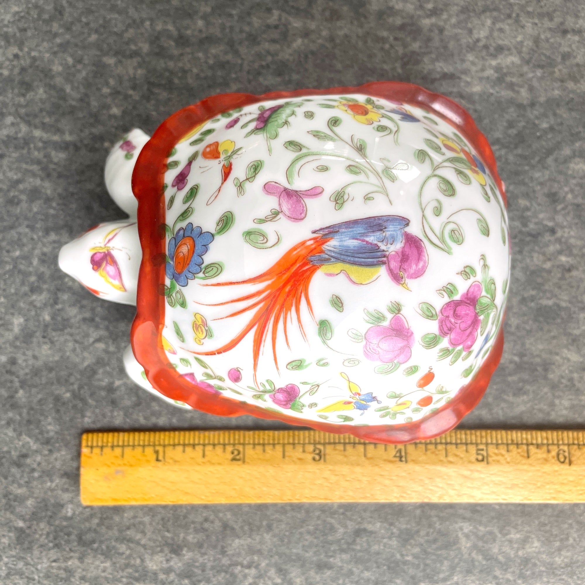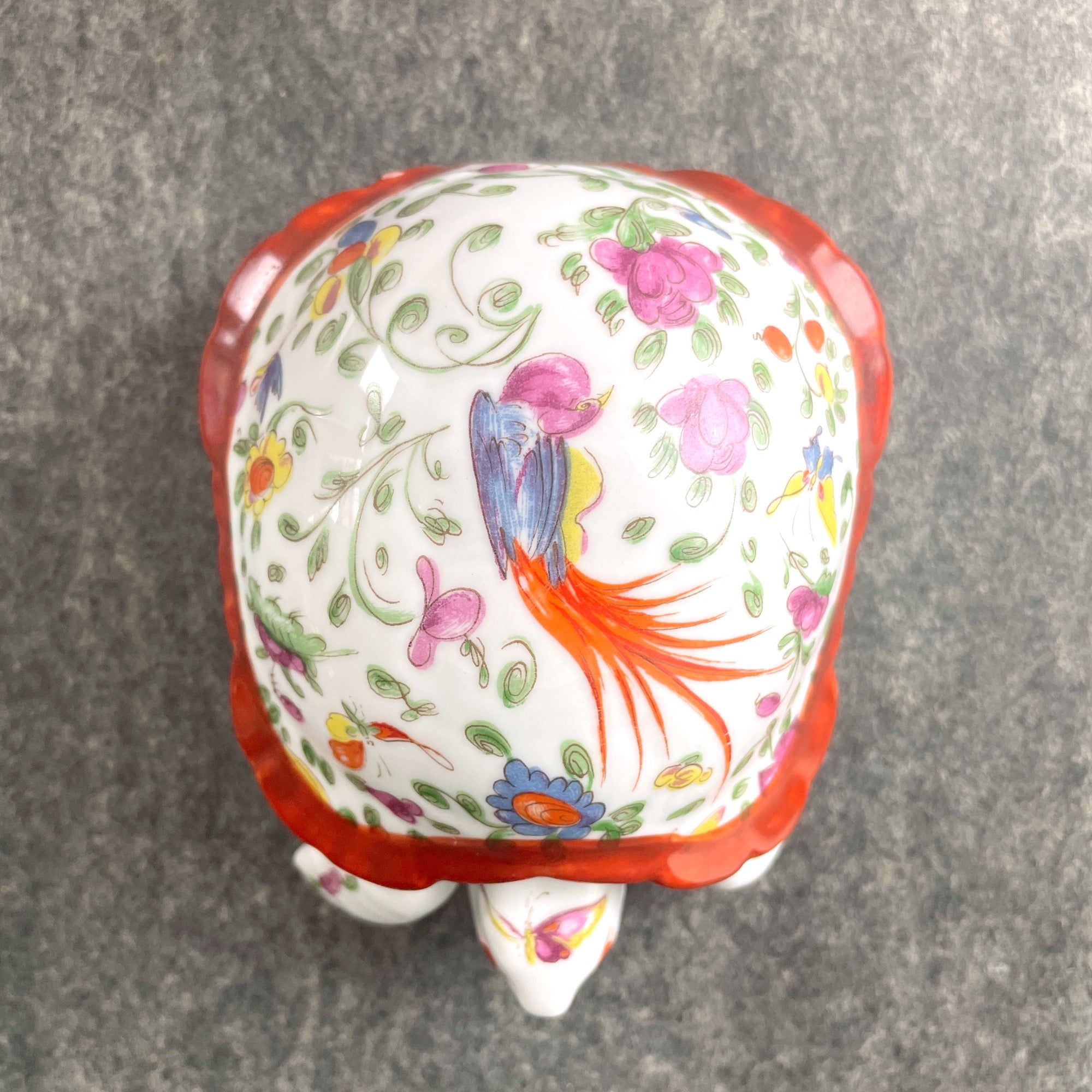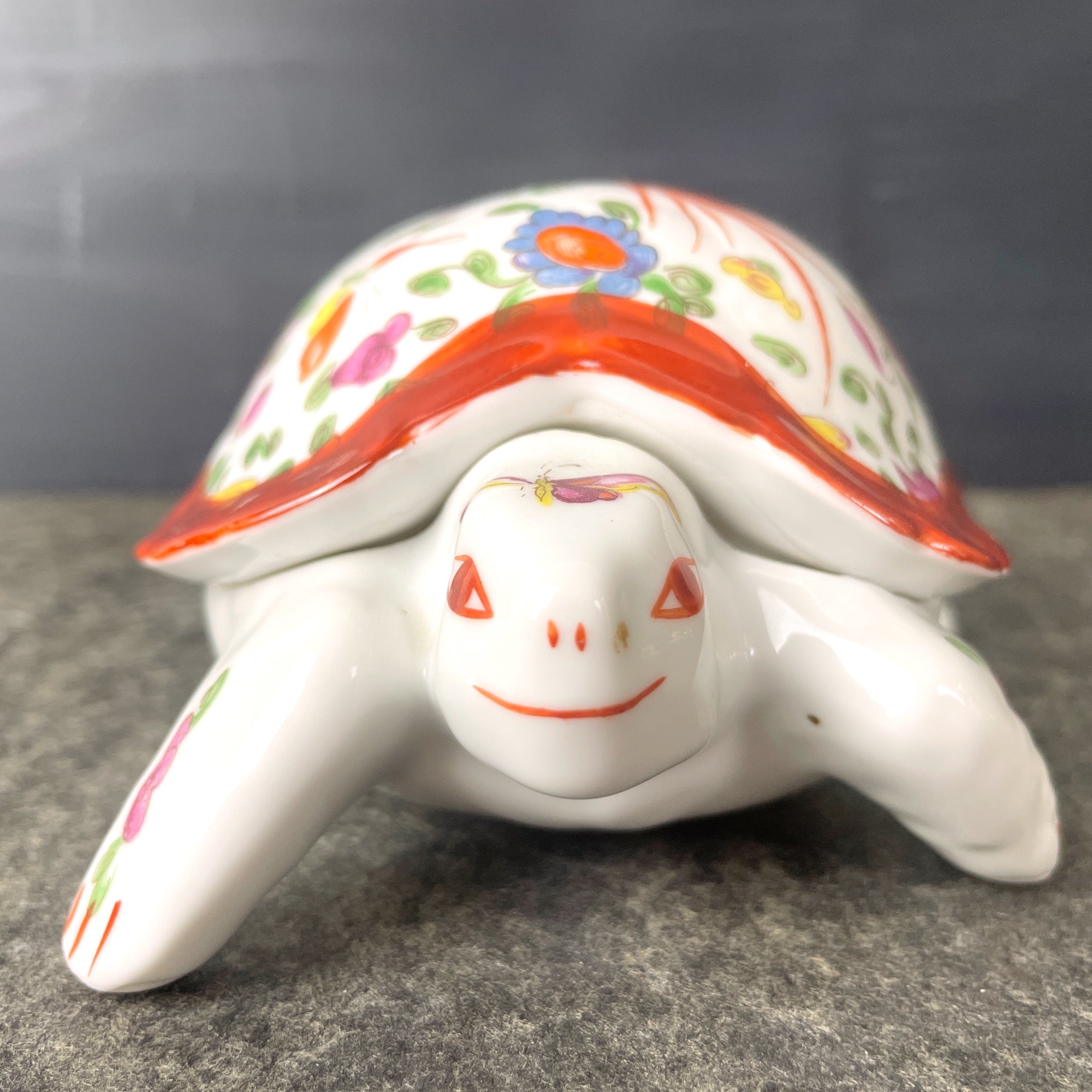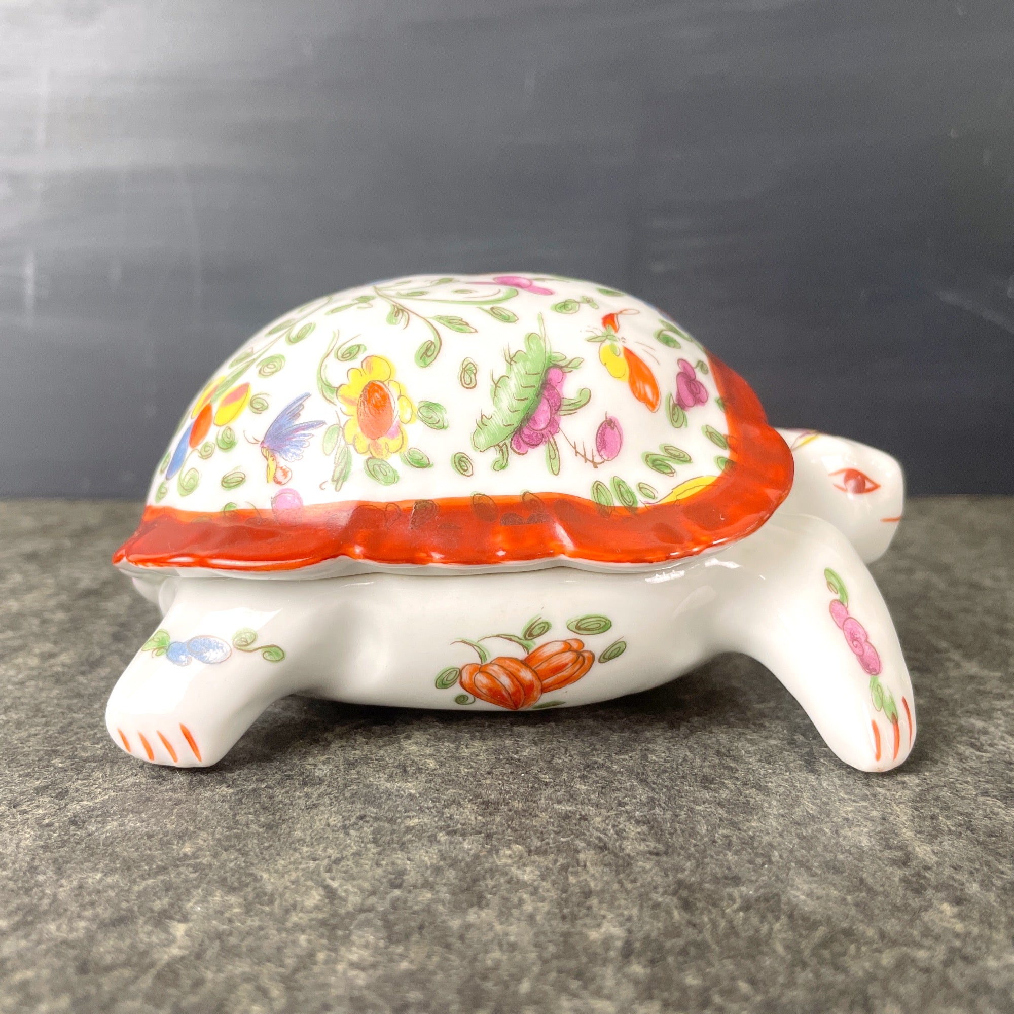 Vintage white turtle trinket box with floral, bird and butterfly decorations, made in Limoges, France by Chamart. Shell lifts off to store jewelry, trinkets or snack size Butterfinger bars.