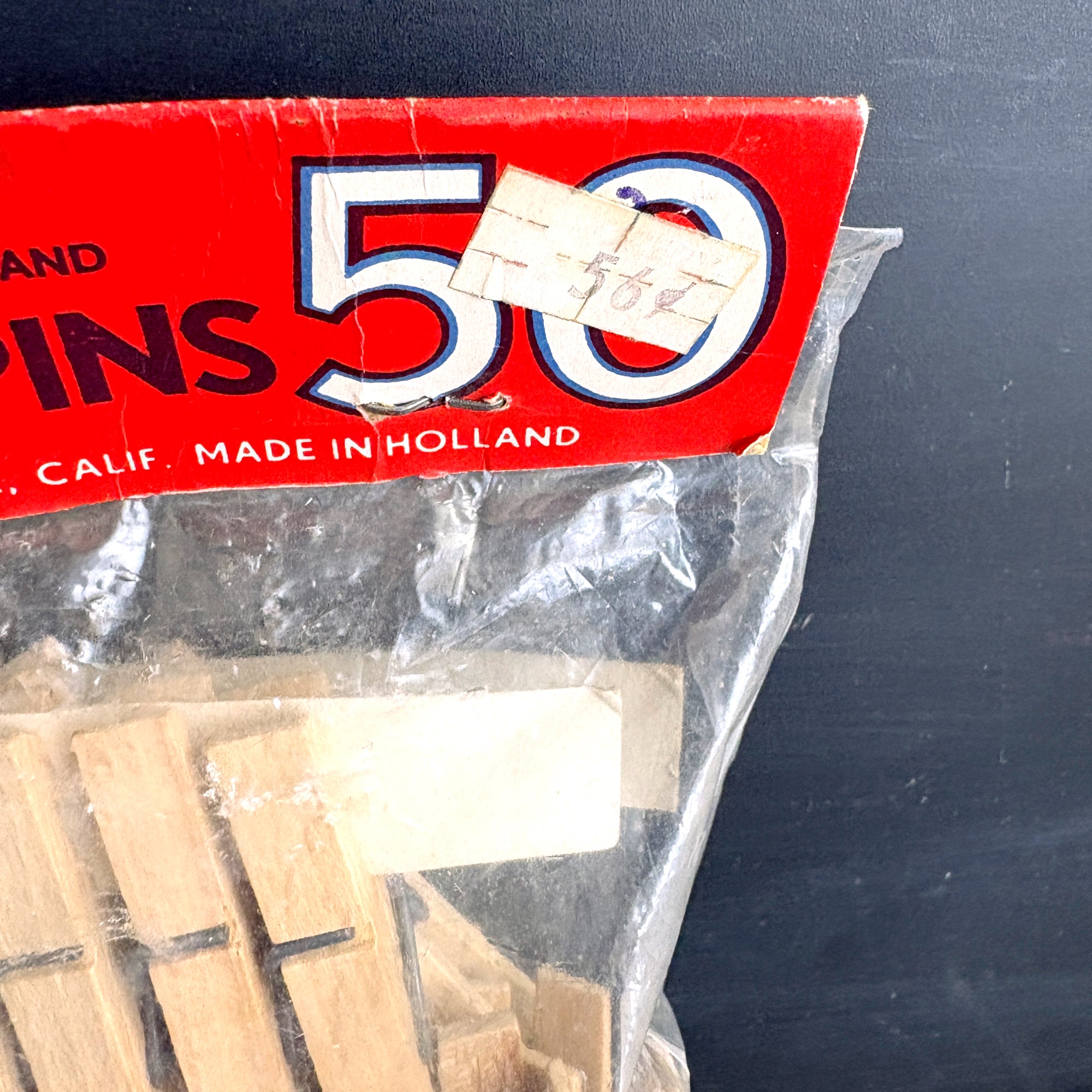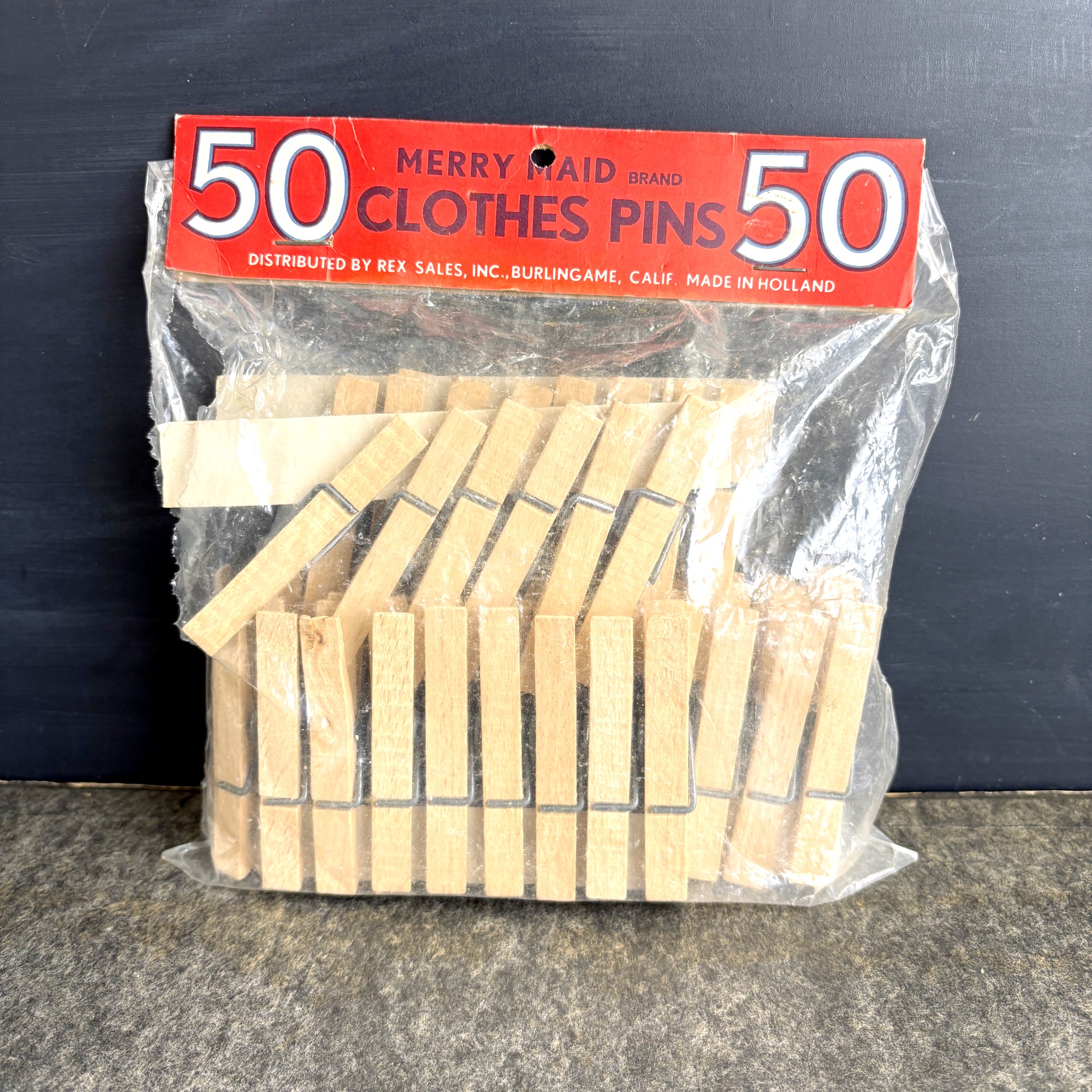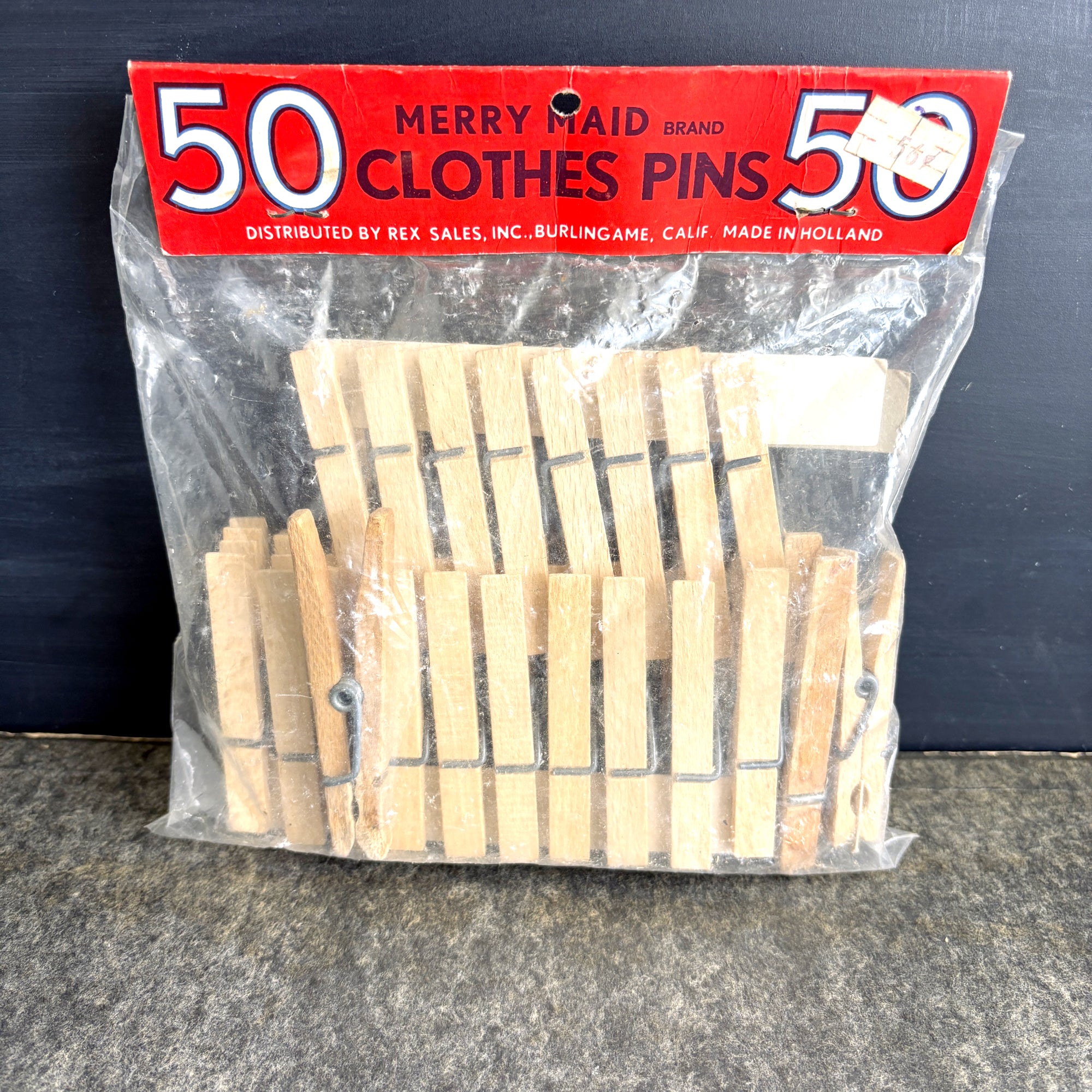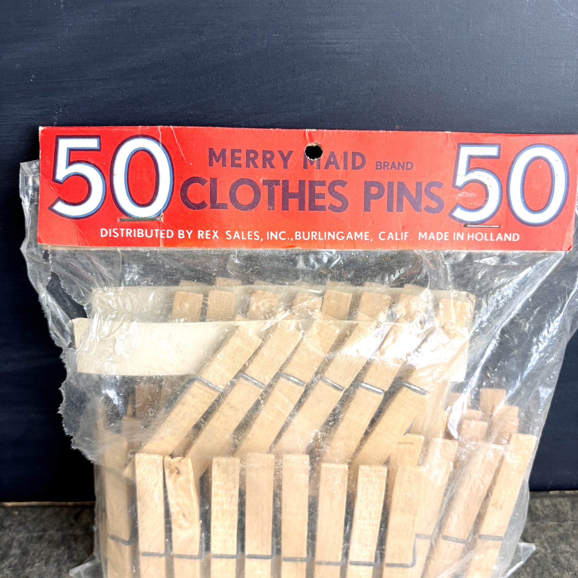 This original package of Merry Maid vintage spring-type clothespins has been opened, and some of the 50 promised have been removed. Every time we count, we get a different number, but there are at least 45. The brand was distributed by Rex Sales, Inc., Burlingame, Calif, and made in Holland. Original price was a bargain at 56¢.