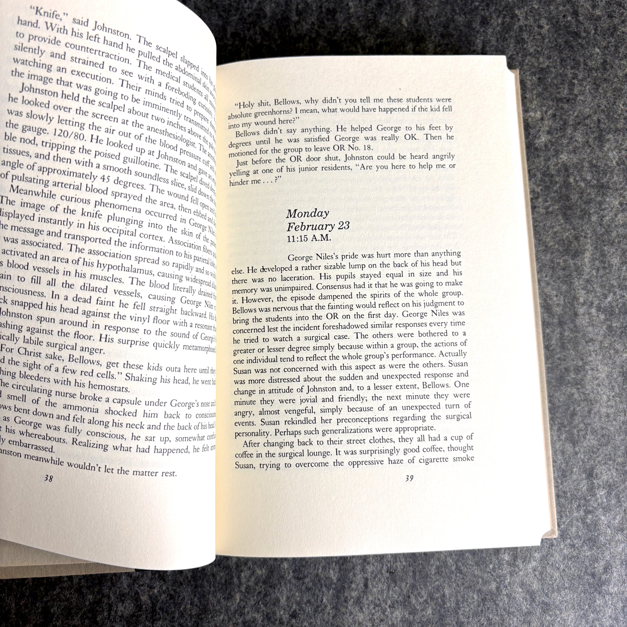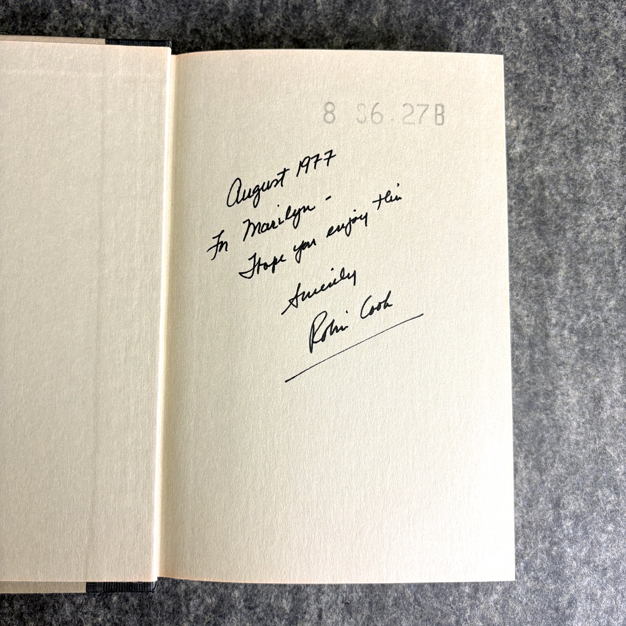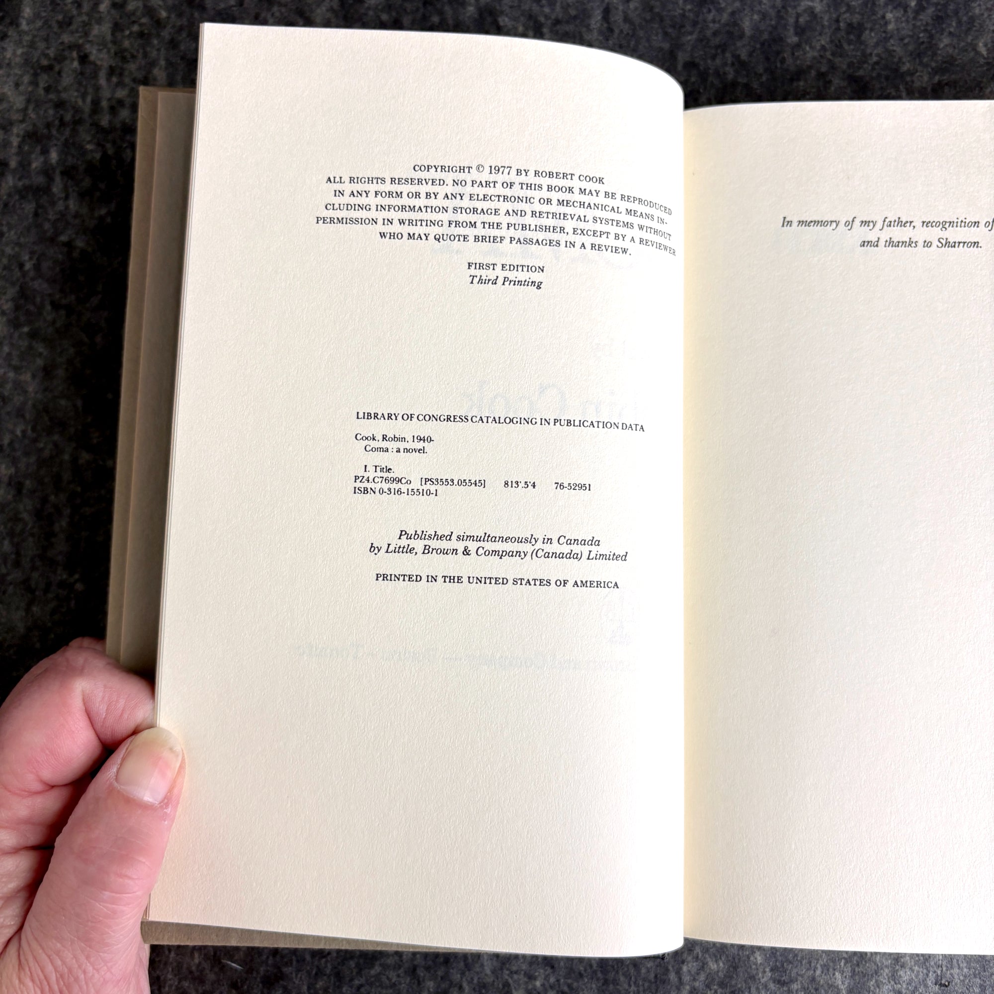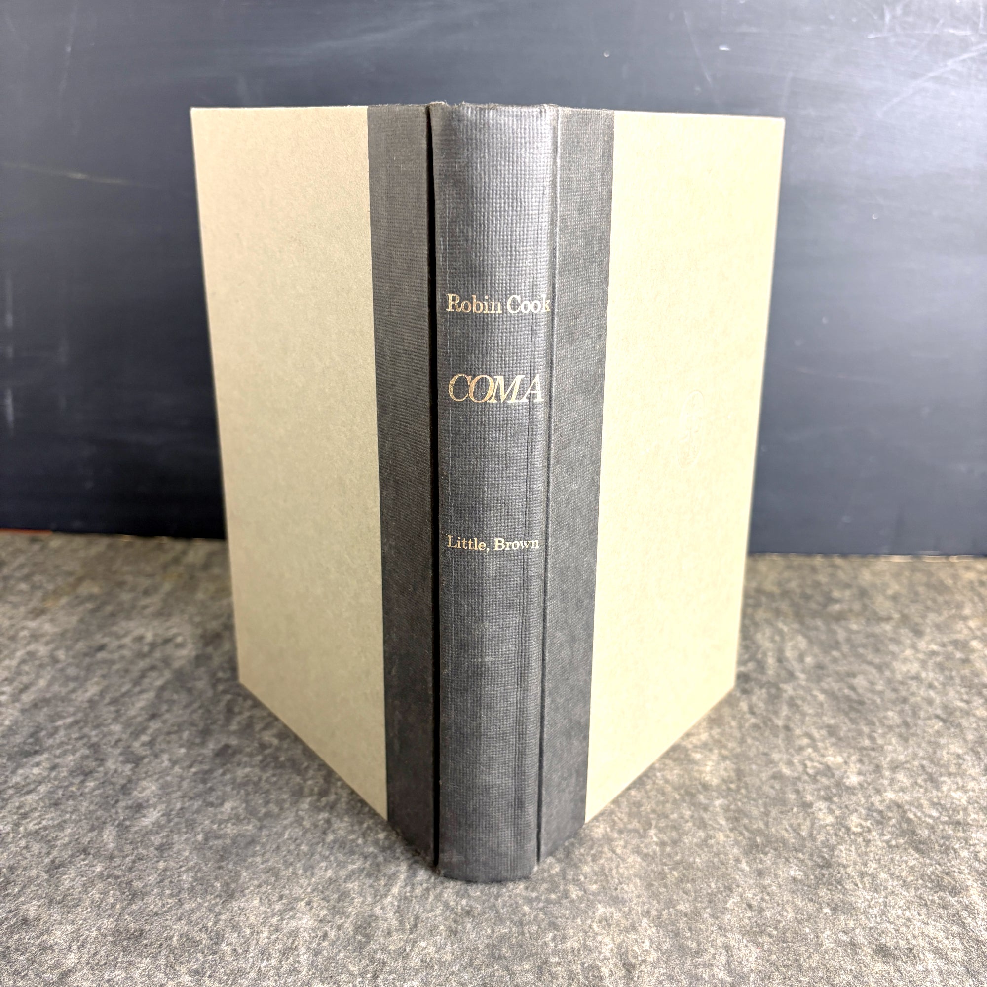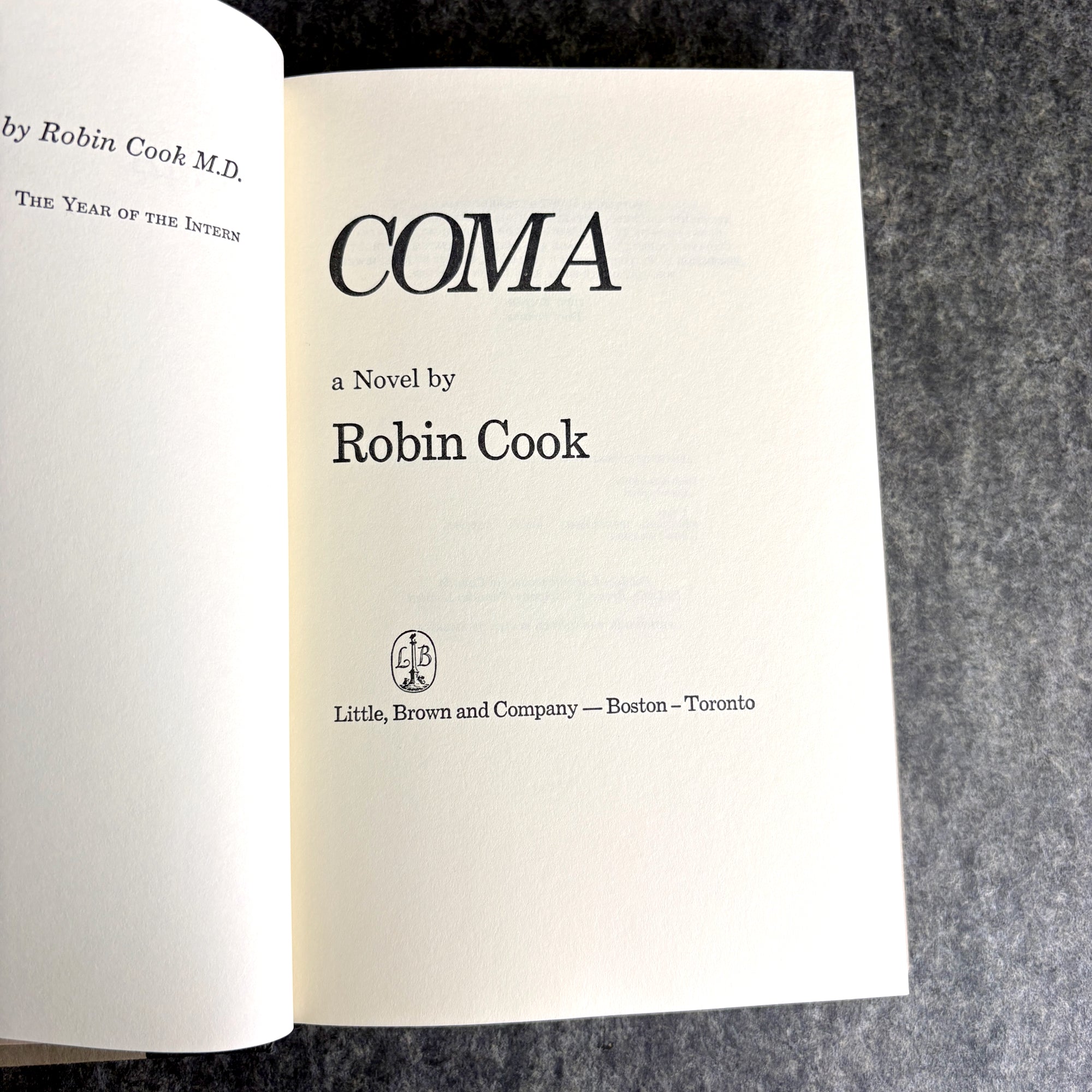 Coma by Robin Cook - 1977 hardcover. Inscribed on the front endpaper. Published by Little Brown & Company. First edition, third printing. Missing the dust jacket.