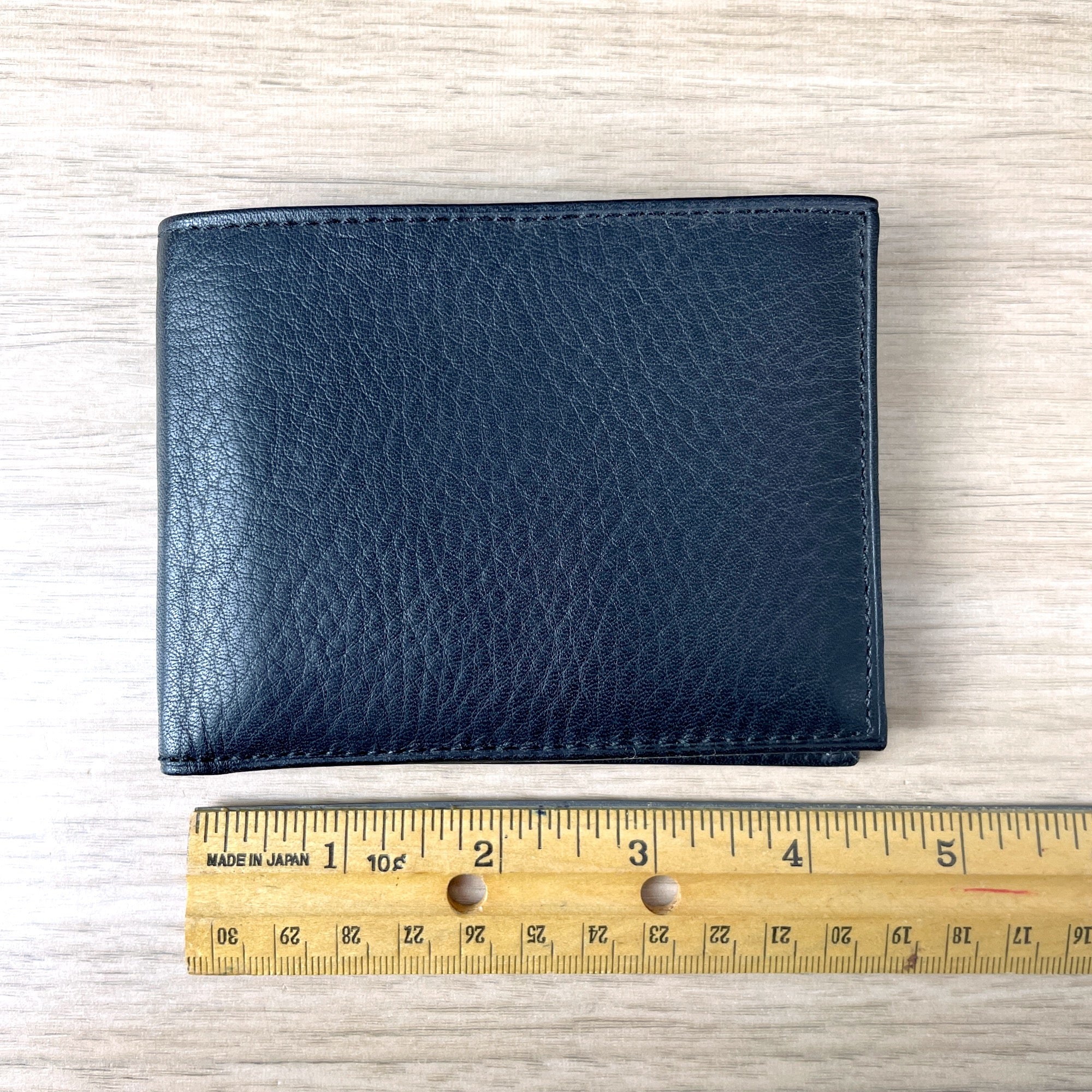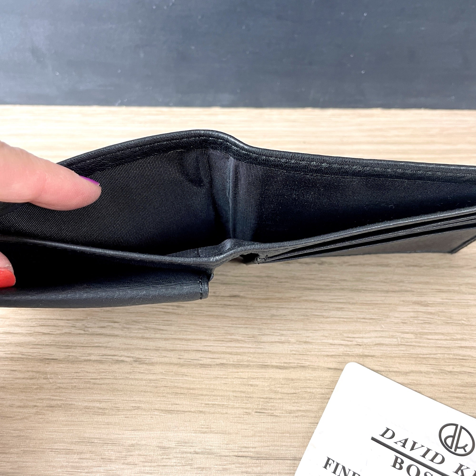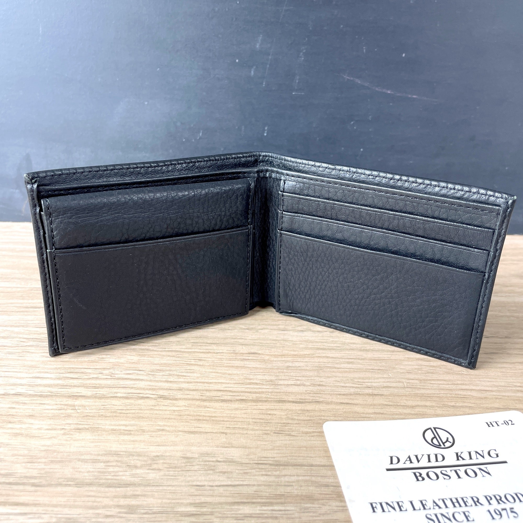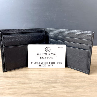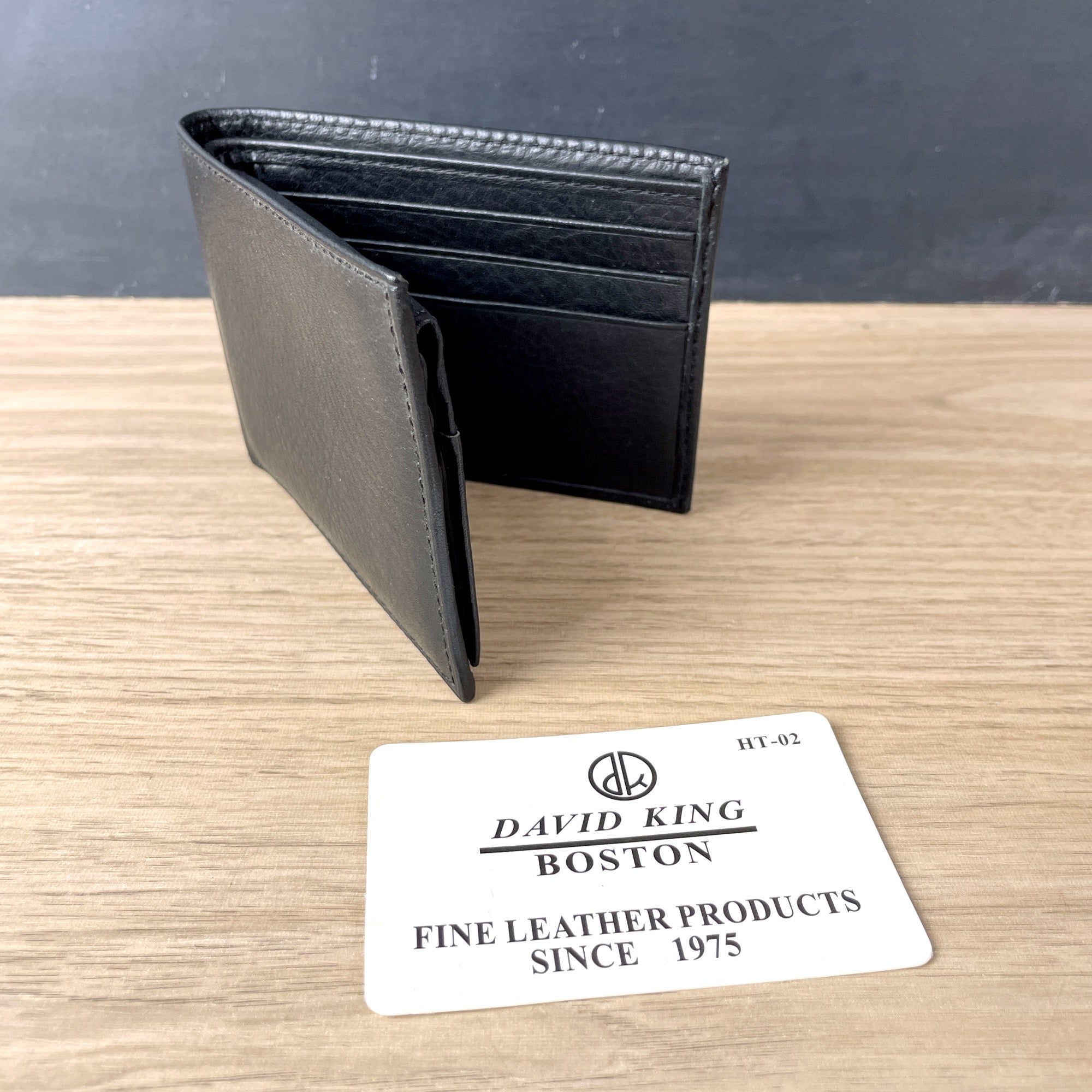 Passcase wallet in black leather, #HT-02, from David King and Co. of Boston, a fine leather goods maker. Bi-fold wallet with flip up ID window, 8 card slots, fully lined. Original card from David King in one of the card slots.